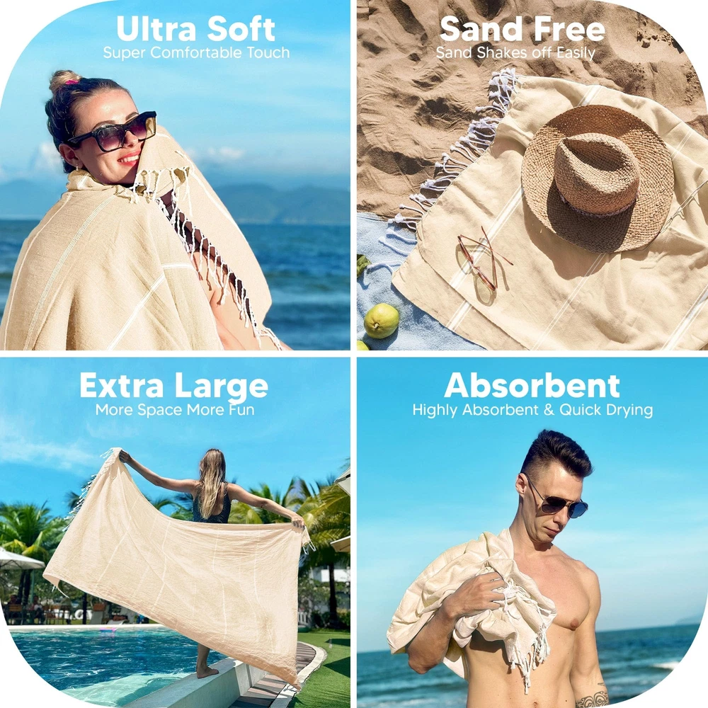 Pack of 2 Turkish Beach Towel, 40 by 72 Inches, Oversized 100% Cotton, Sand Free Lightweight Absorbent Quick-Dry Beach Blanket, Extra Large Turkish Bath Towels for Travel and Pool, Beige Pack of 2 - The set of 2 Turkish Beach Towels measuring 40 x 72 inches each. They are super convenient to use and provide maximum absorbency. Luxurious - Crafted with 100% premium cotton fabric, the large beach towel is designed to soak up more water and is quick to dry. Our lavish towels will leave you with a fresh feeling all day. Stylish, Soft & Compact - Streamline your summer with our quick dry beach towels, as they make an elegant addition to any setting. The towels are acutely soft in touch, super handy and portable. Immensely Practical- The sand free beach towel is highly functional, rolls up neatly to fit in your bag or closet. Perfectly suitable for bathroom use, beach, spa, pool, gym, yoga, travel, camping and other versatile preferences. Care Guide - It is recommended to machine wash the towel before use and line dry for best results. Pack of 2 Turkish Beach Towel (40x72 Inches), Oversized 100% Cotton Sand Free Lightweight Absorbent Quick-Dry Beach Blanket, Extra Large Turkish Bath Towels for Travel (Beige) Shipping We offer FREE shipping on all orders! We ship within Three business days of payment, usually sooner. We use a selection of shipping services such as UPS, FedEx, USPS etc. We only ship to the lower 48 states, no APO/FPO addresses or PO Boxes allowed. Local pickups and combined shipping options are not provided at this time. Return You can return a product for up to 30 days from the date you purchased it. Any product you return must be in the same condition you received it and in the original packaging. Please keep the receipt. Payment We accept payment by any of the following methods: PayPal Please pay as soon as possible after winning an auction, as that will allow us to post your item to you sooner! Feedback Customer satisfaction is very important to us. If you have any problem with your order, please contact us and we will do our best to make you satisfied. Contact Us If you have any queries, please contact us via ebay. We usually respond within 24 hours on weekdays. Please visit our eBay store to check out other items for sale! Thank you for shopping at our store.