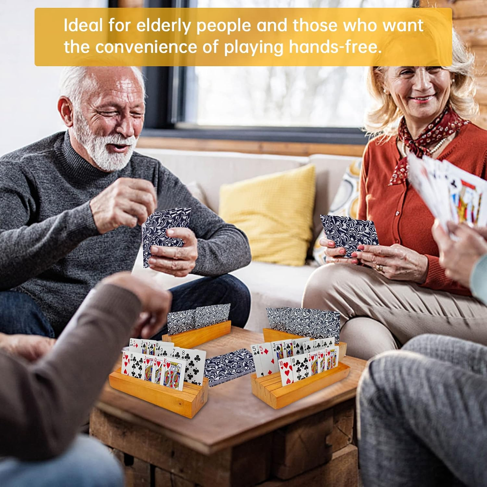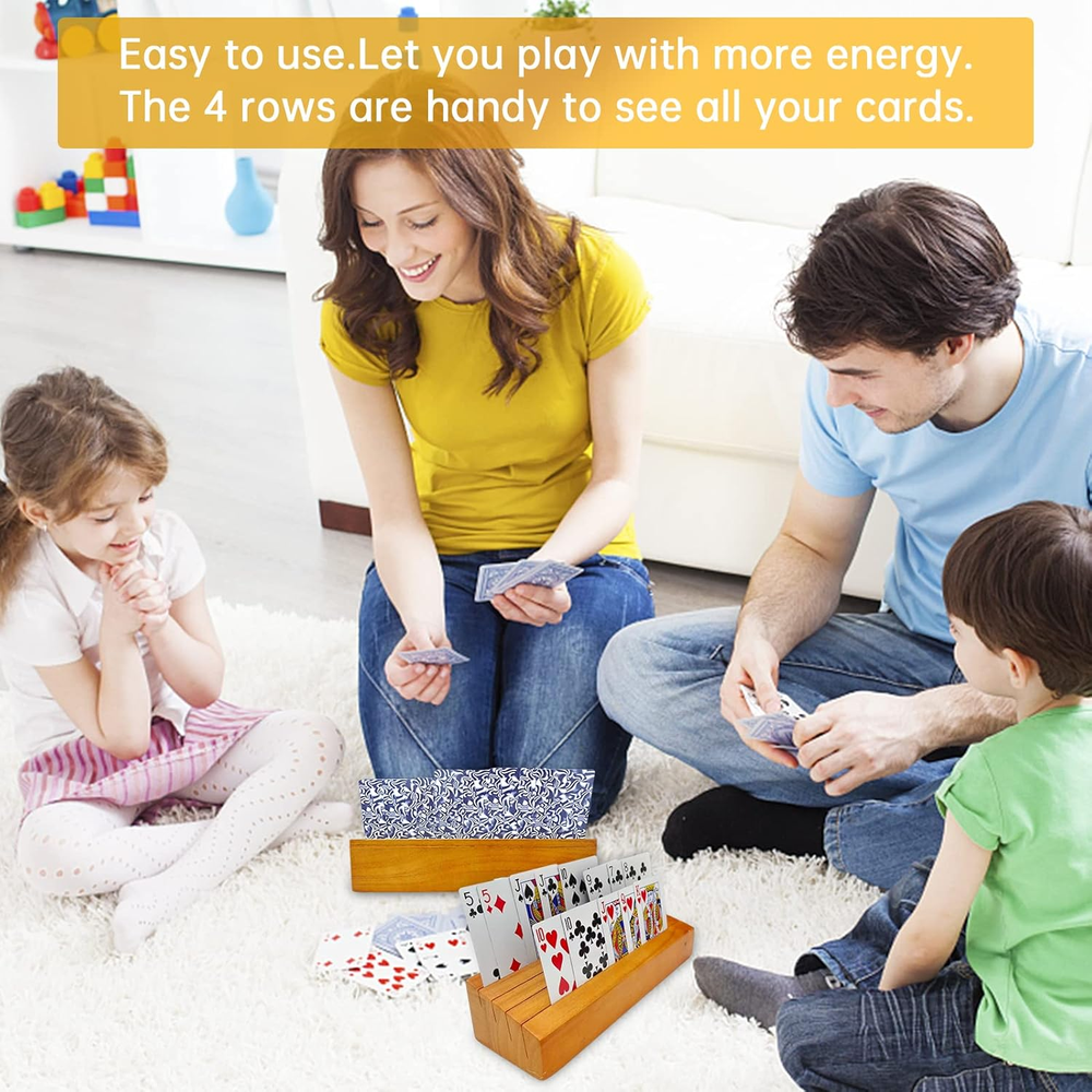 Card Holders for Playing Cards 2 Pack Playing Card Holders: Size: L9.72 x W2.75 x 1.96 inches. High-Quality Playing Card Holder. Easy to use. The 4 rows are handy to see all your cards. Gifts for Card Players, Children, Elderly People. Great for all card games. Card Holder for Playing Cards:Our card holders come with 4 pieces of No-slip EVA mat. You can put the non-slip pad on the bottom to prevent sliding and protect the table.Kids card holders for playing cards. Playing card holders for seniors. Hands-Free & Focus on Game: The 4 rows are handy to see all your cards. Each playing card tray holds up to 40 cards. Playing card holders for adults can make your hands free and focus on the game rather than your tired hand. Makes playing cards so much easier. Suit for the Elderly and Children Playing Card Display: It's difficult for children to organize or slip cards in and out of their hands. Our kids playing card holder can solve this problem. This playing card holders for seniors help both children and arthritic hands hold the cards. A Good Gift Choice Playing Card Display: Looking for the perfect gift for a parent, grandparent, or older adult on your list? Our card tray racks are a gift of warmth. We offer 30 days' money back and if you have any issues with our playing card holder, please contact us and we will make things right within 24 hours. Product Description Card holders for playing cards 2 pack playing card holders Do you enjoy the time you get to spend playing card games with your family? Consider investing in playing card holders so that you can better organize the hand you are dealt while playing poker or other card games. The 4 rows are handy to see all your cards. Each playing card tray holds up to 40 cards. Playing card holders for adults can make your hands free and focus on the game rather than your tired hand. Playing card holder makes card playing much easier! The best gifts for any and every card player Looking for the perfect gift for a parent, grandparent, or older adult on your list?With this playing cards holder, you can make your hands free and focus on the game rather than your tired hand.Playing card holder is a great gift for kids, seniors, or people may difficultly holding cards. Our card tray racks are a gift of warmth.