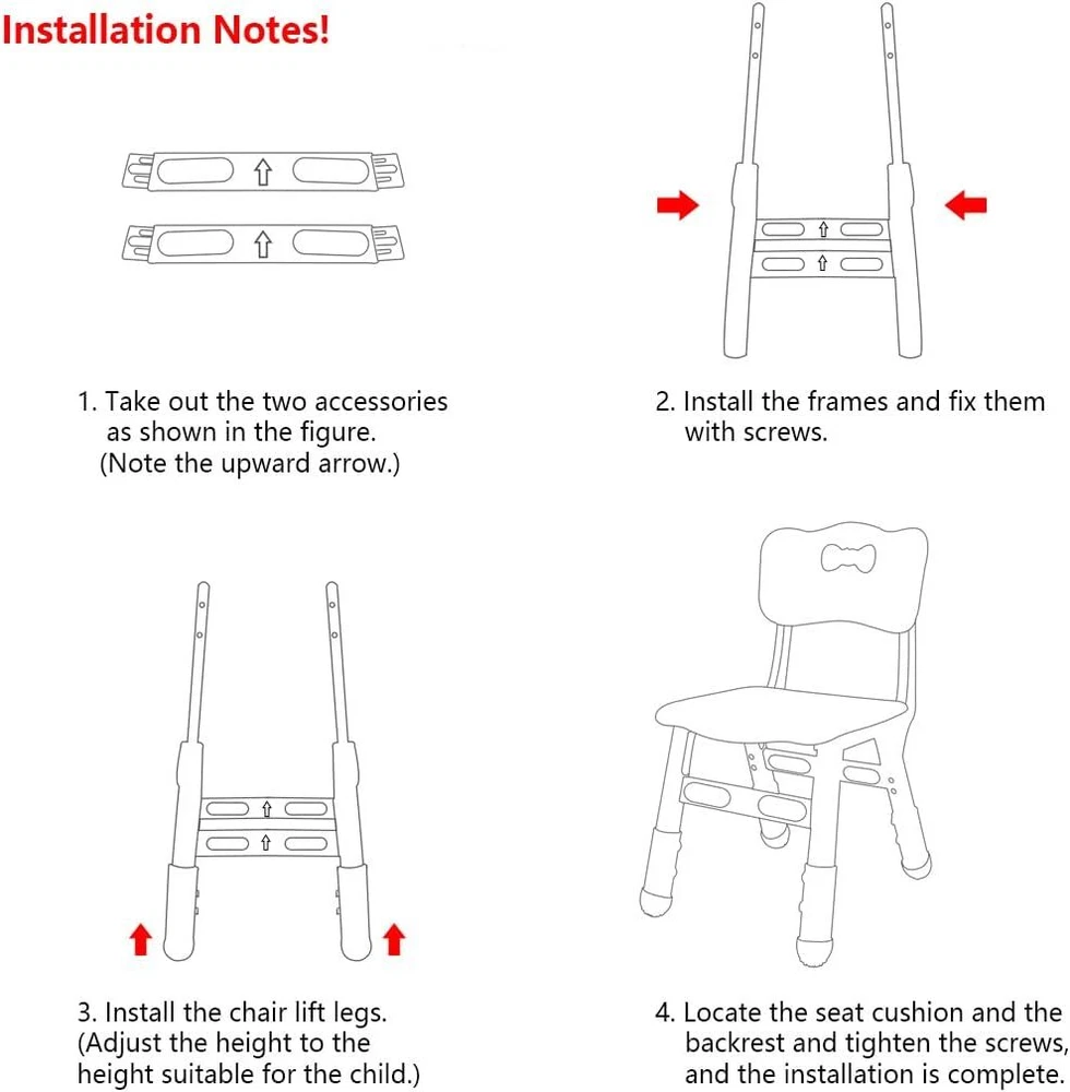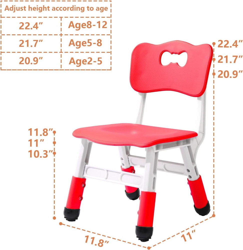 Product Description Adjustable Kid Chairs Indoor 3 Level Adjustable Suitable for Children Age 2-6. Maximum load-bearing 220LBS Suitable for Family Classroom and Nursery Child Seat Set (2-Pack-Red) 【Durable and strong】 Our children's chairs are made of high-quality polypropylene. Polypropylene material will not crack, chip or peel even if it is used for a long time. In addition to being sturdy, they are surprisingly light, with soft rounded corners and easy to move around the room. 【Protect children's spine】 The activity chair is specially designed for children. We strictly follow the design and manufacture of children's ergonomics. The curved and breathable backrest ensures the development of the spine, and is not tired after sitting for a long time. It is suitable for daily use. 【reinforcement and antiskid】: We equipped a chair with 4 non-slip foot covers, which are not easy to scratch the floor. The chair is very light, and children can use it in the living room, bedroom, classroom, yard, etc. 【Activity Chair】 The height of the chair can be adjusted to 20.9in, 21.7in, 22.4in (level 3) to adapt to growing children, and the height can be easily adjusted with a + screwdriver to adapt to growing children. 【Easy to clean and store】: Since the surface of our chair is waterproof, you only need to wipe it lightly with a wet towel to remove stains, which is very convenient. In addition, due to the small size of our chairs, you can fold them together to ensure your space and very convenient storage. About Us We are a reputable seller with many years of experience selling on eBay. Our goal is to provide high-quality products and excellent customer service. Payment 1.We accept PayPal only. 2.All major credit cards are accepted through secure payment processor PayPal. 3.Payment must be received within 7 business days of auction closing. 4.We ship to your eBay or Paypal address. Please make sure your eBay and Paypal address is correct before you pay. Feedback will be left automatically after we receive your feedback. Please contact us before leaving a Negative feedback or Neutral feedback. We would try our best to help you solving any problem. Shipping Items will be shipped within 1-3 business days when we received payment. (Orders are not processed on weekends & holidays) Tracking information will be sent once item is shipped. Delivery time depends on destination and other factors Item is shipped to ebay address. Leaving correct address can minimize delay. For international shipping and shipping to Guam, Hawaii and Alaska, Please contact us before placing the order. International buyers please note: Import duties, taxes and charges are not included in the item price or shipping charges. These charges are buyer’s responsibility. We will try our best to reduce the risk of the custom duties. Local pick-up is unavailable at the moment. Returns For any issues with Defects, Return, Item Exchange request, please contact us first and send us a message first before opening any type of case or request. We devote ourselves making EVERY CUSTOMER in 100% Satisfactory and resolve any problem. We highly value and appreciate your business. Thank you. No returns will be accepted without an RMA number. Please contact us for the RMA number. Return is acceptable within 30 days of delivery. Return for replacement or money back is optional. Returned items must be in the brand new, unaltered and resalable condition. Seller is not responsible for any labor cost, expense in a dealer store, or damage due to wrong installation. Contact Us We reply any email messages within 1 business / working days(off-duty at weekend). If you do not get a response from us, then please check your junk or spam mailbox. Our Business hours: Mon-Fri 9:00-18:00, UTC/GMT +8 hour s . Please contact us either by clicking "contact seller" in the "purchase history" section or simply click "ask a question" at the bottom of this page. If you are unsatisfied with our item or service, please contact us before leaving any feedback. We are committed to resolve all issues in a friendly and satisfactory manner. To provide you with better service, please provide the following information in your email: Your ebay ID Order problem, order number For product questions, the eBay article number, the product URL or the product SKU Unfortunately, the eBay guidelines do not allow us to provide a phone number. But if you'd rather call please send us an email.