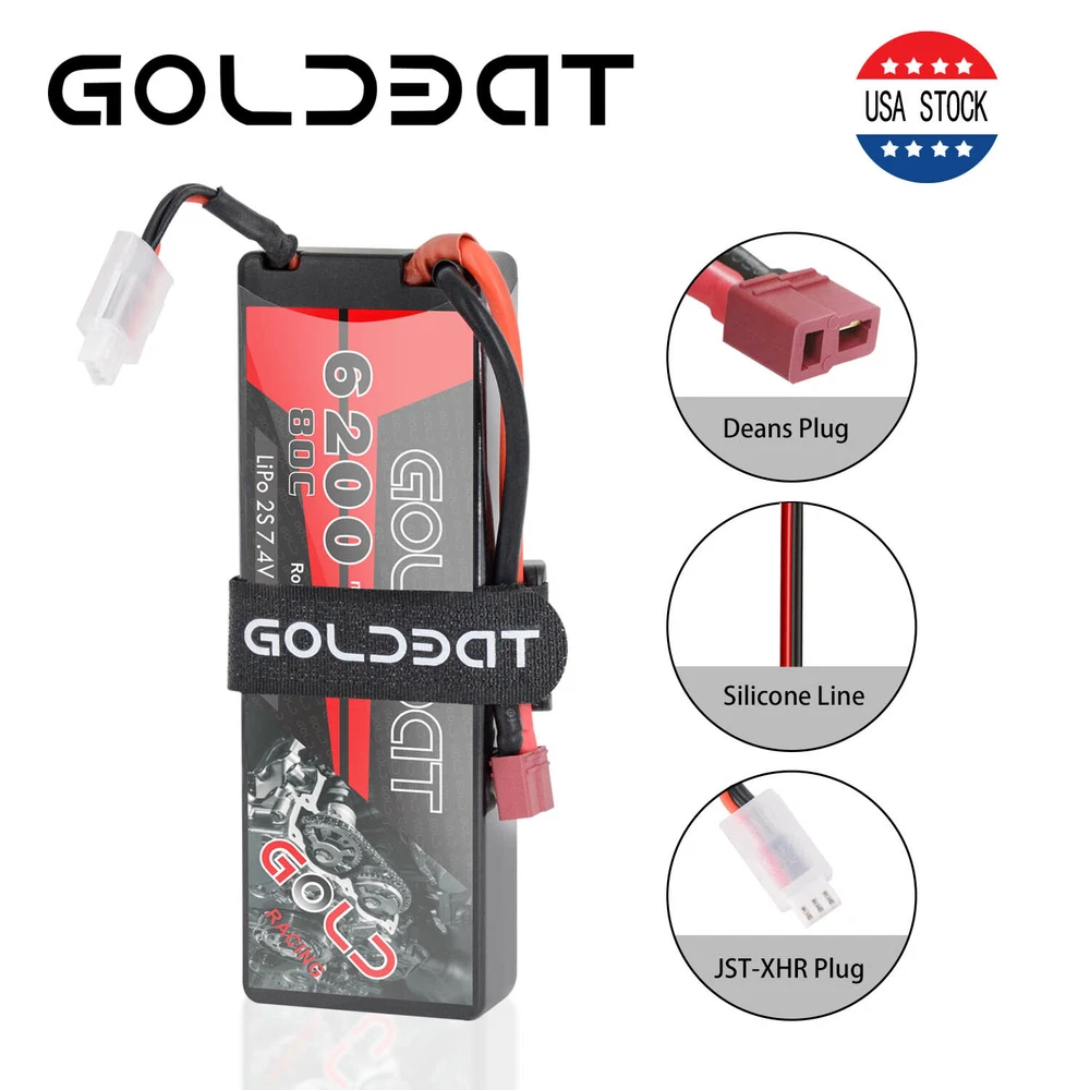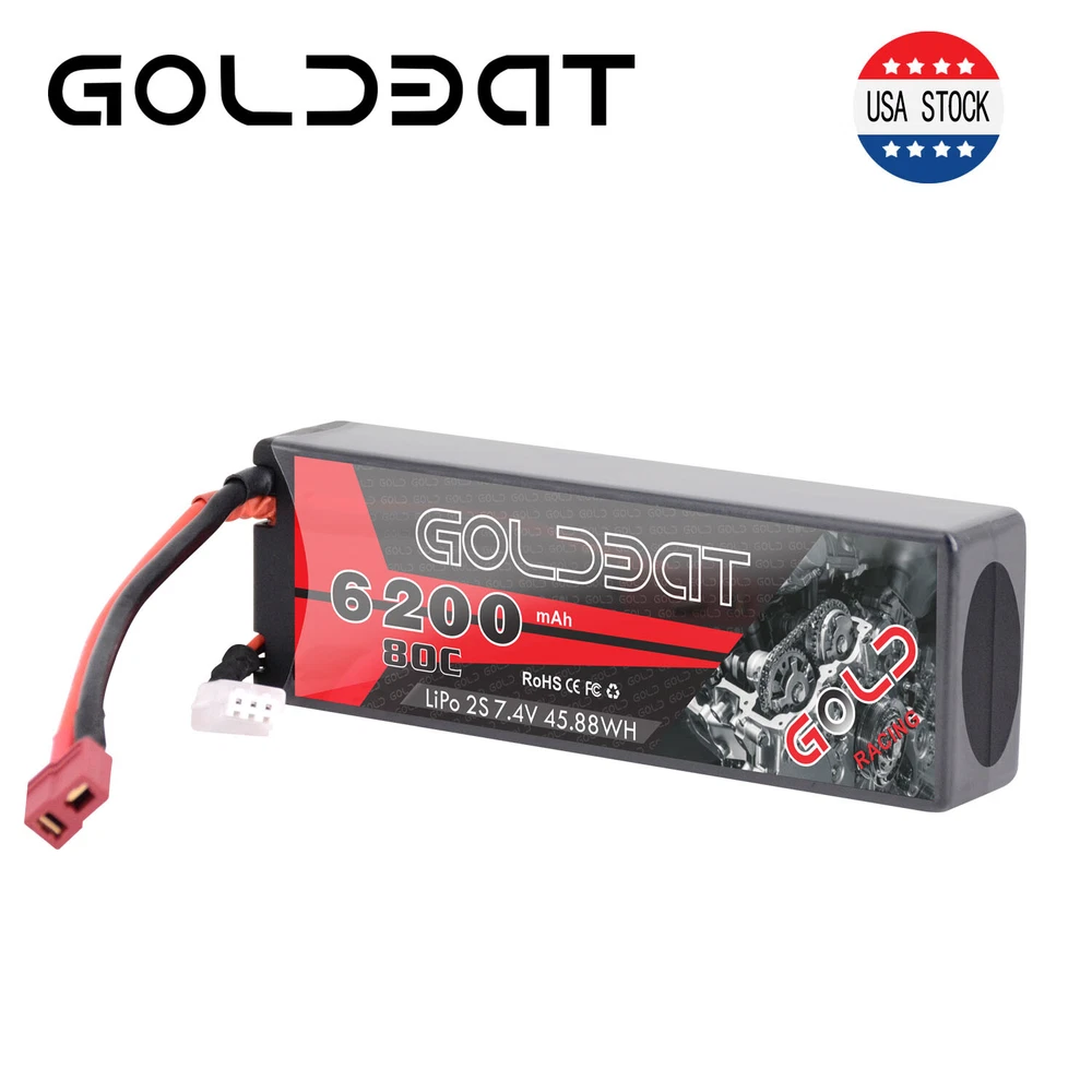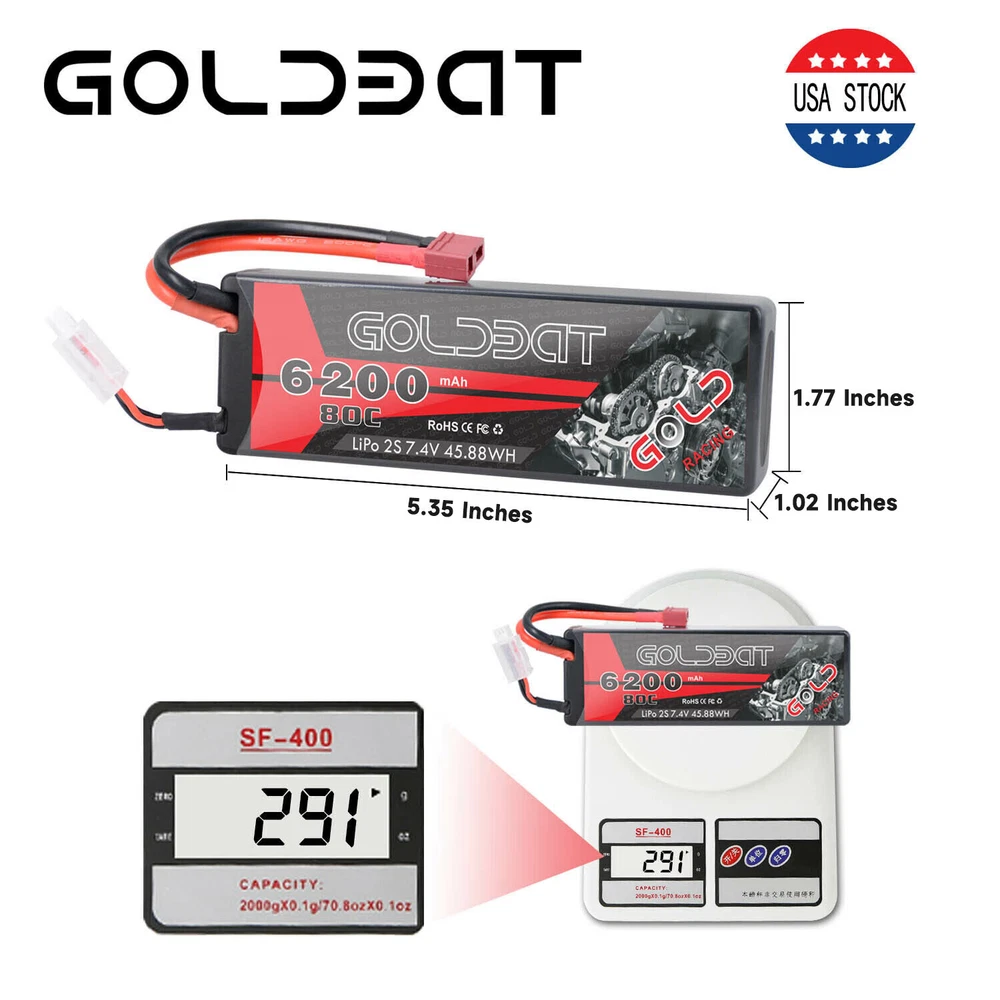 5200mAh 80C 7.4V RC 2S Lipo Battery Traxxas Plug Hardcase For Car Truck Buggy 16.99 USD Free shipping 2X 80C 5200mAh 7.4V RC 2S Lipo Battery Deans Plug Hard case For Car Truck Buggy 37.32 USD Free shipping 50C 2S 5200mAh 7.4V Lipo Battery Hardcase Deans Plug for RC Car Truck Buggy Boat 16.99 USD 24.27 USD Free shipping 30% off 4X 5200mAh 80C 7.4V 2S LiPo Battery Hardcase Deans for RC Car Truck Truggy Boat 61.59 USD 87.99 USD Free shipping 30% off 2pcs 5200mAh 50C 7.4V LiPo Battery 2S Deans Plug Hardcase for RC Car Truck Boat 39.0 USD Free shipping 2S Lipo Battery 5200mAh 7.4V 80C Hard Case Battery Deans Plug for RC Car Boat 16.99 USD Free shipping 2S LiPo Battery 5200mAh 7.4V 50C Hardcase Deans Plug for RC Car Truck 4Packs 64.4 USD 92.0 USD Free shipping 30% off Product Description 2X 80C 6200mAh 7.4V RC 2S Lipo Battery Pack Deans Plug For Car Truck Buggy Boat Product Details: · Brand: Golden · Capacity(mAh): 6200mAh · Voltage(V): 7.4V · Discharge Rate (C): 80C · Configuration: 2S · Net Weight(dev.20g): 318g · Length(dev.5mm): 135mm · Width(dev.2mm): 45mm · Height(dev.2mm): 26mm · Connector Type: Deans Plug · Wire Gauge: AWG12# · Wire Length(mm): 118mm · Balancer Connector Type: JST-XHR Compatible For: GOLDBAT 2s 6200mah Lipo battery specially designed for 1/8 and 1/10 rc car, Losi, Traxxas Slash, HPI Strada XB 1/10 RTR Electric Buggy, Team Associated, Axial, Tamiya, Duratrax, Jammin, Redcat Racing, Exceed RC, ElectrixRC, Emaxx, Bandit, Rustler version((Only if the voltage, dimension and the plug match, then it will fit). NOTICE · Please read the instruction carefully before using or charging the battery. · Check carefully the battery condition about the battery surface and battery voltage before using or charging. · Use professional lipo battery charger ONLY. · Any issues about the battery, please contact us for a better service What in the box: 2 x 6200mAh RC battery About Us Payment Shipping Return & Warranty Feedback GOLDBAT is one of the best lithium batteries brand who focus on providing speed and power for RC cars, drones, UAV, FPV and other RC products. We are manufacturer on our own. Having a professional and leading batteries factory development, production and sales of lipo batteries in Shenzhen China. With safe and steady formula of Japan and Korea lithium polymer raw material, superb pairing technology, smooth and steady discharge curve and rigorous scientific quality control system, GOLDBAT batteries offer the excellent value by supplying factory direct price and grade A quality for you and your RC products. 1.We accept PayPal only. 2. NOTE : Payment should be sent within 4 (FOUR) days of auction closing. Or unpaid dispute will be filed for closing auction. 1.We ship to your eBay or Paypal address. Please make sure your eBay and Paypal address is correct before you pay. 2.Items will be shipped within 1-3 business day when we received payment. 3.Delivery time depends on destination and other factors. 4.You will get the item whitin 3-13 business day after it is be shipped. 5.If you have any problem , pls contact us firstly, we will try our best to solve it. 1.Our items come with 60-Day warranty. 2.Our warranty does not extended to any products that are physically damaged or that are not under normal operating conditions as a result of misuse or improper installation on the buyer/user's part. 3.This product comes with 30-Day Money Back Guarantee. 4.We stand behind every product we sell. If you're not pleased with your purchase, we'll be happy to make an exchange or refund. 1. We value your feedbacks, please leave your feedback and comment. 2. We will automatically leave positive feedback to every buyer who completed the transaction and left positive feedback to us. 3. Your better comments will be an encouragement for us to offer the better quality and the better service in future. 4.If you have any problem , pls contact us , we will try our best to help you to solve it. About Us GOLDBAT is one of the best lithium batteries brand who focus on providing speed and power for RC cars, drones, UAV, FPV and other RC products. We are manufacturer on our own. Having a professional and leading batteries factory development, production and sales of lipo batteries in Shenzhen China. With safe and steady formula of Japan and Korea lithium polymer raw material, superb pairing technology, smooth and steady discharge curve and rigorous scientific quality control system, GOLDBAT batteries offer the excellent value by supplying factory direct price and grade A quality for you and your RC products. Payment 1.We accept PayPal only. 2. NOTE : Payment should be sent within 4 (FOUR) days of auction closing. Or unpaid dispute will be filed for closing auction. Shipping 1.We ship to your eBay or Paypal address. Please make sure your eBay and Paypal address is correct before you pay. 2.Items will be shipped within 1-3 business day when we received payment. 3.Delivery time depends on destination and other factors. 4.You will get the item whitin 3-13 business day after it is be shipped. 5.If you have any problem , pls contact us firstly, we will try our best to solve it. Return & Warranty 1.Our items come with 60-Day warranty. 2.Our warranty does not extended to any products that are physically damaged or that are not under normal operating conditions as a result of misuse or improper installation on the buyer/user's part. 3.This product comes with 30-Day Money Back Guarantee. 4.We stand behind every product we sell. If you're not pleased with your purchase, we'll be happy to make an exchange or refund. Feedback 1. We value your feedbacks, please leave your feedback and comment. 2. We will automatically leave positive feedback to every buyer who completed the transaction and left positive feedback to us. 3. Your better comments will be an encouragement for us to offer the better quality and the better service in future. 4.If you have any problem , pls contact us , we will try our best to