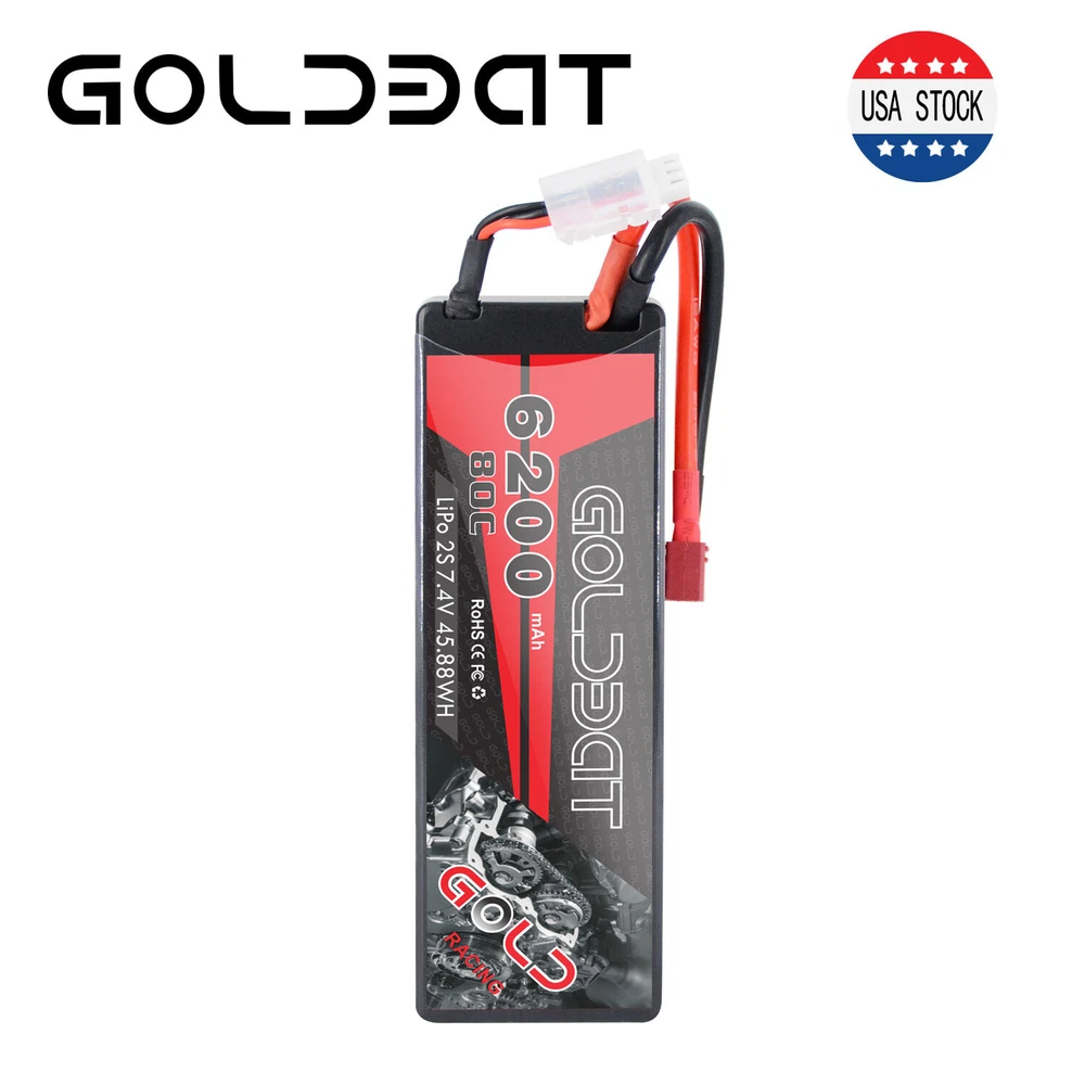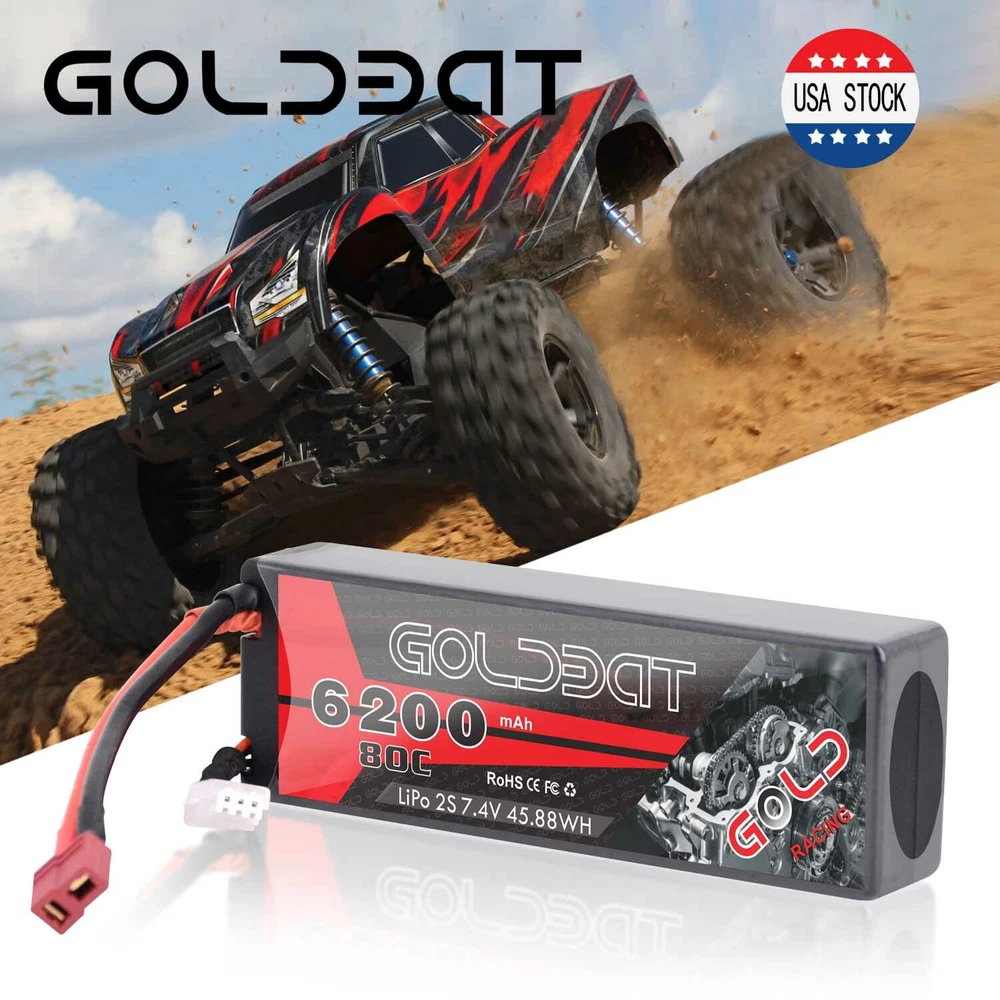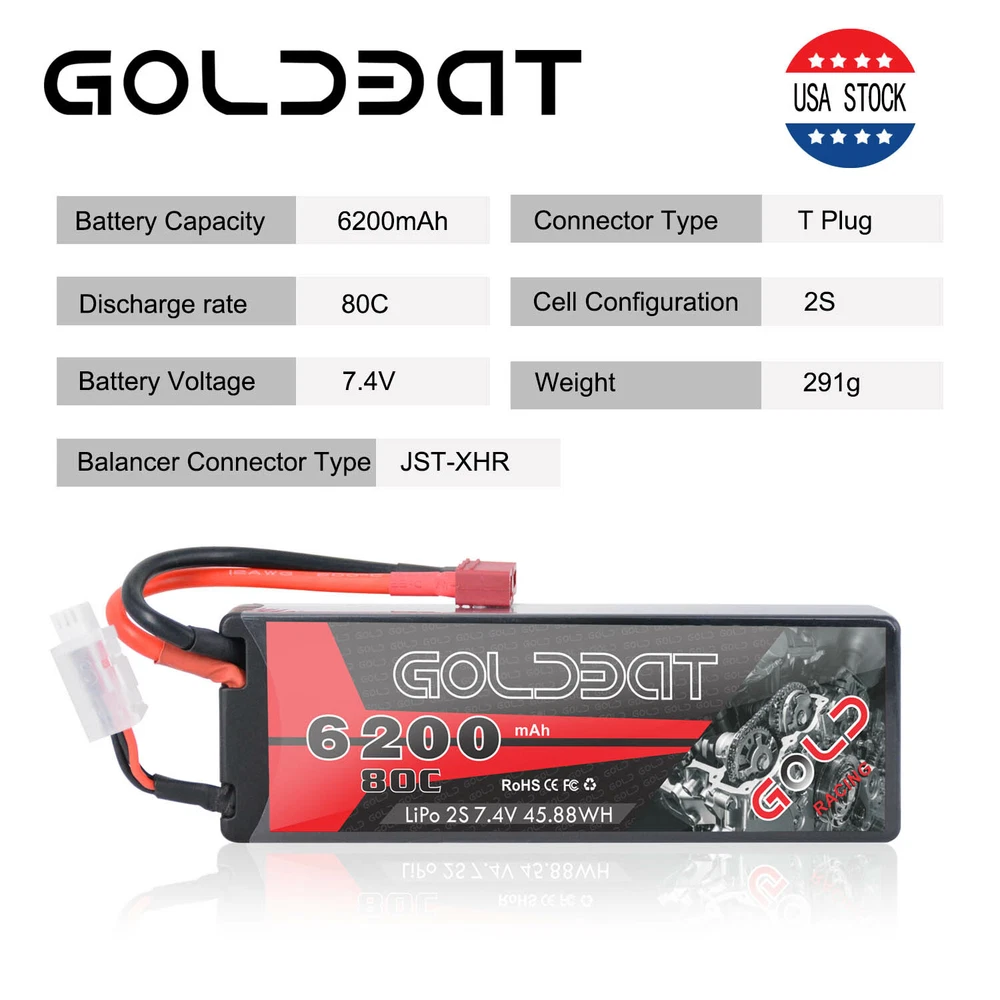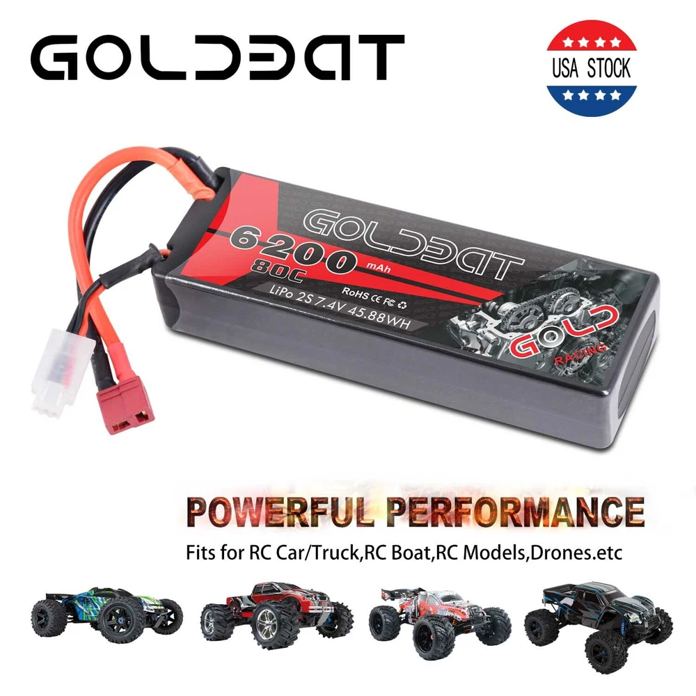 5200mAh 80C 7.4V RC 2S Lipo Battery Traxxas Plug Hardcase For Car Truck Buggy 16.99 USD Free shipping 2X 80C 5200mAh 7.4V RC 2S Lipo Battery Deans Plug Hard case For Car Truck Buggy 37.32 USD Free shipping 50C 2S 5200mAh 7.4V Lipo Battery Hardcase Deans Plug for RC Car Truck Buggy Boat 16.99 USD 24.27 USD Free shipping 30% off 4X 5200mAh 80C 7.4V 2S LiPo Battery Hardcase Deans for RC Car Truck Truggy Boat 61.59 USD 87.99 USD Free shipping 30% off 2pcs 5200mAh 50C 7.4V LiPo Battery 2S Deans Plug Hardcase for RC Car Truck Boat 39.0 USD Free shipping 2S Lipo Battery 5200mAh 7.4V 80C Hard Case Battery Deans Plug for RC Car Boat 16.99 USD Free shipping 2S LiPo Battery 5200mAh 7.4V 50C Hardcase Deans Plug for RC Car Truck 4Packs 64.4 USD 92.0 USD Free shipping 30% off Product Description 2X 80C 6200mAh 7.4V RC 2S Lipo Battery Pack Deans Plug For Car Truck Buggy Boat Product Details: · Brand: Golden · Capacity(mAh): 6200mAh · Voltage(V): 7.4V · Discharge Rate (C): 80C · Configuration: 2S · Net Weight(dev.20g): 318g · Length(dev.5mm): 135mm · Width(dev.2mm): 45mm · Height(dev.2mm): 26mm · Connector Type: Deans Plug · Wire Gauge: AWG12# · Wire Length(mm): 118mm · Balancer Connector Type: JST-XHR Compatible For: GOLDBAT 2s 6200mah Lipo battery specially designed for 1/8 and 1/10 rc car, Losi, Traxxas Slash, HPI Strada XB 1/10 RTR Electric Buggy, Team Associated, Axial, Tamiya, Duratrax, Jammin, Redcat Racing, Exceed RC, ElectrixRC, Emaxx, Bandit, Rustler version((Only if the voltage, dimension and the plug match, then it will fit). NOTICE · Please read the instruction carefully before using or charging the battery. · Check carefully the battery condition about the battery surface and battery voltage before using or charging. · Use professional lipo battery charger ONLY. · Any issues about the battery, please contact us for a better service What in the box: 2 x 6200mAh RC battery About Us Payment Shipping Return & Warranty Feedback GOLDBAT is one of the best lithium batteries brand who focus on providing speed and power for RC cars, drones, UAV, FPV and other RC products. We are manufacturer on our own. Having a professional and leading batteries factory development, production and sales of lipo batteries in Shenzhen China. With safe and steady formula of Japan and Korea lithium polymer raw material, superb pairing technology, smooth and steady discharge curve and rigorous scientific quality control system, GOLDBAT batteries offer the excellent value by supplying factory direct price and grade A quality for you and your RC products. 1.We accept PayPal only. 2. NOTE : Payment should be sent within 4 (FOUR) days of auction closing. Or unpaid dispute will be filed for closing auction. 1.We ship to your eBay or Paypal address. Please make sure your eBay and Paypal address is correct before you pay. 2.Items will be shipped within 1-3 business day when we received payment. 3.Delivery time depends on destination and other factors. 4.You will get the item whitin 3-13 business day after it is be shipped. 5.If you have any problem , pls contact us firstly, we will try our best to solve it. 1.Our items come with 60-Day warranty. 2.Our warranty does not extended to any products that are physically damaged or that are not under normal operating conditions as a result of misuse or improper installation on the buyer/user's part. 3.This product comes with 30-Day Money Back Guarantee. 4.We stand behind every product we sell. If you're not pleased with your purchase, we'll be happy to make an exchange or refund. 1. We value your feedbacks, please leave your feedback and comment. 2. We will automatically leave positive feedback to every buyer who completed the transaction and left positive feedback to us. 3. Your better comments will be an encouragement for us to offer the better quality and the better service in future. 4.If you have any problem , pls contact us , we will try our best to help you to solve it. About Us GOLDBAT is one of the best lithium batteries brand who focus on providing speed and power for RC cars, drones, UAV, FPV and other RC products. We are manufacturer on our own. Having a professional and leading batteries factory development, production and sales of lipo batteries in Shenzhen China. With safe and steady formula of Japan and Korea lithium polymer raw material, superb pairing technology, smooth and steady discharge curve and rigorous scientific quality control system, GOLDBAT batteries offer the excellent value by supplying factory direct price and grade A quality for you and your RC products. Payment 1.We accept PayPal only. 2. NOTE : Payment should be sent within 4 (FOUR) days of auction closing. Or unpaid dispute will be filed for closing auction. Shipping 1.We ship to your eBay or Paypal address. Please make sure your eBay and Paypal address is correct before you pay. 2.Items will be shipped within 1-3 business day when we received payment. 3.Delivery time depends on destination and other factors. 4.You will get the item whitin 3-13 business day after it is be shipped. 5.If you have any problem , pls contact us firstly, we will try our best to solve it. Return & Warranty 1.Our items come with 60-Day warranty. 2.Our warranty does not extended to any products that are physically damaged or that are not under normal operating conditions as a result of misuse or improper installation on the buyer/user's part. 3.This product comes with 30-Day Money Back Guarantee. 4.We stand behind every product we sell. If you're not pleased with your purchase, we'll be happy to make an exchange or refund. Feedback 1. We value your feedbacks, please leave your feedback and comment. 2. We will automatically leave positive feedback to every buyer who completed the transaction and left positive feedback to us. 3. Your better comments will be an encouragement for us to offer the better quality and the better service in future. 4.If you have any problem , pls contact us , we will try our best to