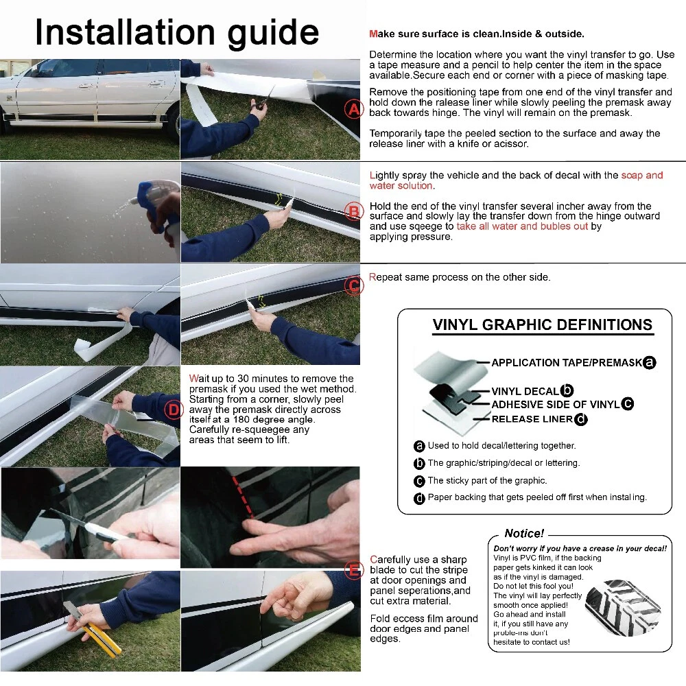 Description This listing is for 2 pieces of black side skirt decal sticker fit. This eye catching decal will give your car a racing sporty look. Feature 2x black side skirt stickers (Left & Right) Made by automotive grade graphic vinyl Come with 3M self-adhesive tape on the back Pre-cut shape for easy installation Ultra long lifespan for outdoor use, will not fade or run even under extreme weather Can be removed without residue if needed Size: 220*15cm(side skirt stickers) Installation 1) Clean up the surface, make sure no dirt and dust, and completely dry. 2) Peel the back sheet off the decal slowly (do not peel all the way through) and make sure no water or dirt go into the back of the decal 3) Slowly attach the decal to the desire area to avoid air bubble 4) Continue to attach the rest On Aug 21, 2024 at 04:58:16 PDT, seller added the following information: On Sep 9, 2024 at 05:48:22 PDT, seller added the following information: On Sep 14, 2024 at 00:56:31 PDT, seller added the following information: On Sep 20, 2024 at 01:51:41 PDT, seller added the following information: On Nov 8, 2024 at 19:44:06 PST, seller added the following information: