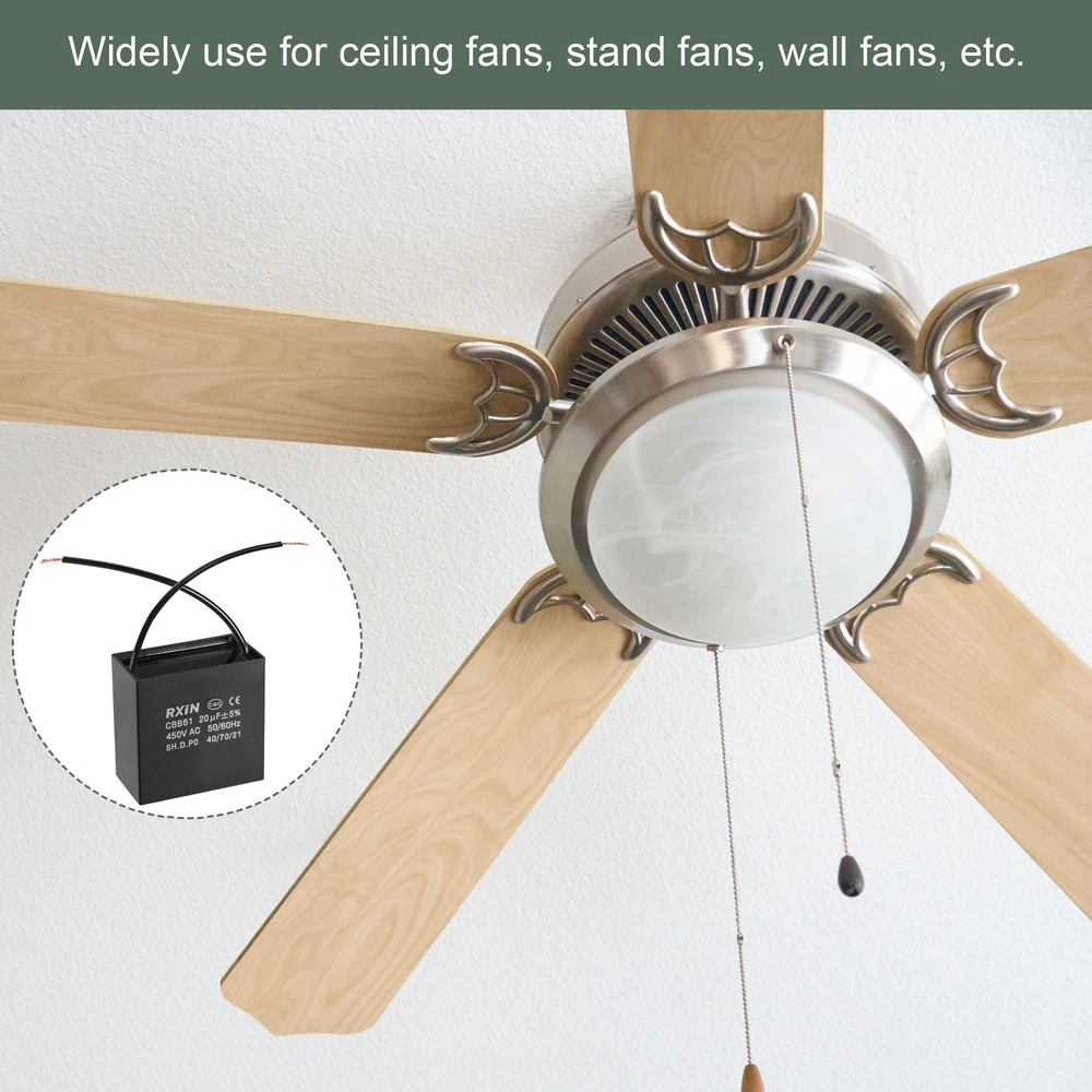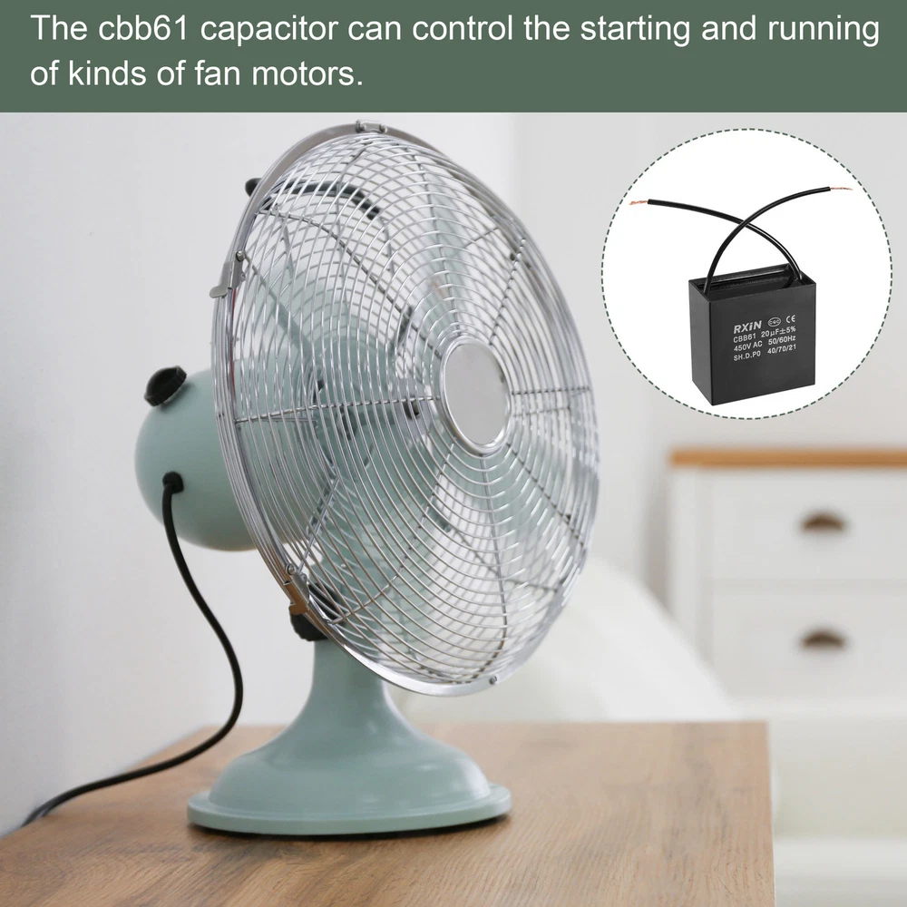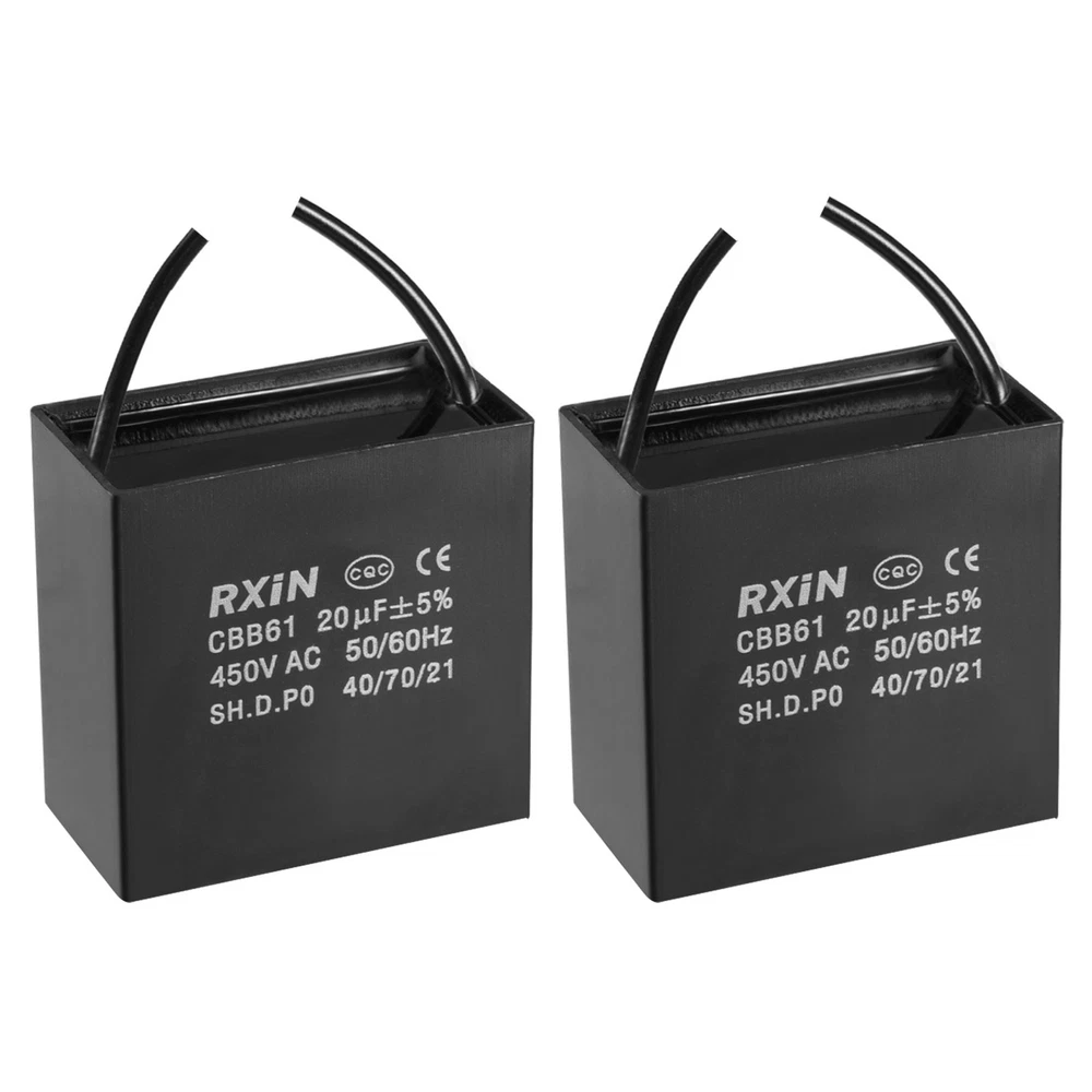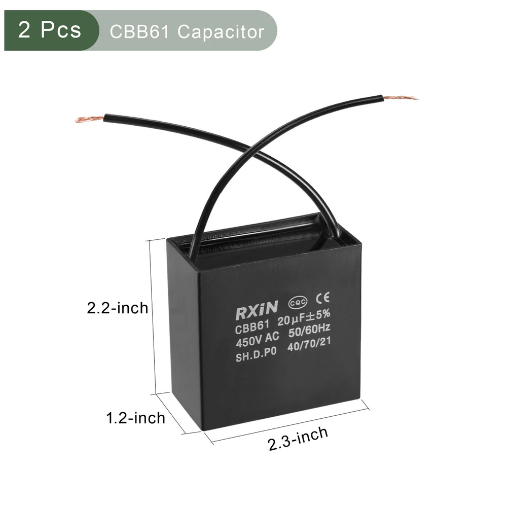 Document MULTIPURPOSE - Our fan capacitor is great for office, home, and daily use, it can control the starting and running speed of kinds of fan motors such as ceiling fans, stand fans, wall fans, range hood fans, air exchange fans and can also be used for water pumps, generators, etc.WHAT YOU GET - The package comes with 2Pcs CBB61 Capacitor with 2 Wires, the rated voltage is 450V AC, the rated capacity is 20uF (±5%), the rated frequency is 50/60Hz, the climatic category is 40/70/21, shell size: 58x31x57mm / 2.3x1.2x2.2 inch.RELIABLE MATERIAL - This running capacitor is made of polypropylene film covered by an ABS shell, which is compact and durable.SPECIAL DESIGNED - The c61 capacitor has features of low loss, excellent electrical performance and a long service time.KINDLY NOTE - If the ceiling fan breaks down, such as working slowly, not working or not working at variable speed, please check the fan capacitor first and replace it with a new one. 2Pcs Ceiling Fan Capacitor CBB61 Metallized Polypropylene Film Capacitor 20uF MULTIPURPOSE - Our fan capacitor is great for office, home, and daily use, it can control the starting and running speed of kinds of fan motors such as ceiling fans, stand fans, wall fans, range hood fans, air exchange fans and can also be used for water pumps, generators, etc. WHAT YOU GET - The package comes with 2Pcs CBB61 Capacitor with 2 Wires, the rated voltage is 450V AC, the rated capacity is 20uF (±5%), the rated frequency is 50/60Hz, the climatic category is 40/70/21, shell size: 58x31x57mm / 2.3x1.2x2.2 inch. RELIABLE MATERIAL - This running capacitor is made of polypropylene film covered by an ABS shell, which is compact and durable. SPECIAL DESIGNED - The c61 capacitor has features of low loss, excellent electrical performance and a long service time. KINDLY NOTE - If the ceiling fan breaks down, such as working slowly, not working or not working at variable speed, please check the fan capacitor first and replace it with a new one. Hot Item Payment 1.We accept eBay payment . 2.Payment must be received within 7 business days of auction closing. Shipping 1.We ship to your eBay or Paypal address. Please make sure your eBay and Paypal address is correct before you pay. 2.Items will be shipped within 1-3 business day when we received payment. 3.Delivery time depends on destination and other factors. Description Policy 2Pcs Ceiling Fan Capacitor CBB61 Metallized Polypropylene Film Capacitor 20uF MULTIPURPOSE - Our fan capacitor is great for office, home, and daily use, it can control the starting and running speed of kinds of fan motors such as ceiling fans, stand fans, wall fans, range hood fans, air exchange fans and can also be used for water pumps, generators, etc. WHAT YOU GET - The package comes with 2Pcs CBB61 Capacitor with 2 Wires, the rated voltage is 450V AC, the rated capacity is 20uF (±5%), the rated frequency is 50/60Hz, the climatic category is 40/70/21, shell size: 58x31x57mm / 2.3x1.2x2.2 inch. RELIABLE MATERIAL - This running capacitor is made of polypropylene film covered by an ABS shell, which is compact and durable. SPECIAL DESIGNED - The c61 capacitor has features of low loss, excellent electrical performance and a long service time. KINDLY NOTE - If the ceiling fan breaks down, such as working slowly, not working or not working at variable speed, please check the fan capacitor first and replace it with a new one. Hot Item Payment 1.We accept eBay payment . 2.Payment must be received within 7 business days of auction closing. Shipping 1.We ship to your eBay or Paypal address. Please make sure your eBay and Paypal address is correct before you pay. 2.Items will be shipped within 1-3 business day when we received payment. 3.Delivery time depends on destination and other factors.