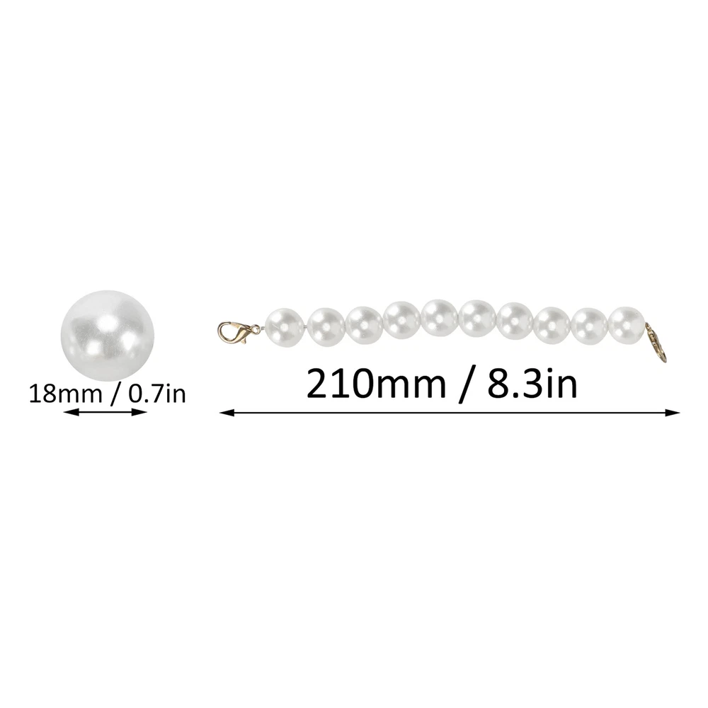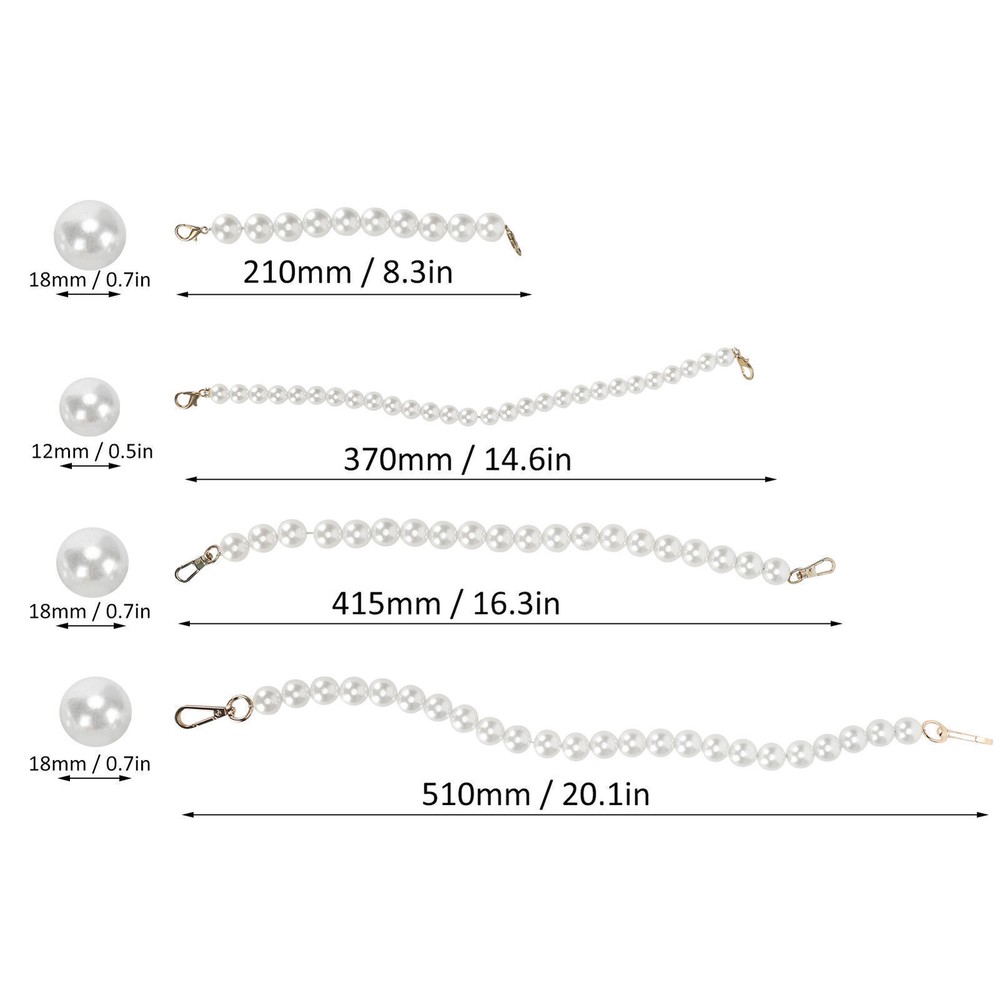 Feature: 1. Exquisite craftsmanship, milky white faux pearls add elegant decoration to your bag. 2. Matched with alloy lobster claw clasp to ensure firmness and easy installation. 3. Widely used, can replace or DIY short chains of bags, such as handbags, etc. 4. Small size, easy to carry and store, convenient to use and with good performance. 5. Can be used with peace of mind, with strict quality control and quality assurance. Specification: Item Type: Faux Pearl Bag Strap Specification: 2Pcs Main Material: Faux Pearl (The product is composed of complex materials) Uses: Clothing accessories Size: Length x Diameter: Approx. 210 x 18mm / 8.3 x 0.7in 370 x 12mm / 14.6 x 0.5in 415 x 18mm / 16.3 x 0.7in 510 x 18mm / 20.1 x 0.7in Package List: 2 x Faux Pearl Bag Strap Note: Manual measurement, with small errors.