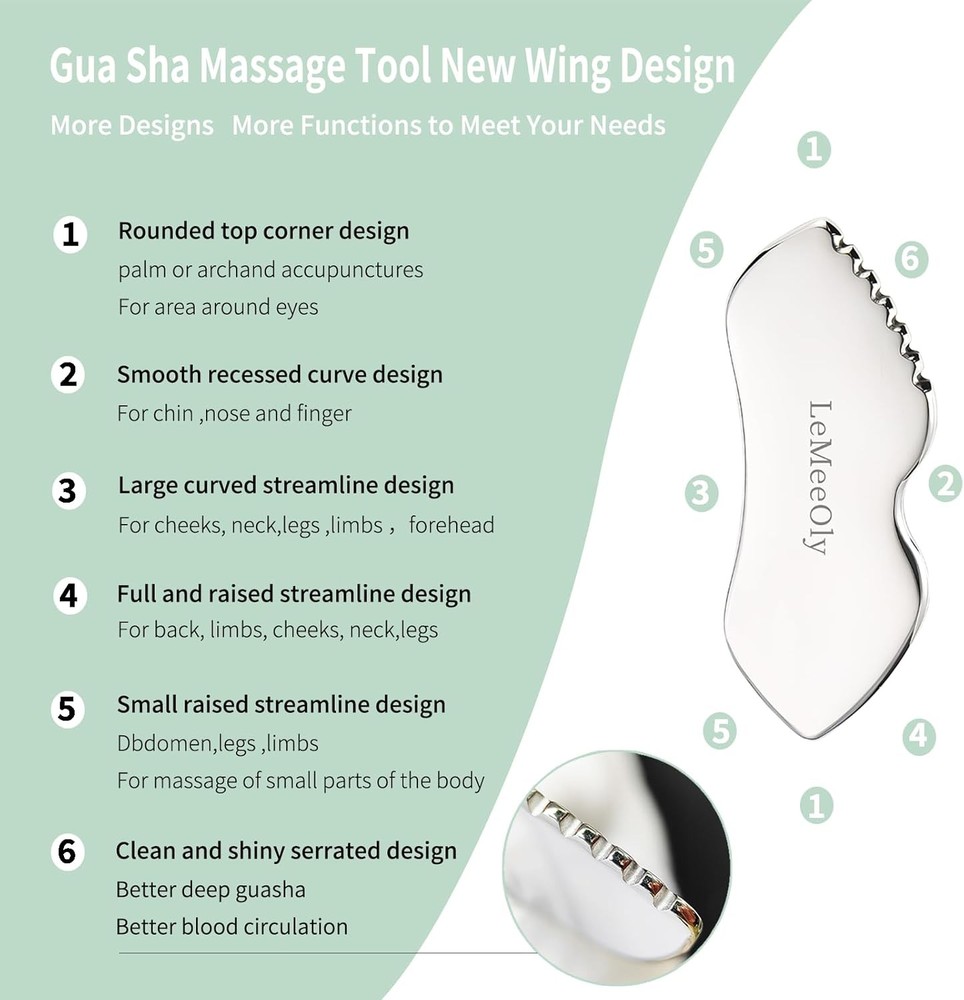 2Pcs Gua Sha Facial Tools Stainless Steel, Detailer GuaSha Set for Sliver Description Features: 【Revitalize Your Skin】Lemeeoly stainless steel gua sha facial tool enhances your skincare routine. Experience the lifting and firming effects of our metal guasha tool for face and neck while also reducing fine lines and wrinkles. It acts as a lymphatic drainage massager face tool. 【More comprehensive facial care】LeMeeOly 2-in-1 Facial Skin Care Tools Set,heart-shaped stainless steel gua sha tool & detailer stainless steel guasha tool, Utilize specialized tools for different facial areas to enhance precision and effectiveness. 【Daily Choice】Detailer gua sha stainless steel tool provides deep tissue massage and relaxation, making it the perfect choice for your daily regimen. The face massager metal gua sha facial tool is convenient to use and carry, whether at home or on the go, offering daily skincare enjoyment 【Strict Material Selection】LeMeeOly metal gua sha facial tools, crafted from high-quality stainless steel, naturally provides a cooling effect and reduces puffiness. The surface boasts outstanding gloss, durability, and resistance to deformation. Serrated edges can be used as a guasha tool for body 【Perfect Gift】 The face massager set is a meaningful gift for anyone at festivals. You can send it as a gift to your friends, wife, mom, etc.. They will like the facial roller set very much. Product Details: Product Dimensions : 7.28 x 4.72 x 1.77 inches; 13.76 ounces Item model number : gua sha+face roller+applicator Manufacturer : LeMeeOly Use for: Face Power Source: Manual Material: Stainless Steel Brand: LeMeeOly Color: Sliver Handling We will ship all orders within 1 business day of payment. Delivery We Do Not Ship Outside of the Continental US. Return Policy All items qualify for returns within 30 days of receipt. Buyer is responsible for return shipping on any item that is not damaged. Feedback We take our reputation seriously, we buy and sell online, so we understand the value of trust. If you are unsatisfied with your order, please contact us and we will work with you to resolve it to your satisfaction.