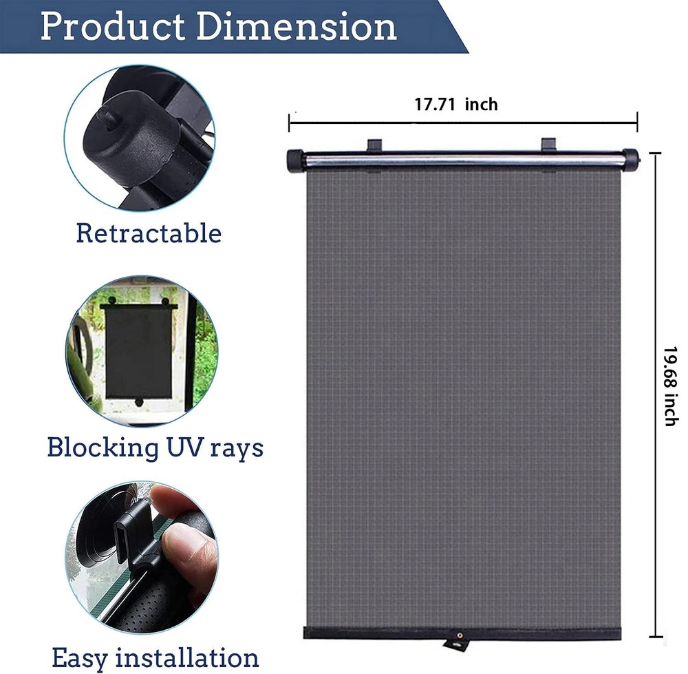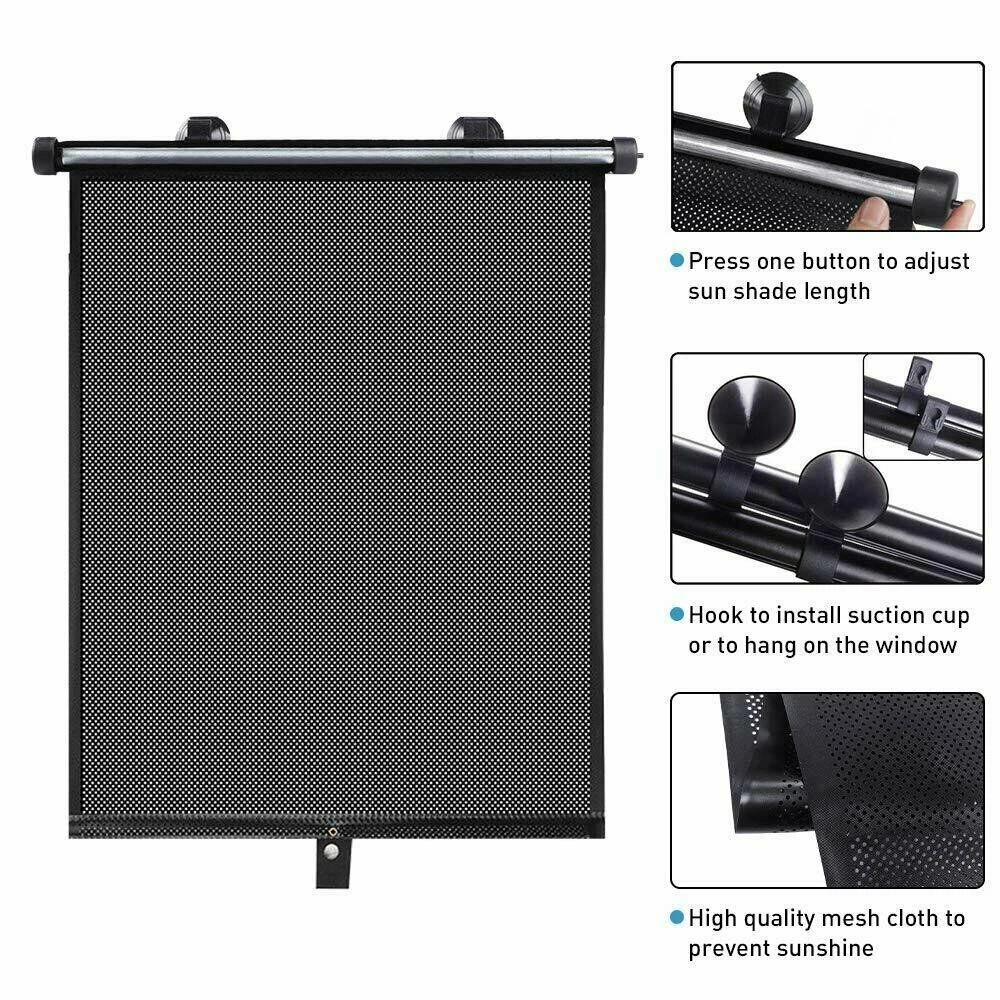2Pcs Retractable Car Auto Side Window Baby Sun Shade Shield Roll Cover 45*50CM Feature 【Product Name】Car Window Shades 【Size】45*50CM (17.71*19.68 inch) (We offer 40*45CM, 50*50CM, 55*50CM, 60*50CM, if you want to buy,please go to our shop,thanks) 【Color】Black/White (You can leave a message about the color you want, no message we will randomly shipped) 【Material】PVC (as the pictures show) 【Quantity】2 Specification 【Blocks UV Rays and Heat】 Our car window shades is made of high quality PVC, which can effectively block 98% harmful UV rays, reduce the sun’s glare and heat. While allowing you to see from the car outside during car rides, to ensure that your vision is not obscured. Our car sun shade makes you feel cool in car and have great durability withstand long time use. This is an essential car accessory. 【Retractable Car Window Shades】 You can adjust the length of the sun shade for car window to suit your needs. The adjustable car window shade is designed with a quick retract button. Just press the button, the universal car sunshade can roll up automatically.You could put away the car window shades for side window without any effort. Car sun shade also comes with a storage bag, so it is quite easy to store when not in use. 【Easy to Install and Use】 There are two ways to use the window shades for car baby: optional clips or suction cups for fixing, and then the car window shades for side window can be stretched to the right size for use. Notice: The suction cup may get deformed due to long time transportation, you could immerse them into hot water and dry the suction cup before fixing them in the window. 【Wide Range of Application】 The size of car shades for side windows is 17.71*19.68 inch. Since our car sun shade is retractable in design, the use scenario and range is wider than other shades. Car window shade is suitable for cars, SUVs, but also suitable for rooms, houses and office Windows. Two-pack sun shade for car window can be used in combination with the size of the glass. 【Protect Privacy in the Car】 Sun shade for car window will create a privacy room for the seat passengers.Window shades for car can block UV rays and harsh sunlight, while also protecting your privacy inside the car and blocking the view of the car from outside. Rest assured that you will be able to see out of the car and your baby and pets will be able to enjoy the view outside the car to ensure your view is not obstructed. Fitment:Please measure the size of your car window before purchase, if you are not sure, please contact customer service Package included: 2* Car Window Shades Note Manual measurement may exist 1-2cm error, please understand Please be reminded that due lighting effects, monitor's brightness/contrast settings etc, there could be some slight differences in the colour tone of the website's photo and the actual item. If there is an unexpected delay in transit of your goods, or if you find there are some unexpected problems with the product after you receive it, we sincerely hope you will email us first instead of opening a case, it is very important to us and I appreciate your understanding.We guarantee that you can get a satisfactory solution.