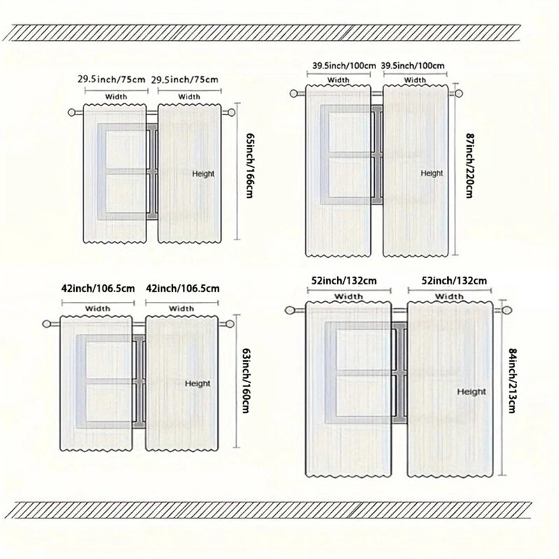 SIZE: 2panels/set 29.5in*65in*2Pcs (each panel 29.5inches wide,65inches height, total 59inches wide 65inches height) 42in*63in*2Pcs (each panel 42inches wide,63inches height, total 84inches wide 63inches height) 39.5in*87in*2Pcs (each panel 39.5inches wide,87inches height, total 79inches wide 87inches height) 52in*84in*2Pcs (each panel 52inches wide,84inches height, total 104inches wide 84inches height) Package Includes: Sold in set,each package includes 2 panels. Material: The curtain is crafted by 100% polyester. Light-filtering curtains block strong light to weaken the light in the room, but also retains enough light to illuminate the room Hanging Methods: The rod pocket interior diameter is about 2.7 inches, that is large enough for most rods in the market making it easy to move the curtain along the rods Easy Care: These curtains can be machine-washed or hand-washed in cold water. Hang dry, and iron at medium setting if needed. Do not scrape the panels with sharp objects.