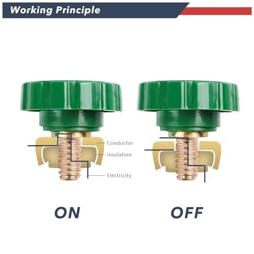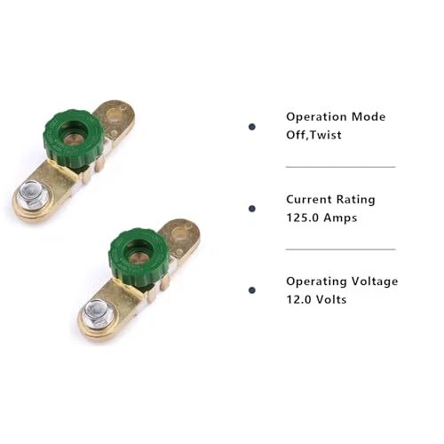 Specification: Color: Green & Copper Voltage: 6V 12V 24V Cable size: 4-6 AWG Continue Rate: 125A Crank Rate: 500A Battery pile head diameter: 10mm / 3.9in Package Include: 2x side post battery switch( with 2x short bolt) Easy installation instructions: 1)Disconnect ground (-) cable from battery and attach it to the mounting flange side of the threaded hole on the switch. 2)Using the supplied bolt, attach the switch to (-) battery post. The mounting flange on the thru-hole must contact the battery post. 3)Turn green knob fully clockwise to connect battery power. 4)To disconnect power, turn knob 1/4 turn counterclockwise. The knob can be removed for anti-theft. Keep connections clean and tight to assure optimum performance. With a long bolt, used for side post terminal, battery negative post 3/8" hole only, DC 12 V system, rated current: 125 A, On/Off 2 position. Battery cutoff switch helps isolate and secure the electrical system, eliminate any power draw from the battery when vehicle or boat is not in use, disconnects the battery safely. Battery isolator switches are solid brass made, rust and corrosion resistant, durable made for safety use. knob type, easy to install & simple to use. Loose / twist of the knob, then power will cut. Package include: 2 PCS side post battery disconnect switches.