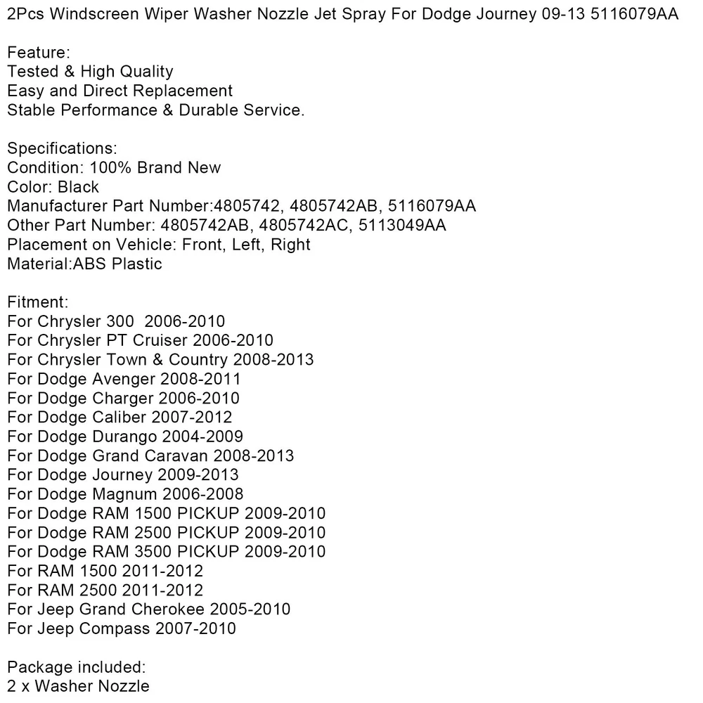 These wiper nozzles for the Dodge Journey fit perfectly and spray evenly—no more streaky windshields! Installation took minutes, and they look just like OEM. Great replacement for worn-out jets, and the price is unbeatable. Works exactly as promised, highly recommend for a quick fix!