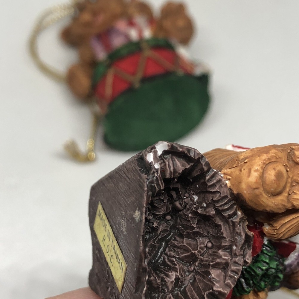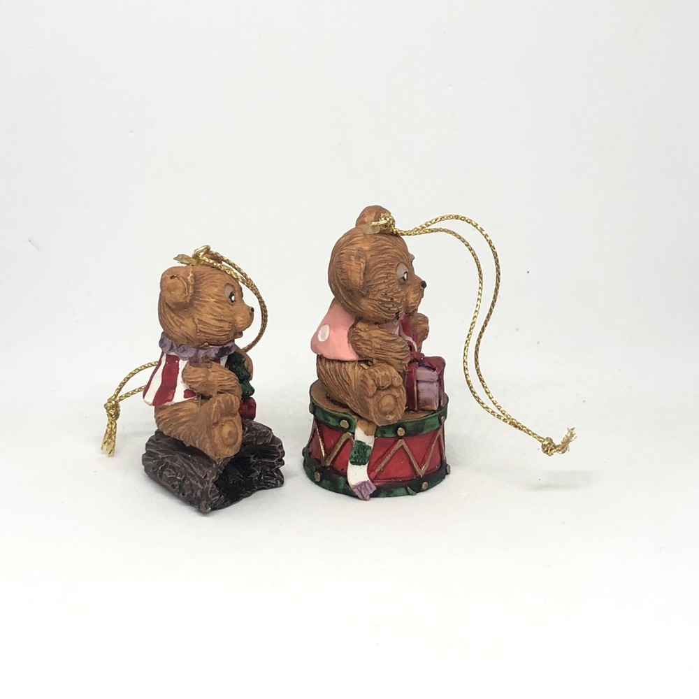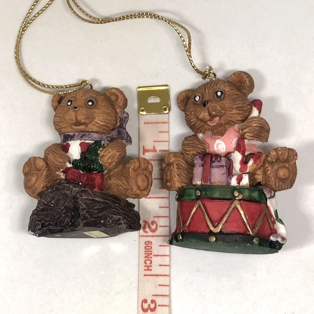 Set Of 2 Bear Christmas Ornament Sitting On Drum & Log With Tree 2” Resin! Note: One of the ornaments has a nick on the bottom edge; shown in photos! Thank you for stopping by!