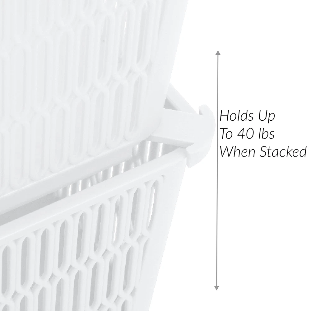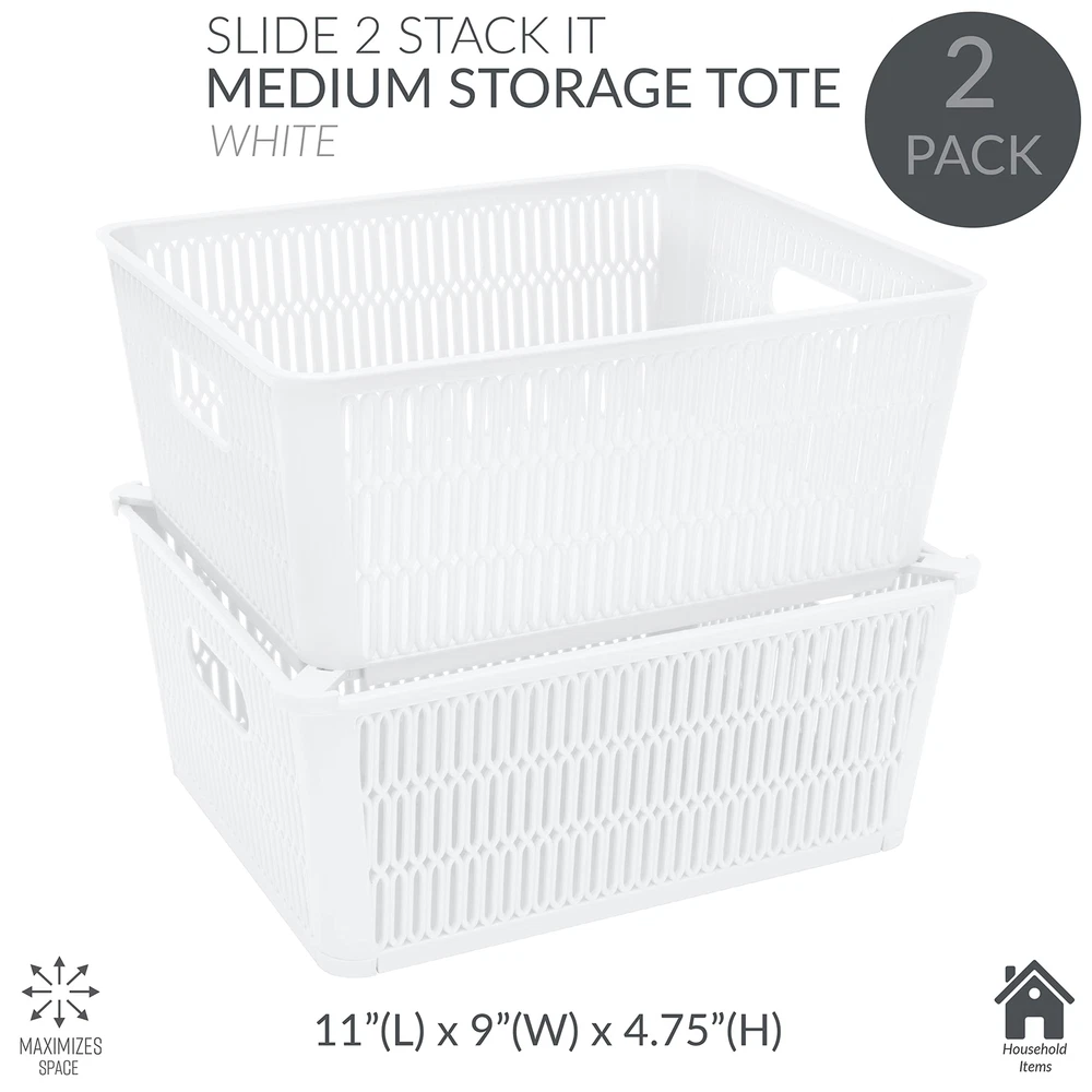 Maximize your storage space with the Slide 2 Stack It Storage Tote Baskets. Created with a patented slide to stack design which provides slide out corner support that allow the totes to be safely stackable. Storage totes hold up to 40lbs while stacked, allowing you to maximize your storage in closets, cabinets, shelves and more. The totes neatly nest inside when not in use. Organizing just became easier with the slide 2 stack it totes! Dimensions: 11"x 9"x 4.75" Patented Slide 2 Stack Design: The corners of each storage tote are designed with slide out support to allow totes to be stackable. This helps to maximize your storage space. Nestable: The totes nest easily inside each other when not in use for easy storage and will take up less space. Holds 40lbs: These baskets are strong and durable enough to hold up to 40 pounds when stacked. Multipurpose: These totes are perfect for your bathroom, kitchen, bedroom, and more. You can easily towels, soaps, lotions in it. Or you can use them to organize your craft room.