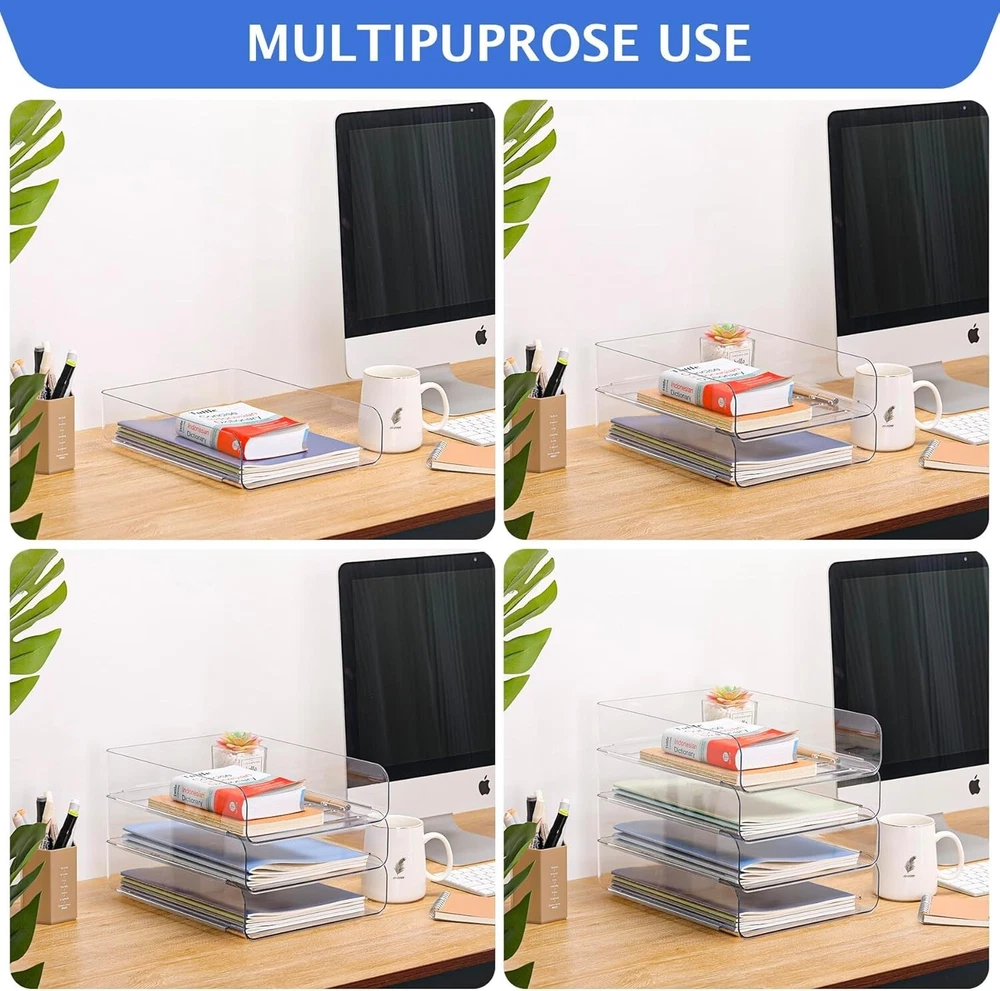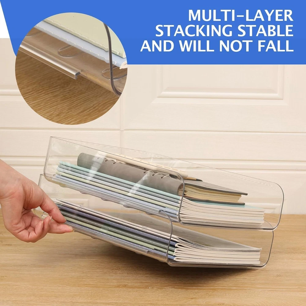 About this item 2 Layers Office Organization - Our office organization and storage has 2 trays that can be used to display your items or store savings, such as A4 paper, documents, books, notebooks, notepads, stationery, keys, jewelry, etc., providing you with a lot of convenience. Stylish and Sturdy Desk Organizer - Our paper letter tray is made of thick premium PET material, which features durable and sturdy to use for a long time. The transparent office storage looks very clean and sleek, and it can provide a clean/organized look of your home and office desk for you. Space Saveing - With a stackable design, this desk organizer tray takes up a small space in your office desk, but provides you with a large storage space. This clear office organizer tray can keep all your stuff in one place. It will nicely to sort and hold your office supply and desk accessories. Multiple Functional - This horizontal stackable desk organizers and storage is great for school, home, and office to organize textbooks, notebooks, teachers' and students' files, documents, magazines, stationery, printer paper, etc. Color Clear Product Dimensions 12.5"L x 9.6"W x 5.8"H Shape Rectangular
