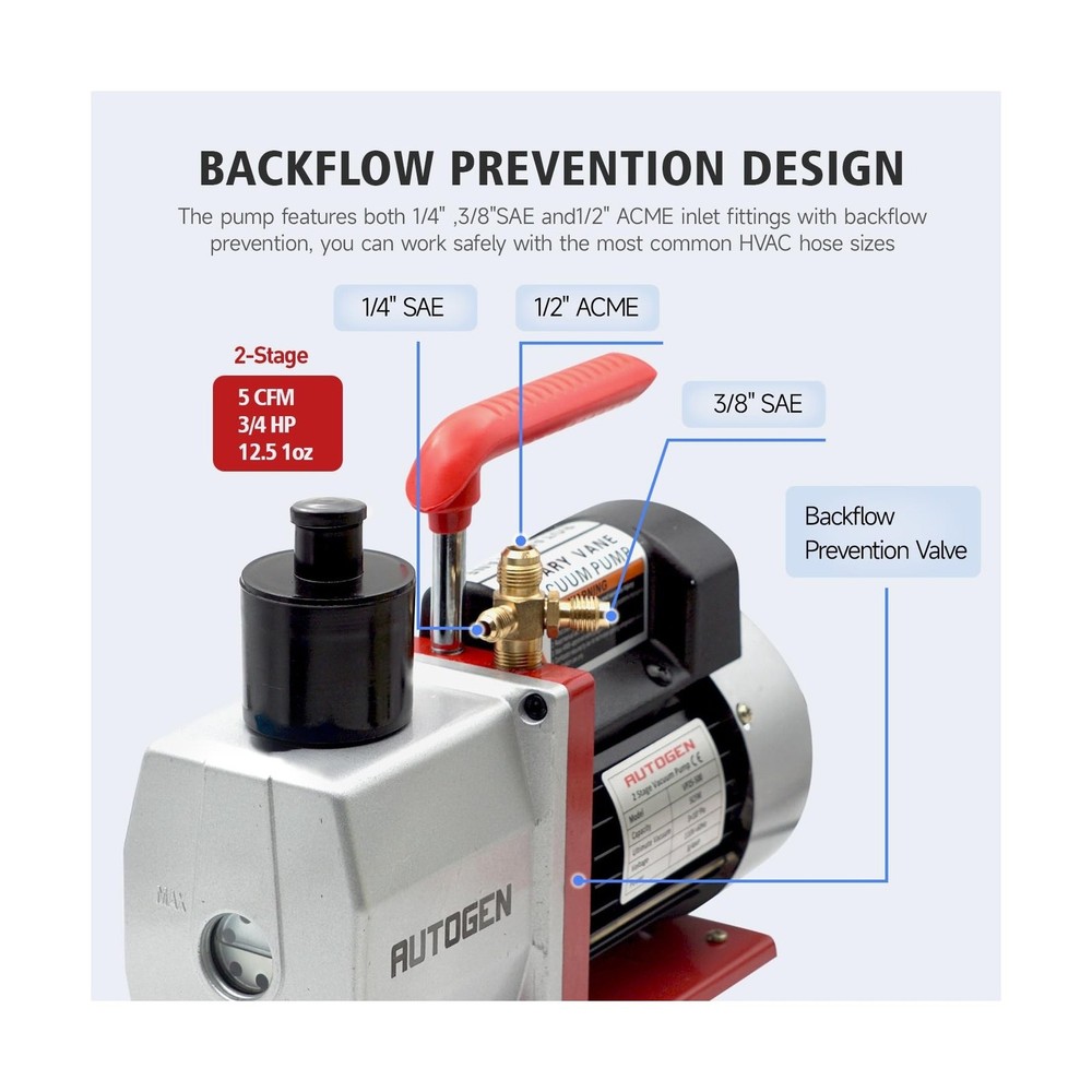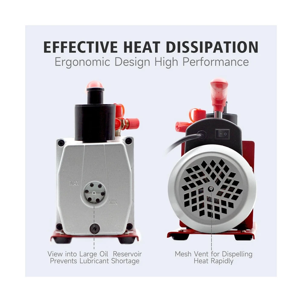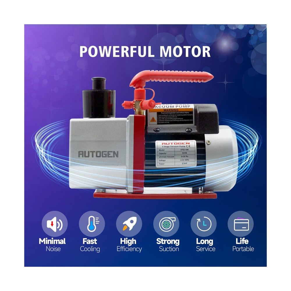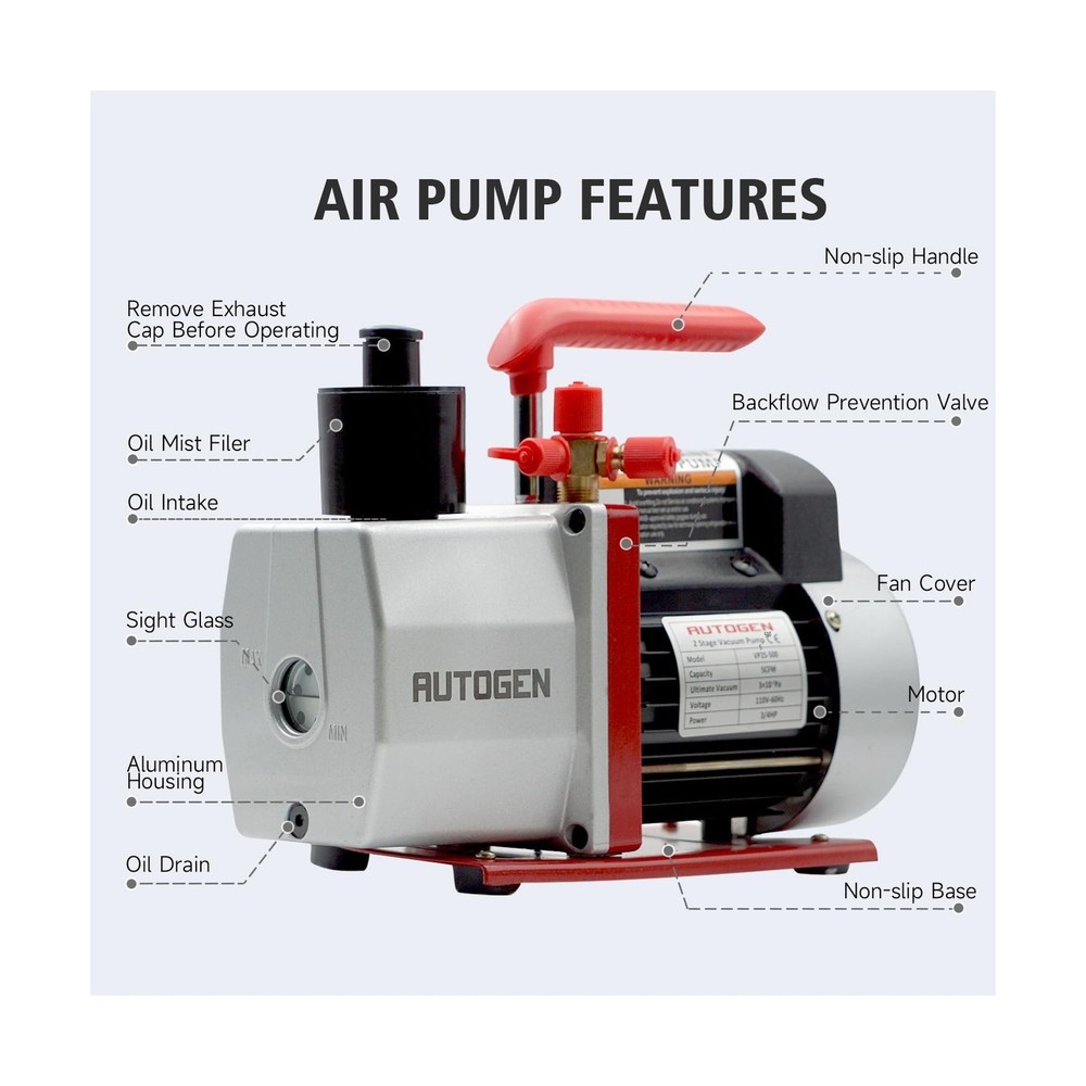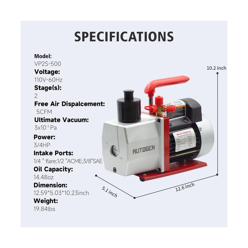 2-Stage Air Vacuum Pump 5CFM 3/4HP 0.3 Pa for HVAC/AUTO AC Refrigerant Recharging, Degassing Wine, Milking Cow, Food Processing Description 1 Features: Rotary Vane Vacuum PumpIntake Ports: 1/4" flare, 1/2" ACME, 3/8" SAE, Free Air Displacement(FAD): 5CFM, Power: 3/4HP, Voltage/Frequency: 110/60HZ, Ultimate Vacuum: 0.3 PA, Oil Capacity: 14.48oz, Non-Slip Cushion Handle. Convenient To OperateFeatures a simple oil fill port for a clean pour, oil window provides vital information like oil level and oil quality. The design of a great starting moment is easy for starting and high efficiency, which can keep it working perfectly even is lower ambient temperature and lower volt. 1/4", 1/2" and 3/8" ports allow fast and easy servicing of automotive and other low-tonnage R12, R22, R134a, and R410a systems. Environment Protecting DesignThe tank is separated and there are separating devices at the exhaust port. It can effective avoid oil spraying and erduce pollution. Wide ApplicationThe Air Vacuum Pump is applicable to vacuum packaging, vacuum freezing, automobile reparation, gas analysis, medicine mechanism, printing mechanism, and other vacuum evacuations. Product Details: Manufacturer: Maipade Part Number: BK5C-2S Item Weight: 16 pounds Package Dimensions: 15 x 13 x 7 inches Batteries Included?: No Batteries Required?: No Date First Available: May 12, 2025 Delivery We Do Not Ship Outside of the Continental US. Return Policy All items qualify for returns within 30 days of receipt. Buyer is responsible for return shipping on any item that is not damaged. Feedback We take our reputation seriously, we buy and sell online, so we understand the value of trust. If you are unsatisfied with your order, please contact us and we will work with you to resolve it to your satisfaction.