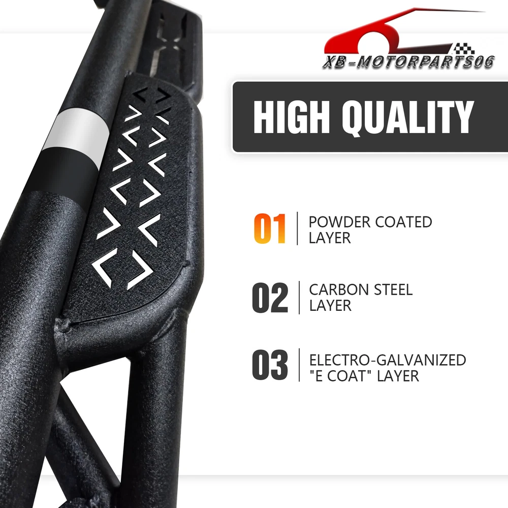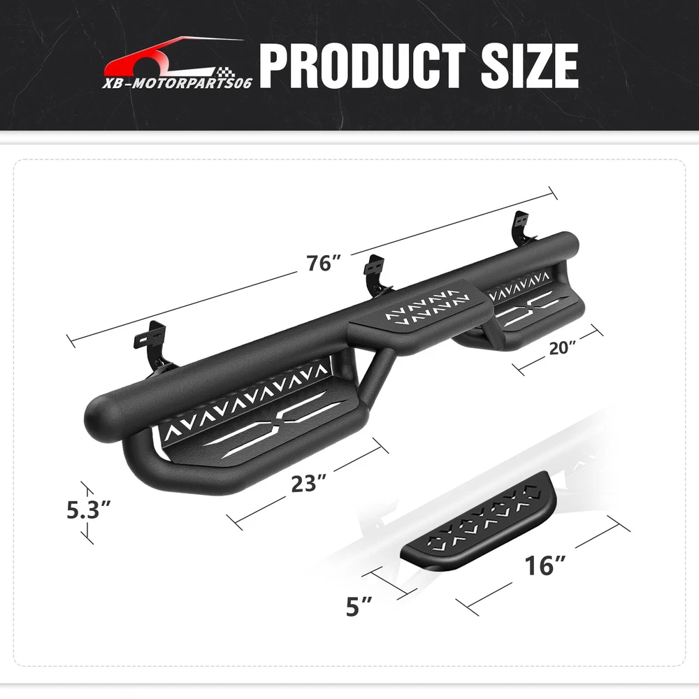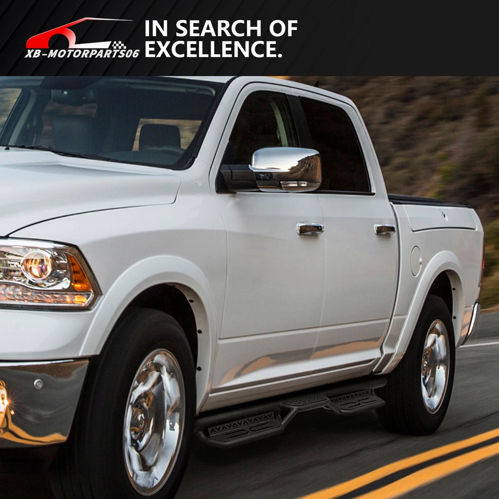 2-Stairs Running Boards For 09-2018 Ram 1500 & 19-2024 Ram 1500 Classic Quad Cab Suitable Models : Compatible with 2009-2018 Dodge Ram 1500, 2019-2024 Dodge Ram 1500 Classic, 2010-2024 Dodge Ram 2500 3500 Quad Cab ( For 2 Full Size Doors & 2 Narrower Doors, Not for 1500 New Body ) Package Includes : 2 side bars, a set of brackets, installation instructions, and all necessary hardware Product Information : Package Dimensions: 78.74 x 12.20 x 10.04 inches Installation mode: Bolt-On Weight Limit: 550LBS Placement on Vehicle: Left and Right Item Weight: 61.6 pounds Material: Carbon Steel Color: Black (hand measurements may have an error of 2-3 mm/0.078-0.118 in) Feature: ① The side step features a two-tier layout, providing enhanced convenience for vehicles with lift kits and oversized tires. It also facilitates easier roof access; ② The ultra-thick main tube imparts excellent weight-bearing capacity to the step, preventing deformation and offering enhanced vehicle protection; ③ Hollow design in the step area ensures secure and stable stepping, prevents water accumulation, and reduces driving resistance; ④ The high-quality black powder coating provides outstanding rust and corrosion resistance. Constructed from heavy-duty 2mm carbon steel, each side can withstand a weight of 550 pounds; ⑤ Simple bolt-on installation without the need for drilling or cutting; Warranty Period : 2 year Standard Shipping (FedEx Ground or FedEx Home Delivery) Will usually ship within 3 business days of receiving cleared payment Suitable Models : Compatible with 2009-2018 Dodge Ram 1500, 2019-2024 Dodge Ram 1500 Classic, 2010-2024 Dodge Ram 2500 3500 Quad Cab ( For 2 Full Size Doors & 2 Narrower Doors, Not for 1500 New Body ) Package Includes : 2 side bars, a set of brackets, installation instructions, and all necessary hardware Product Information : Package Dimensions: 78.74 x 12.20 x 10.04 inches Installation mode: Bolt-On Weight Limit: 550LBS Placement on Vehicle: Left and Right Item Weight: 61.6 pounds Material: Carbon Steel Color: Black (hand measurements may have an error of 2-3 mm/0.078-0.118 in) Feature: ① The side step features a two-tier layout, providing enhanced convenience for vehicles with lift kits and oversized tires. It also facilitates easier roof access; ② The ultra-thick main tube imparts excellent weight-bearing capacity to the step, preventing deformation and offering enhanced vehicle protection; ③ Hollow design in the step area ensures secure and stable stepping, prevents water accumulation, and reduces driving resistance; ④ The high-quality black powder coating provides outstanding rust and corrosion resistance. Constructed from heavy-duty 2mm carbon steel, each side can withstand a weight of 550 pounds; ⑤ Simple bolt-on installation without the need for drilling or cutting; Warranty Period : 2 year