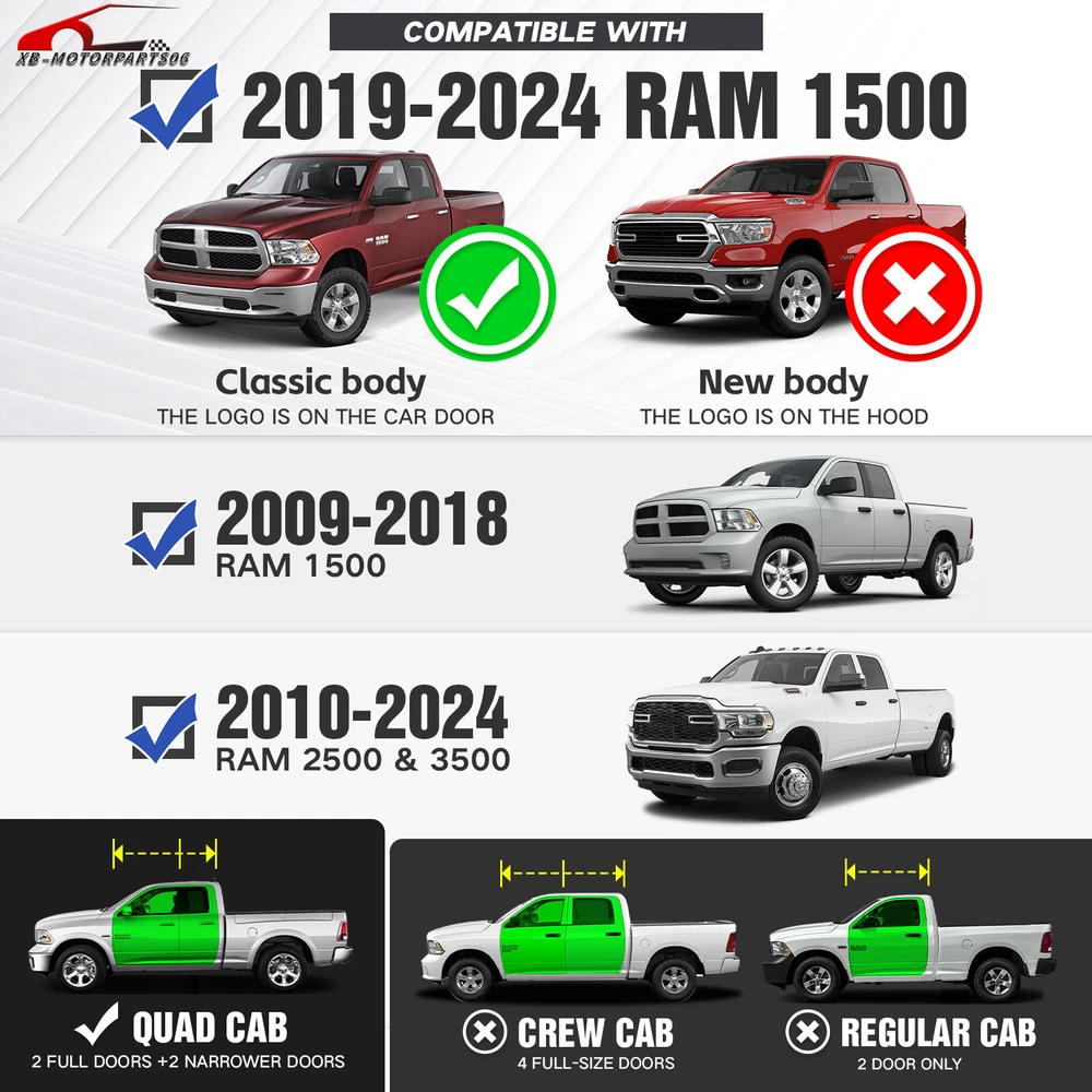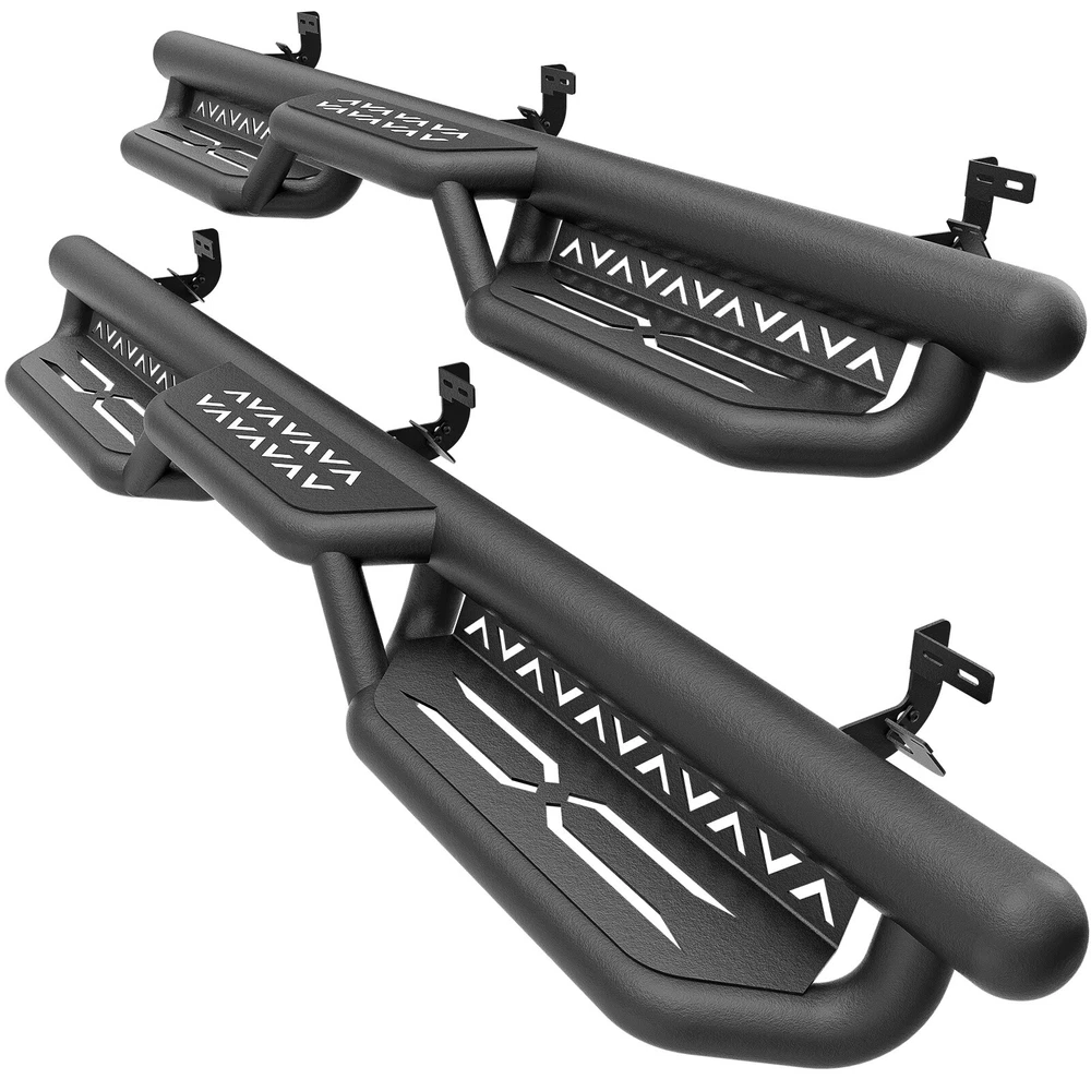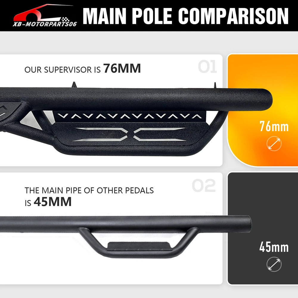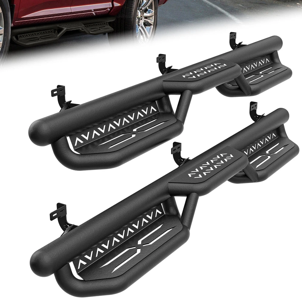 2-Stairs Running Boards For 09-2018 Ram 1500 & 19-2024 Ram 1500 Classic Quad Cab Suitable Models : Compatible with 2009-2018 Dodge Ram 1500, 2019-2024 Dodge Ram 1500 Classic, 2010-2024 Dodge Ram 2500 3500 Quad Cab ( For 2 Full Size Doors & 2 Narrower Doors, Not for 1500 New Body ) Package Includes : 2 side bars, a set of brackets, installation instructions, and all necessary hardware Product Information : Package Dimensions: 78.74 x 12.20 x 10.04 inches Installation mode: Bolt-On Weight Limit: 550LBS Placement on Vehicle: Left and Right Item Weight: 61.6 pounds Material: Carbon Steel Color: Black (hand measurements may have an error of 2-3 mm/0.078-0.118 in) Feature: ① The side step features a two-tier layout, providing enhanced convenience for vehicles with lift kits and oversized tires. It also facilitates easier roof access; ② The ultra-thick main tube imparts excellent weight-bearing capacity to the step, preventing deformation and offering enhanced vehicle protection; ③ Hollow design in the step area ensures secure and stable stepping, prevents water accumulation, and reduces driving resistance; ④ The high-quality black powder coating provides outstanding rust and corrosion resistance. Constructed from heavy-duty 2mm carbon steel, each side can withstand a weight of 550 pounds; ⑤ Simple bolt-on installation without the need for drilling or cutting; Warranty Period : 2 year Standard Shipping (FedEx Ground or FedEx Home Delivery) Will usually ship within 3 business days of receiving cleared payment Suitable Models : Compatible with 2009-2018 Dodge Ram 1500, 2019-2024 Dodge Ram 1500 Classic, 2010-2024 Dodge Ram 2500 3500 Quad Cab ( For 2 Full Size Doors & 2 Narrower Doors, Not for 1500 New Body ) Package Includes : 2 side bars, a set of brackets, installation instructions, and all necessary hardware Product Information : Package Dimensions: 78.74 x 12.20 x 10.04 inches Installation mode: Bolt-On Weight Limit: 550LBS Placement on Vehicle: Left and Right Item Weight: 61.6 pounds Material: Carbon Steel Color: Black (hand measurements may have an error of 2-3 mm/0.078-0.118 in) Feature: ① The side step features a two-tier layout, providing enhanced convenience for vehicles with lift kits and oversized tires. It also facilitates easier roof access; ② The ultra-thick main tube imparts excellent weight-bearing capacity to the step, preventing deformation and offering enhanced vehicle protection; ③ Hollow design in the step area ensures secure and stable stepping, prevents water accumulation, and reduces driving resistance; ④ The high-quality black powder coating provides outstanding rust and corrosion resistance. Constructed from heavy-duty 2mm carbon steel, each side can withstand a weight of 550 pounds; ⑤ Simple bolt-on installation without the need for drilling or cutting; Warranty Period : 2 year