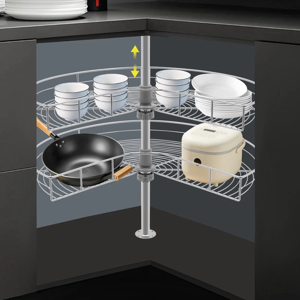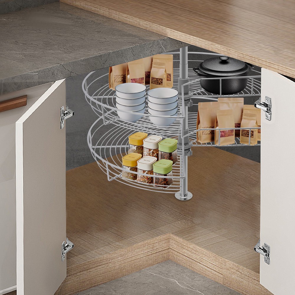 WELCOME Description In the kitchen, the birthplace of fine dining, every inch of space counts. Look at our amazing corner cabinet organizer to get your kitchen organized. It is made of premium and durable material. The highlight of this product is its rotation design. It makes full use of the corner space of the cabinet, and the corners are rounded to prevent scratching fingers. Don't let the clutter of the kitchen affect your cooking mood. Choose it, cooking will become more relaxed and enjoyable! Key Features Premium Material: It is mainly made of high-class iron, with an electroplating process, which is impact-resistant, and scratch-resistant, with high durability and reliability, ensuring long-term use. Large Capacity: With a 2-tier design and a diameter of 27.95 inches, it provides ample space for the storage of spices, baking supplies, and kitchen utensils, enough to meet the daily storage needs of the kitchen, creating a clean and comfortable cooking environment for you. Rotatable Function: The rotating design allows you to simply turn, all items can be easily presented in front of you, without stretching your arms to reach the deep things in the cabinet, for your convenience. Adjustable Design: The bearing bar height can be adjusted between 22.05 and 31.1 inches to accommodate different cabinet heights. In addition, you can also adjust the tier spacing of the upper and lower baskets freely by rotating the column and buckle, which can be flexibly fixed in different hole positions, making the storage more flexible. Excellent Load-bearing Capacity: The premium material and thick bearing bar ( diameter: 0.94 in) allow it to hold approximately 55.12 lbs, so you can use it with confidence. Practical Tool: It makes full use of the wasted space in the corner of the cabinet, allowing you to easily access units in the kitchen, making every corner that we tend to ignore become our storage space. Thoughtful Design: It uses a line structure, which can keep items dry and breathable, drain the water of the bowl or pot, and avoid the growth of bacteria . Quick to Set Up: The simple structure, complete installation parts, and an English manual allow you to easily set up, even beginners can master it quickly. Simple Cleaning: Thanks to its smooth surface and open structure, you can wipe away stains and dirt with a damp rag (not included). Ideal Gift: Thanks to its practicality and aesthetics, you can give it as your well-chosen gift to your family, relatives, friends, etc. Details Smooth Edges: The smooth, burr-free edges not only improve aesthetics but also enhance safety during installation and cleaning. Heightened Guardrail : Both racks are designed with heightened guardrails to effectively prevent your items from slipping. Application It can be installed in 90° or 7-shaped corner cabinets or wooden cabinets, to place pots, bowls, containers, spice jars, food, and so on. It can be installed in left or right-opening cabinets. How to Install Attach the plastic parts to the shelf. Place the lower basket into the cabinet. Then put on the upper basket. Tilt the upper basket and insert the bar. Let the bar go through the lower tray and fittings. Specification Style: Modern Colour: Silver Material: Iron, Plastic Process: E lectroplating Assembly Required: Yes Number of Tiers: 2 Rotation Angle: 360° Applicable Cabinet Diameter: ≥75cm/29.53in Mounting Type: In the Cabinet Installation Overall Load-capacity: About 25kg/ 55.12 lbs Adjustable Height Range: 56-79cm/22.05-31.1in Each Basket Diameter: 71cm/ 27.95 in Bearing Rod Diameter: 2.4cm/0.94 in Package Size: 71*16.5*61cm/ 27.95 * 6.5 * 24.02 in Gross Weight: 7kg/15.43 lbs Package Included 1* Corner Cabinet Organizer 1* English Manual Notes Please check your cabinet types before purchasing. Please note that the product does not include other items. Please note that the bearing bar should be in an upright state when used, and it should not be placed on the storage basket when it is tilted. Please use within the load-bearing range of the product. Please allow the slight color difference caused by the shooting light and 1-3cm error due to manual measurement and make sure you do not mind before ordering. Payment Delivery details Terms of sales About us Contact us Payment We accept ebay payment 。 Fees such as import duties, taxes are not included in the item price or shipping costs. These charges are the buyer's responsibility. Delivery details Shipping: 2-9 working days to: USA Terms of sales We maintain high standards of excellence and strive for hundred percent customer satisfaction. Feedback is very important to us. We hope that you contact us immediately before you give neutral or negative feedback, so that we can address your concerns. It is impossible to address issues if we do not know about them! About us Your satis faction is our ultimate goal. We work hard to earn your trust and future business. Our certified technicians have tested each item before shipping. The unit comes with 1 year limited warranty on all manufacturing defects. a) If you receive a defective item, you may return it or ask for a discount. Please contact us within 14 days after you receive the package. b) What you returned must be intact and in its original packaging as re? u. Customer is responsible for shipping costs of the returned item. c) We will cover the cost of shipping back t with the shipping rate indicated in the registration page. We will send you a new unit or refund the full payment you paid. Thank you. Contact us Business Hour Business Hour: Monday To Friday: 8:30 AM to 5:00 PM (Beijing China time) Due to time zones, our reply to your questions may not be immediately. But within above working time, we will reply your email within 24 hours. If it's non-workdays, please kindly be patient and wait till Monday. Please contact us with ebay message. Please feel free to contact us if you have any questions. Monday To Friday: 8:30 AM to 5:00 PM (Beijing China time) D