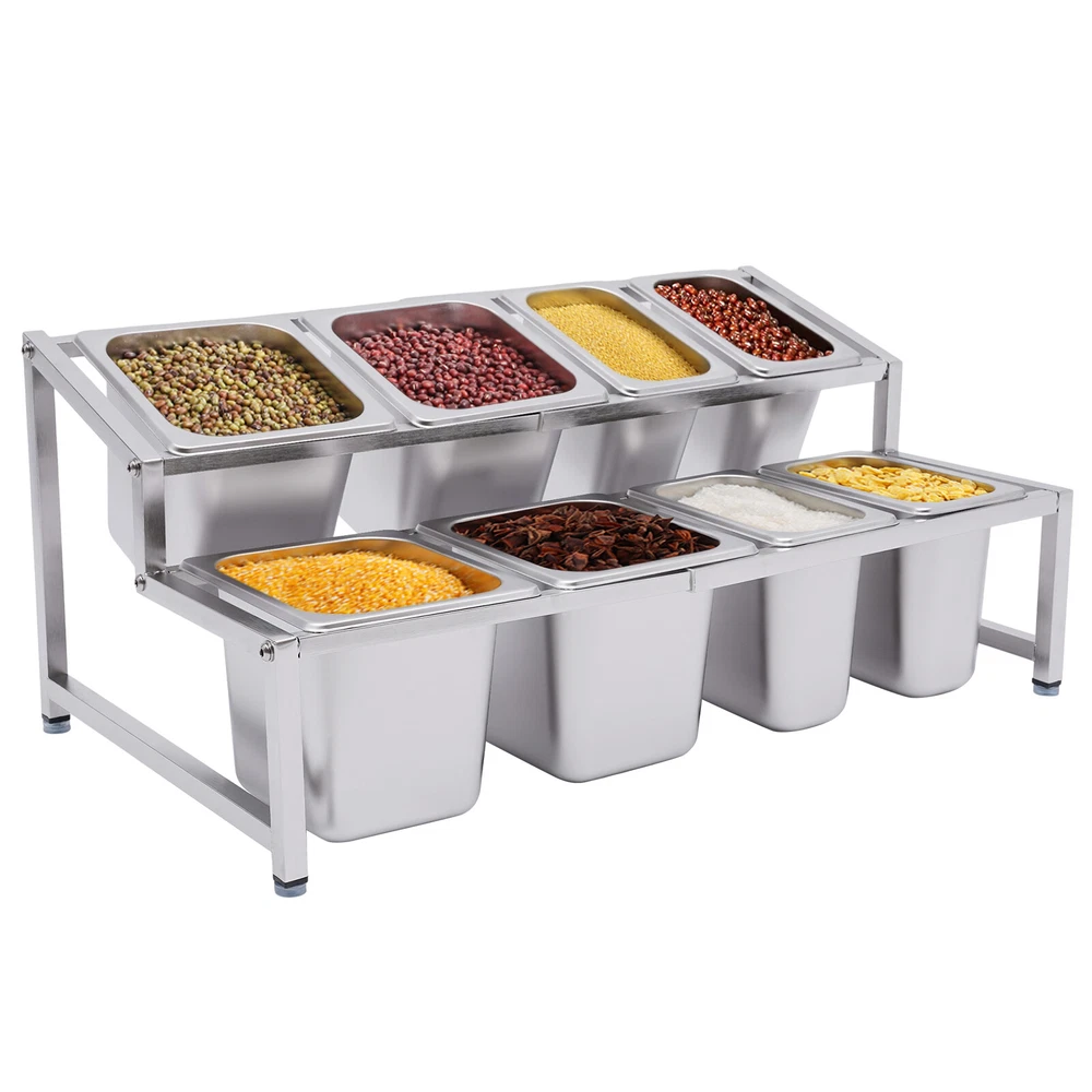 💖High Quality & Fast Shipping~💖 Description A neat, clean, and stylish kitchen need a user-friendly spice rack to store and organize your abundant spices for you. This sturdy and stable shelf not only effectively uses the vertical space of the countertop, but also easily avoids the embarrassment of tipping over the spice pan. This countertop inclined spice rack will give you a neat and comfortable kitchen to enjoy your cooking! Specification Shelf Material: 304 Stainless Steel Pan Material: 201 Stainless Steel Color: Silver Installation Type: Freestanding Process: Polished, Electrolysis Special Feature: Expandable Spice Rack Number of Tiers: 2 Number of Shelves: 1 Food Pan Quantity: 4 x 1/9 Pans + 4 x 1/6 Pans 1/9 Pan Dimensions: 17.5*11*15cm/6.88*4.33*5.9in Shelf Length Range: 35-60cm/13.8-23.6in 1/9 Pan Capacity: 1.6L/1.69Qt Load Capacity: 30kg/66lbs 1/6 Pan Dimensions: 17.5*16.5*15cm/6.88*6.49*5.9in Packing Size: 48*34*21cm/18.89*13.38*8.26in 1/6 Pan Capacity: 2.2L/2.32Qt Gross Weight: 7.5kg/16.53lbs Shelf Dimension: 58*35*27.5 cm/22.8*13.8*10.8in Net Weight: 7kg/15.43lbs Package Included 2 x Side Support Frames 3* Telescopic Tubes 4 x 1/9 Pans 4 x 1/6 Pans 8 x Ladles 8 x Lids 4 x Adjustable Foot Pads All Accessories Required for Installation Key Features High-quality Material: The shelf is made of high-quality 304 stainless steel, and the pans are made of 201 stainless steel, both of which are strong, wear-resistant, rust-resistant, and corrosion-resistant to ensure long service life. Wide Application: The stable performance of stainless steel is resistant to acids and alkalis, making it suitable for a variety of seasonings and safe for use in dishwashers, ovens, and freezers. Large Capacity: With a total of four 1/6 pans (2.32 Qt) and four 1/9 pans (1.69 Qt), this countertop inclined spice rack set can be used not only for everyday household needs but also in restaurants and canteens. The large capacity also eliminates the need for frequent refilling. User-friendly Design: The flat lower shelf and inclined upper shelf make it easy for you to select and access the spices or sauces you need, which is very practical and fast to greatly improve efficiency. Space Saving: It makes good use of the vertical space of the countertop to organize your kitchen spices or sauces in an orderly manner, keeping your kitchen neat and tidy Telescoping Shelf: The support telescoping tube is adjustable in length (13.8-23.6in), allowing you to choose the number of pans to hold depending on your needs, as well as slide the pans to the left or right for easy access as you wish. High Load-bearing Capacity: Compared with directly placing the food pans on the tabletop, which tends to be knocked over or overturned, this frame adopts durable stainless steel and provides firm support. It ensures a good load-bearing capacity of up to 66lbs and can stably accommodate multiple filled pans. Easy to Install: Its simple structure and complete screw accessories allow you to easily complete the installation. All you have to do is attach and tighten the shelf with the screws provided, saving you time and effort. Easy to Clean: The removable pans and the electrolytic processed stainless steel, make cleaning a breeze. You can clean it directly with water without taking too much time. Easy to Store: The detachable shelf and stackable pans will easily fit in any wall cabinet without taking up too much space. Details Practical Lid: Each pan comes with a lid to protect the spices from dust and moisture, maintaining the hygiene and quality of the spices. A recess on the lid ensures that the spoon is securely placed without affecting the seal of the lid. In addition, the top of the lid is designed with a handle for your convenience. Adjustable Foot Pad: The adjustable non-slip feet at the bottom adapt well to uneven countertops, making placement stable without tilting or slipping. It also protects the countertop from scratching. Rounded Corners: The rounded corners and smooth polished edges without burrs protect your hands from scratches and scrapes, making them more secure to use. Practical Ladles : Each pan is equipped with a ladle to avoid mixing spices. The ladle also makes it easier to control the number of spices precisely for a delicious meal. Application It is widely used in the home or commercial kitchens, canteens, pantries, cafes, beverage stores, and restaurants to store condiments, spices, sauces, jams, sweet soups, coffee beans, sugar, nuts, grains, etc. Notes Please note that the shelf can only be adjusted to a maximum of 60cm/23.6in. Please allow the slight color difference caused by the shooting light and 1-3cm error due to manual measurement, and make sure you do not mind before you order. Payment Delivery details Terms of sales About us Contact us Payment We accept ebay payment 。 Fees such as import duties, taxes are not included in the item price or shipping costs. These charges are the buyer's responsibility. Delivery details Shipping: 2-9 working days to: USA Terms of sales We maintain high standards of excellence and strive for hundred percent customer satisfaction. Feedback is very important to us. We hope that you contact us immediately before you give neutral or negative feedback, so that we can address your concerns. It is impossible to address issues if we do not know about them! About us Your satis faction is our ultimate goal. We work hard to earn your trust and future business. Our certified technicians have tested each item before shipping. The unit comes with 1 year limited warranty on all manufacturing defects. a) If you receive a defective item, you may return it or ask for a discount. Please contact us within 14 days after you receive the package. b) What you returned must be intact and in its original packaging as re? u. Customer is responsible for shipping costs of the returned item. c) We will cover the cost of shipping back t with the shipping rate indicated in the registration page