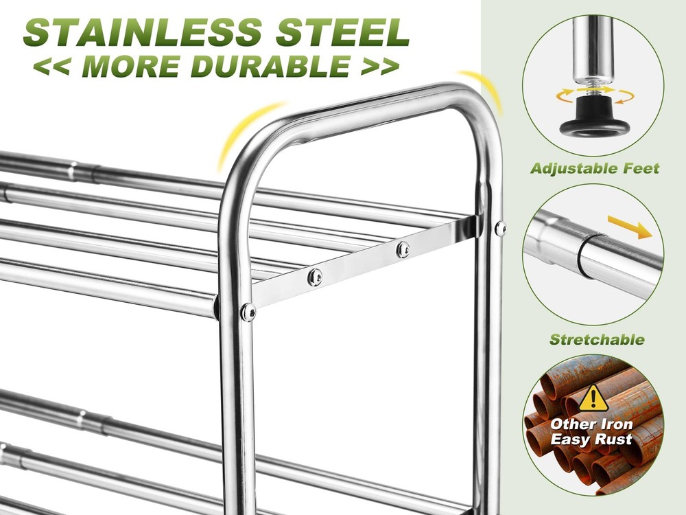 【Expandable Shoe Rack】stainless steel shoe rack adopts a expandable design to meet the requirements of different widths and increase storage space. 【Stretching Free Space】The shelf layer is composed of 4 stretching rods, so that it can store various items, and say goodbye to clutter. 【Sturdy Shoe Rack】Because all the poles are stretchable, it feels difficult to stretch the shoe rack. Don't worry, because we have prioritized the sturdiness of the shoe rack. 【Stainless Steel Material】Made of stainless steel, don't worry about rust, the shoe rack is more durable. Longest dimension: 27.1"W x 9.45"D x 12.6"H, shortest dimension: 15.1"W x 9.45"D x 12.6"H, weight: 4.08lbs/1.85kg. Note: Please use it in indoor spaces!