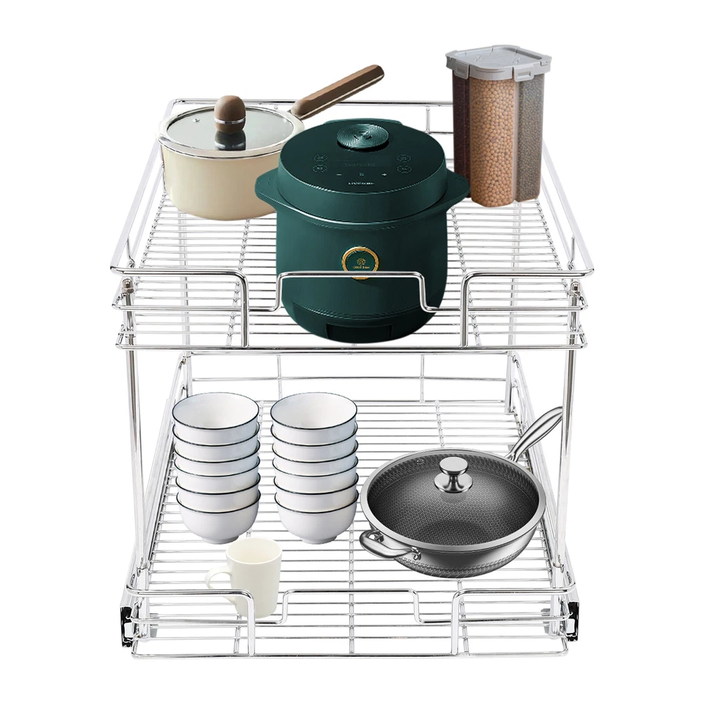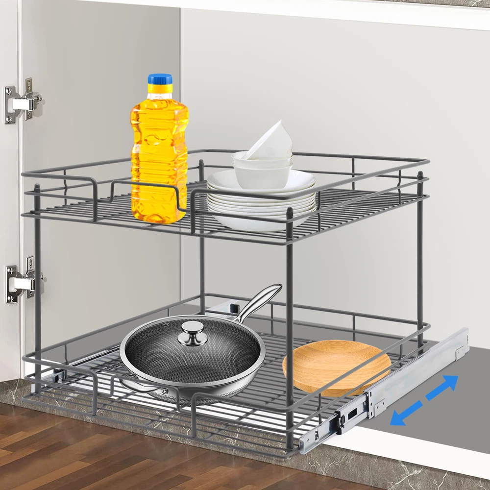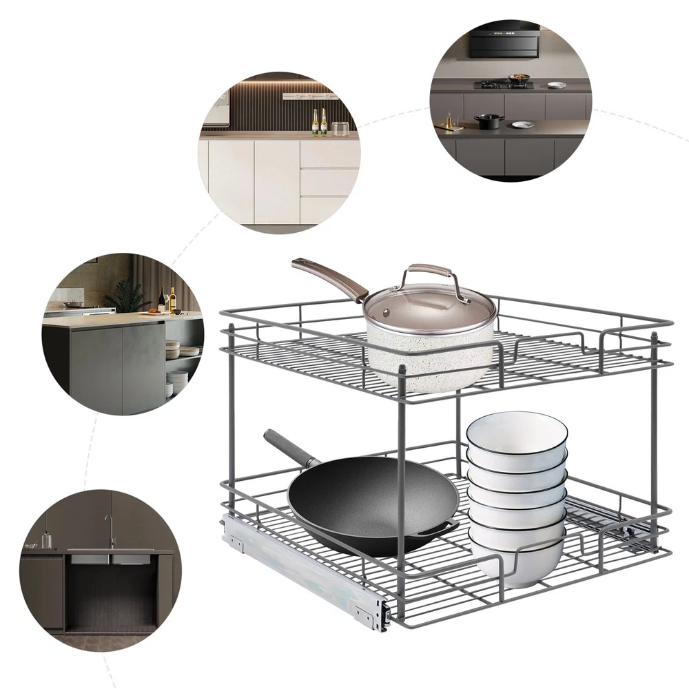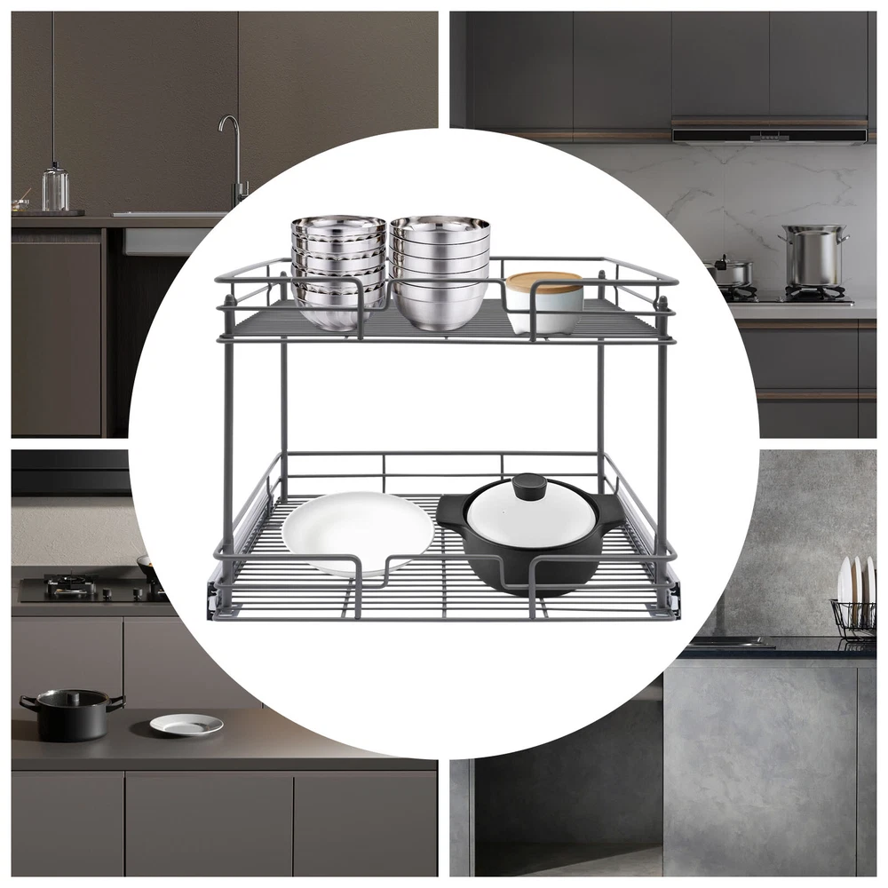 Color: Gray/Silver Width x Depth 20" W X 21" D Dimensions (W x D x H): 54.61*49.53*38.1cm/21.5*19.5*15in 17" W X 21" D Dimensions (W x D x H): 54.61*41.91*38.1cm/21.5*16.5*15in 11" W X 21" D Dimensions (W x D x H): 54.61*26.67*38.1cm/21.5*10.5*15in 14" W X 21" D Dimensions (W x D x H): 54.61*34.29*38.1cm/21.5*13.5*15in Details Raised Guardrails: Raised guardrails around the basket can prevent items from falling, making it more secure and worry-free to place. Round Edges: The arc design can effectively care for your skin compared with the traditional square corners. Rubber Rail Lock: It can prevent the basket from automatically sliding out, so when you push the basket in, be sure to snap in. Package Included 1* Pull-out Cabinet Organizer All Accessories for Installation 2-Tier Kitchen Cabinet Pull Out Shelf and Drawer Organizer Slide Out Gray/Silver Description Are you still struggling with cluttered cabinets and inadequate kitchen space? Then you can't go wrong with our pull-out cabinet organizer. It is made of high-quality iron and adopts an exquisite chrome-plating process, so it is sturdy and durable. Its pull-out design allows you to easily get items inside the cabinet, which is convenient and fast. The 2-tier basket provides you with enough space to store dishes, spices, and other items. Such a beautiful and practical pull-out cabinet is a good assistant for your kitchen. Width x Depth 20" W X 21" D Dimensions (W x D x H): 54.61*49.53*38.1cm/21.5*19.5*15in 17" W X 21" D Dimensions (W x D x H): 54.61*41.91*38.1cm/21.5*16.5*15in 11" W X 21" D Dimensions (W x D x H): 54.61*26.67*38.1cm/21.5*10.5*15in 14" W X 21" D Dimensions (W x D x H): 54.61*34.29*38.1cm/21.5*13.5*15in Features Sturdy and Durable: Premium iron and exquisite plastic spraying process make this item strong, wear-resistant, corrosion-resistant, and rust-proof, ensuring a long service life. High Load-bearing Capacity: Its thickened material and strong fixation guarantee a solid structure and a maximum load-bearing capacity of about 44.09 lbs to bear kitchen utensils with ease. Neat Storage: The 2-tier design provides you with sufficient space to neatly store bowls, spice bottles, plates, and dishes, making your kitchen tidy. What's more, the high enough tier spacing allows you to easily store tall items. Convenient Life: With two silent ball-bearing rails, this item can smoothly slide out, and you don’t have to deeply search into the cabinet when you are looking for what you need. In addition, the pull-out design can also maximize your cabinet space, making it easy to store, organize, and access your kitchen accessories, cleaning supplies, and various odds. Thoughtful Design: The hollowed-out bracket can drain the water left behind in the dishes after washing, preventing the growth of bacteria and making it more reliable to use. Easy to Install: Necessary accessories, a simple structure, and convenient hooks design allow you to quickly complete installation, saving time and effort and reducing the use of screws. Effortless Cleaning: The smooth surface and simple structure make it easy for you to clean it with a wet towel and water. Ideal Gift: The convenient pull-out design and large storage space make this item a great Christmas, New Year, and housewarming gift for your family, friends, and lovers. Customer Service: We aim to provide quality products and services. If you have any problems, please feel free to contact us. We will reply and solve the problem for you as soon as possible. Details Raised Guardrails: Raised guardrails around the basket can prevent items from falling, making it more secure and worry-free to place. Round Edges: The arc design can effectively care for your skin compared with the traditional square corners. Rubber Rail Lock: It can prevent the basket from automatically sliding out, so when you push the basket in, be sure to snap in. Application It is suitable for storing kitchen utensils such as dinner plates, bowls, spices, baking supplies, dishes, cups, essential oils, and other daily items. It is ideal for bathrooms, laundry rooms, kitchens, and pantries and can be served as an under-sink organizer, pot rack, spice rack, etc. Package Included 1* Pull-out Cabinet Organizer All Accessories for Installation Notes Please measure your cabinet opening do not include the hinge width, just measure from the hinge to the opposite side. Please do not use hard tools to clean the basket, as it may scratch the surface of the product and affect the appearance of the product. Please allow the slight color difference caused by the shooting light and 1-3 cm error due to manual measurement, and make sure you do not mind before ordering. Color: Gr ay; 20" W X 21" D Color: Gray; 17" W X 21" D Color: Silve r; 20" W X 21" D Color: Silver; 17" W X 21" D Material: Iron, Rubber Color: Gray Style: Modern Shape: Rectangle Assembly Required: Yes Number of Items: 1 Surface Treatment: Plastic Spraying Mounting Type: Cabinet Mount Number of Tiers: 2 Total Load-Bearing Capacity: About 20kg/44.09 lbs Product Size(L*W*H): 54.61*49.53*38.1cm/21.5*19.5*15in Package Size: 54*55.5*16cm/21.56*21.85*6.3in Gross Weight: 5.8kg/12.79 lbs Net Weight: 5.3kg/11.68 lbs Material: Iron, Rubber Color: Gray Style: Modern Shape: Rectangle Assembly Required: Yes Number of Items: 1 Surface Treatment: Plastic Spraying Mounting Type: Cabinet Mount Number of Tiers: 2 Total Load-Bearing Capacity: About 20kg/44.09 lbs Product Size(L*W*H): 54.61*41.91*38.1cm/21.5*16.5*15in Package Size: 45*55.5*16cm/17.72*21.85*6.3in Gross Weight: 5.4kg/11.9 lbs Net Weight: 5kg/11.02 lbs Material: Iron, Rubber Color: Silver Style: Modern Shape: Rectangle Assembly Required: Yes Number of Items: 1 Surface Treatment: Chrome-plating Mounting Type: Cabinet Mount Number of Tiers: 2 Total Load-Bearing Capacity: About 20kg/44.09 lbs Product Size(L*W*H): 54.61*49.53*38.1cm/21.5*19.5*15in Package Size: 54*55.5*16cm/21.56*21.85*6.3in Gross Weight: 5.8kg/12.79 lbs Net Weight: 5.3k