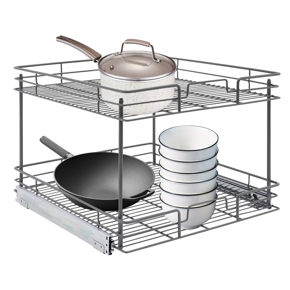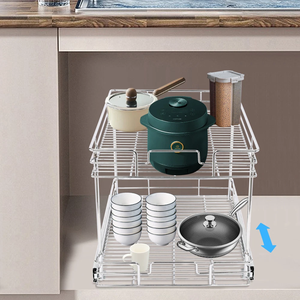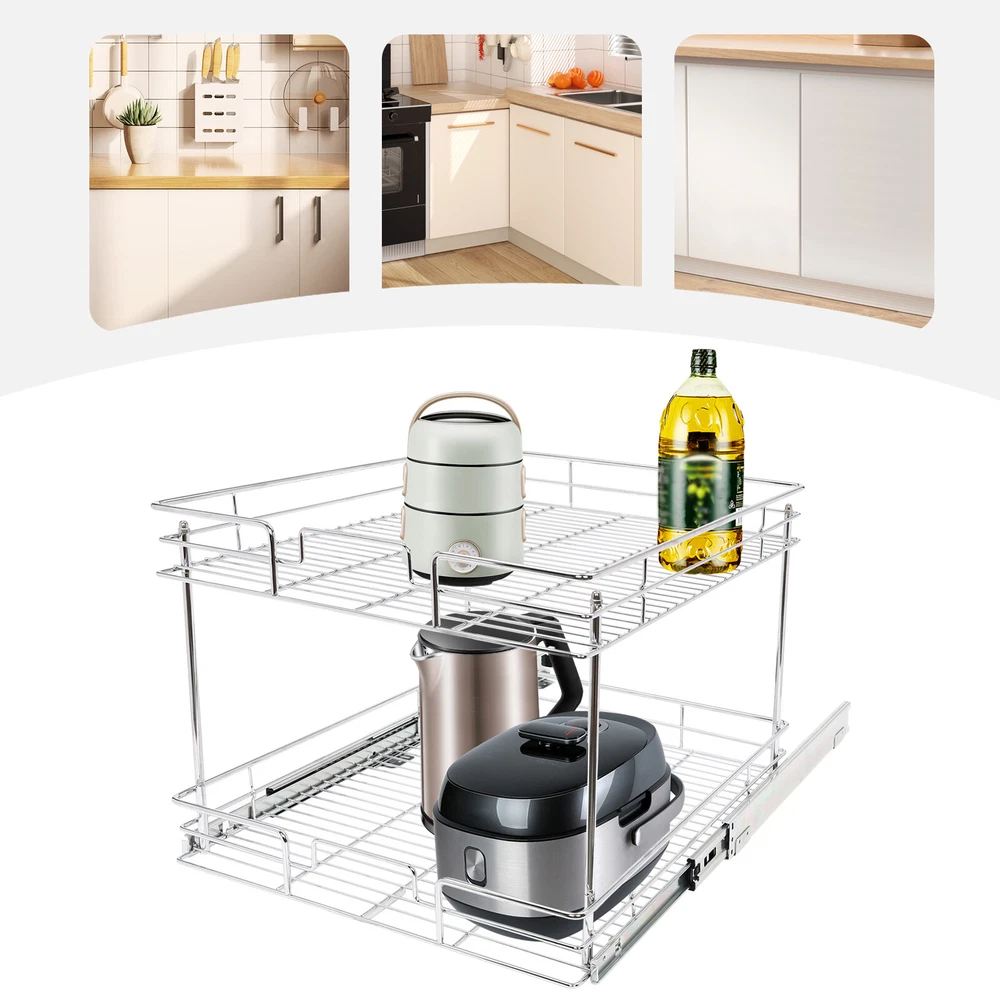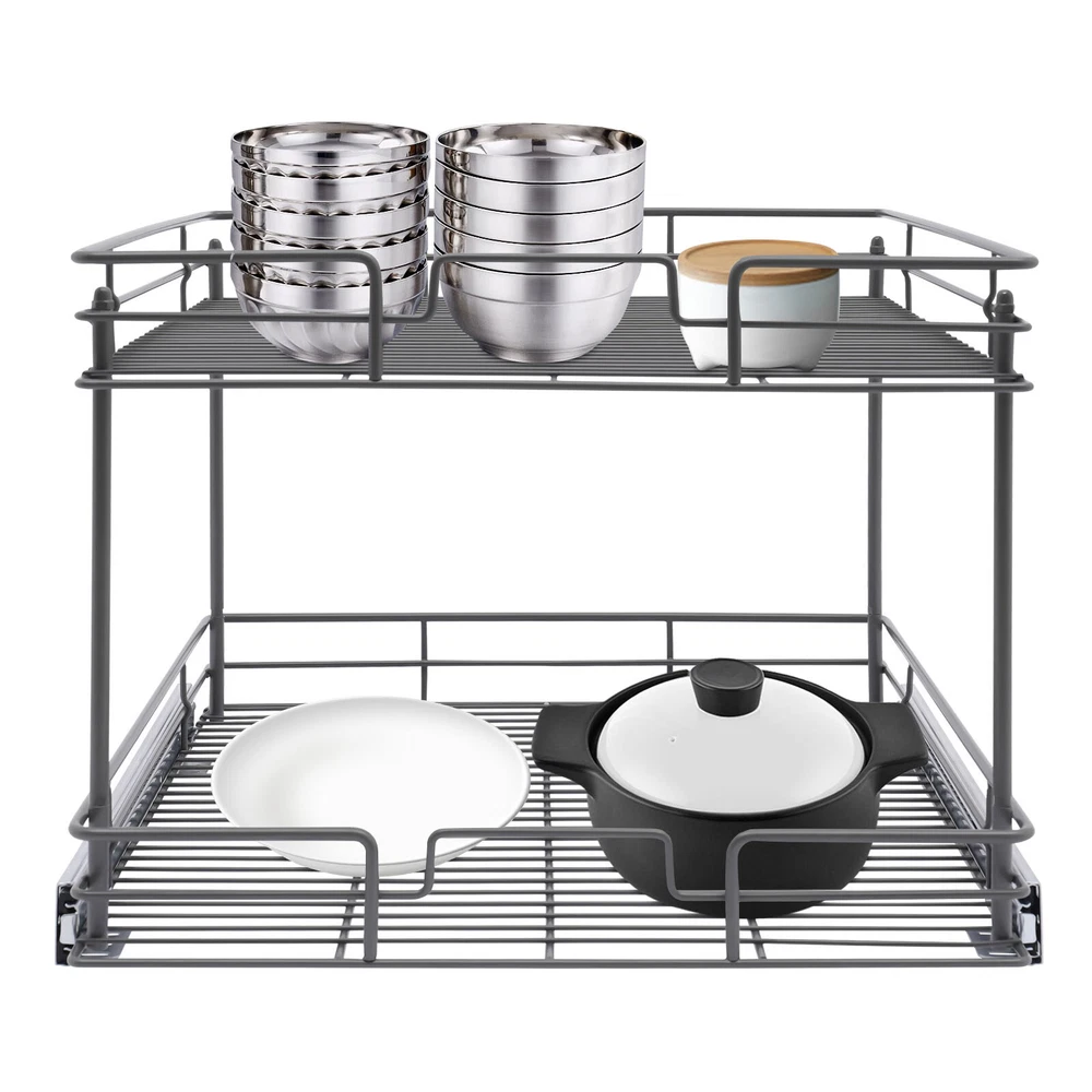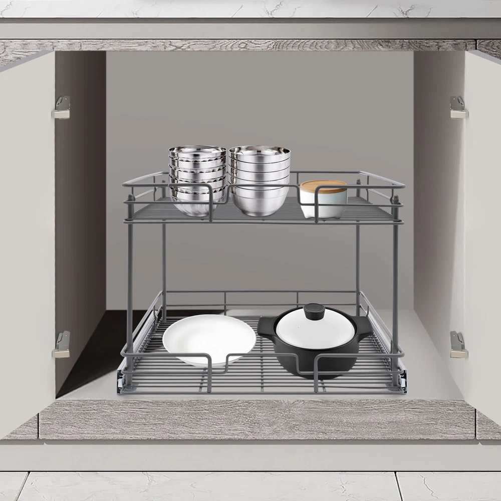Color: Gray/Silver Width x Depth 20" W X 21" D Dimensions (W x D x H): 54.61*49.53*38.1cm/21.5*19.5*15in 17" W X 21" D Dimensions (W x D x H): 54.61*41.91*38.1cm/21.5*16.5*15in 11" W X 21" D Dimensions (W x D x H): 54.61*26.67*38.1cm/21.5*10.5*15in 14" W X 21" D Dimensions (W x D x H): 54.61*34.29*38.1cm/21.5*13.5*15in Details Raised Guardrails: Raised guardrails around the basket can prevent items from falling, making it more secure and worry-free to place. Round Edges: The arc design can effectively care for your skin compared with the traditional square corners. Rubber Rail Lock: It can prevent the basket from automatically sliding out, so when you push the basket in, be sure to snap in. Package Included 1* Pull-out Cabinet Organizer All Accessories for Installation 2-Tier Kitchen Cabinet Pull Out Shelf and Drawer Organizer Slide Out Gray/Silver Description Are you still struggling with cluttered cabinets and inadequate kitchen space? Then you can't go wrong with our pull-out cabinet organizer. It is made of high-quality iron and adopts an exquisite chrome-plating process, so it is sturdy and durable. Its pull-out design allows you to easily get items inside the cabinet, which is convenient and fast. The 2-tier basket provides you with enough space to store dishes, spices, and other items. Such a beautiful and practical pull-out cabinet is a good assistant for your kitchen. Width x Depth 20" W X 21" D Dimensions (W x D x H): 54.61*49.53*38.1cm/21.5*19.5*15in 17" W X 21" D Dimensions (W x D x H): 54.61*41.91*38.1cm/21.5*16.5*15in 11" W X 21" D Dimensions (W x D x H): 54.61*26.67*38.1cm/21.5*10.5*15in 14" W X 21" D Dimensions (W x D x H): 54.61*34.29*38.1cm/21.5*13.5*15in Features Sturdy and Durable: Premium iron and exquisite plastic spraying process make this item strong, wear-resistant, corrosion-resistant, and rust-proof, ensuring a long service life. High Load-bearing Capacity: Its thickened material and strong fixation guarantee a solid structure and a maximum load-bearing capacity of about 44.09 lbs to bear kitchen utensils with ease. Neat Storage: The 2-tier design provides you with sufficient space to neatly store bowls, spice bottles, plates, and dishes, making your kitchen tidy. What's more, the high enough tier spacing allows you to easily store tall items. Convenient Life: With two silent ball-bearing rails, this item can smoothly slide out, and you don’t have to deeply search into the cabinet when you are looking for what you need. In addition, the pull-out design can also maximize your cabinet space, making it easy to store, organize, and access your kitchen accessories, cleaning supplies, and various odds. Thoughtful Design: The hollowed-out bracket can drain the water left behind in the dishes after washing, preventing the growth of bacteria and making it more reliable to use. Easy to Install: Necessary accessories, a simple structure, and convenient hooks design allow you to quickly complete installation, saving time and effort and reducing the use of screws. Effortless Cleaning: The smooth surface and simple structure make it easy for you to clean it with a wet towel and water. Ideal Gift: The convenient pull-out design and large storage space make this item a great Christmas, New Year, and housewarming gift for your family, friends, and lovers. Customer Service: We aim to provide quality products and services. If you have any problems, please feel free to contact us. We will reply and solve the problem for you as soon as possible. Details Raised Guardrails: Raised guardrails around the basket can prevent items from falling, making it more secure and worry-free to place. Round Edges: The arc design can effectively care for your skin compared with the traditional square corners. Rubber Rail Lock: It can prevent the basket from automatically sliding out, so when you push the basket in, be sure to snap in. Application It is suitable for storing kitchen utensils such as dinner plates, bowls, spices, baking supplies, dishes, cups, essential oils, and other daily items. It is ideal for bathrooms, laundry rooms, kitchens, and pantries and can be served as an under-sink organizer, pot rack, spice rack, etc. Package Included 1* Pull-out Cabinet Organizer All Accessories for Installation Notes Please measure your cabinet opening do not include the hinge width, just measure from the hinge to the opposite side. Please do not use hard tools to clean the basket, as it may scratch the surface of the product and affect the appearance of the product. Please allow the slight color difference caused by the shooting light and 1-3 cm error due to manual measurement, and make sure you do not mind before ordering. Color: Gr ay; 20" W X 21" D Color: Gray; 17" W X 21" D Color: Silve r; 20" W X 21" D Color: Silver; 17" W X 21" D Material: Iron, Rubber Color: Gray Style: Modern Shape: Rectangle Assembly Required: Yes Number of Items: 1 Surface Treatment: Plastic Spraying Mounting Type: Cabinet Mount Number of Tiers: 2 Total Load-Bearing Capacity: About 20kg/44.09 lbs Product Size(L*W*H): 54.61*49.53*38.1cm/21.5*19.5*15in Package Size: 54*55.5*16cm/21.56*21.85*6.3in Gross Weight: 5.8kg/12.79 lbs Net Weight: 5.3kg/11.68 lbs Material: Iron, Rubber Color: Gray Style: Modern Shape: Rectangle Assembly Required: Yes Number of Items: 1 Surface Treatment: Plastic Spraying Mounting Type: Cabinet Mount Number of Tiers: 2 Total Load-Bearing Capacity: About 20kg/44.09 lbs Product Size(L*W*H): 54.61*41.91*38.1cm/21.5*16.5*15in Package Size: 45*55.5*16cm/17.72*21.85*6.3in Gross Weight: 5.4kg/11.9 lbs Net Weight: 5kg/11.02 lbs Material: Iron, Rubber Color: Silver Style: Modern Shape: Rectangle Assembly Required: Yes Number of Items: 1 Surface Treatment: Chrome-plating Mounting Type: Cabinet Mount Number of Tiers: 2 Total Load-Bearing Capacity: About 20kg/44.09 lbs Product Size(L*W*H): 54.61*49.53*38.1cm/21.5*19.5*15in Package Size: 54*55.5*16cm/21.56*21.85*6.3in Gross Weight: 5.8kg/12.79 lbs Net Weight: 5.3k