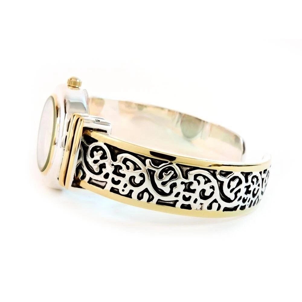 Beautiful 2Tone Western Style Bangle Cuff Watch by STC. The band is about 0.5 inches (14 mm) wide that will open to fit all wrists from 6.5 to 7.5 inches. The surrounding case is polished finish and has a white dial with gold hands and hours. \n\nCase Size is about 1x1.25 inch (27x32 mm)\nFits All Wrists from 6.5 to 7.5 Inches\nBand Width: 0.5 inch (14 mm)\nDecorated Band\nJapan Quartz Movement\n \n 2Tone Western Style Decorated Oval Face Womens Bangle Cuff Watch Beautiful 2Tone Western Style Bangle Cuff Watch by STC. The band is about 0.5 inches (14 mm) wide that will open to fit all wrists from 6.5 to 7.5 inches. The surrounding case is polished finish and has a white dial with gold hands and hours. Case Size is about 1x1.25 inch (27x32 mm) Fits All Wrists from 6.5 to 7.5 Inches Band Width: 0.5 inch (14 mm) Decorated Band Japan Quartz Movement < Product Attributes: Weight (lbs.) : 0.02 lb UPC: 00748296887744 Brand: ANT
