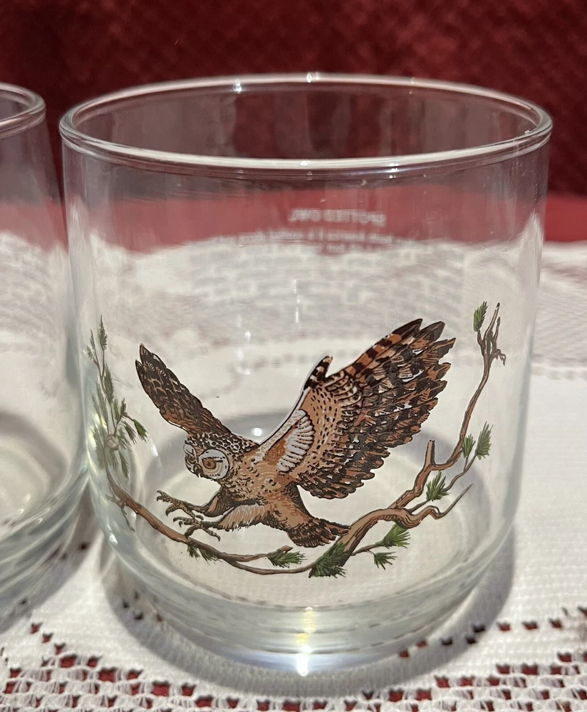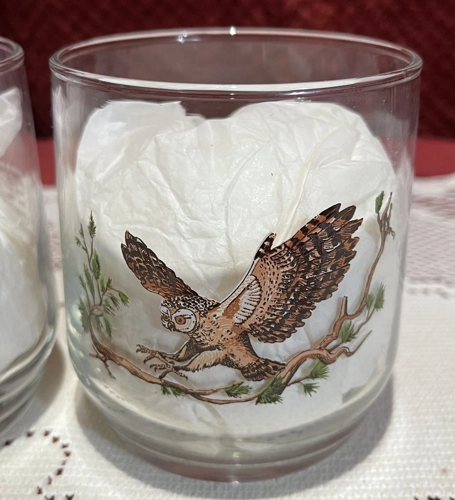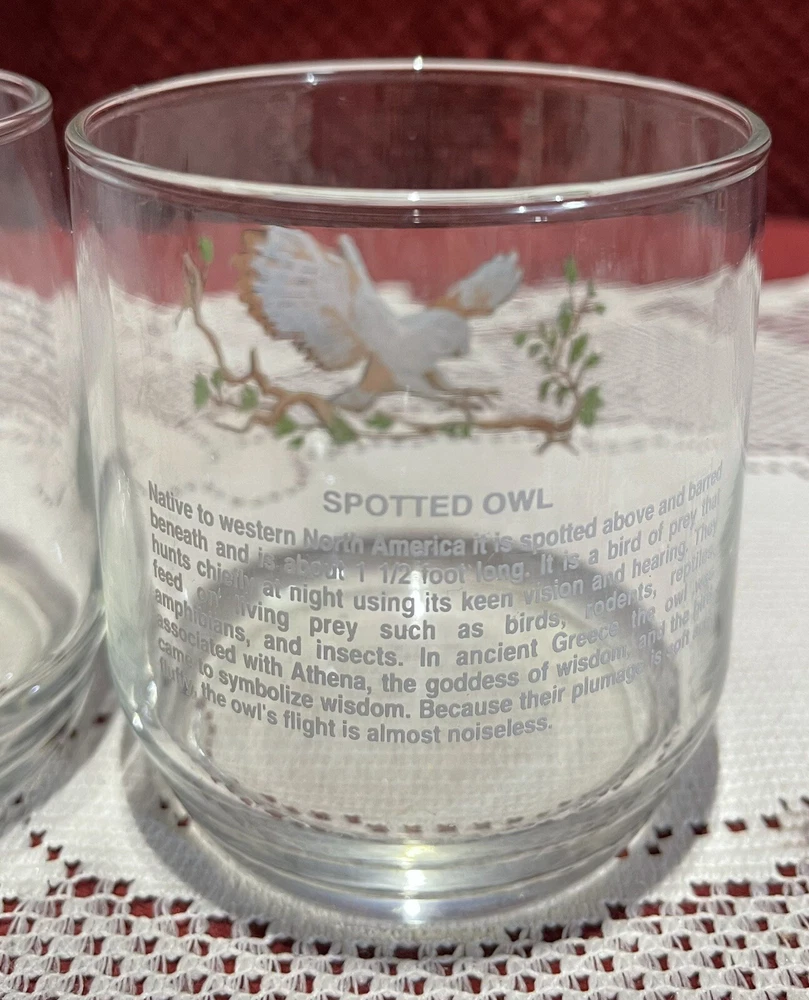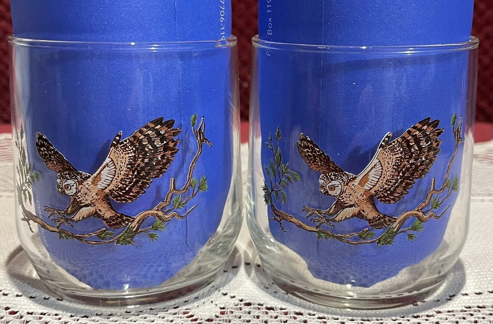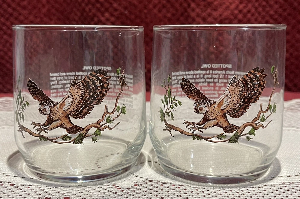 Add a touch of vintage charm to your collection with this 90's Libbey Sunoco American Wildlife Series "Spotted Owl" Drinking Glass. The set of 2 clear glass showcases a beautiful spotted owl design and is perfect for use or display. Made in the United States, this original piece of advertising memorabilia is a must-have for collectors of gas and oil company items. The glass is ideal for use as a drinking glass or as a decorative piece in your home bar or collection. Don't miss out on the opportunity to own this unique and original piece of Sunoco history. This is a set of two. 3 5/8” tall x 3 1/4” in diameter. All reasonable offers will be considered. Please see pictures for the exact items.
