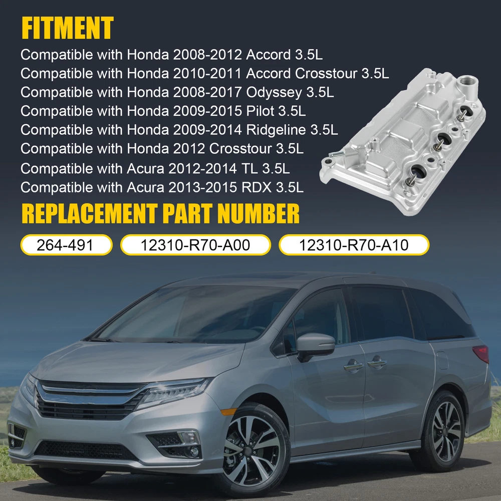 2X Aluminum Engine Valve Cover For Honda Odyssey Pilot Ridgelin Accord 3.5L Item Details Applicable For : 2008-2012 Honda Accord 3.5L SOHC NA 2010-2011 Honda Accord Crosstour 3.5L SOHC NA 2012-2012 Honda Crosstour 3.5L SOHC NA 2008-2017 Honda Odyssey 3.5L SOHC NA 2009-2015 Honda Pilot 3.5L SOHC NA 2009-2014 Honda Ridgeline 3.5L SOHC NA 2012-2014 Acura TL 3.5L V6 2013-2015 Acura RDX 3.5L V6 Replaces OE Part Number: Front Side: 12310R70A00, 12310-R70-A00, 12310-R70-A10, 12310R70A10 Rear Side: 12320R70A00, 12320-R70-A00 Package included : 2 * Engine Valve Cover 2 * Gaskets ITEM SKU. : F987-A00+F988-A10-M7 1. Constructed from high quality materials for a long service life,Corrosion Resistant 2. Direct replacement for a proper fit every time, Instruction is not included. 3. It is recommended that professional personnel install it Note: Please check your original part number. This is the best way to confirm the fitment. Aftermarket Brand. 1 Year Parts Warranty Top Quality + Quick Delivery Please ensure this item fits your car, Professional installation is recommended Even if your car is shown in the eBay compatibility guide you must read the description and any notes carefully. Please double check that the photo match the product you are replacing We ship our items to USA only(Does NOT include Hawaii,Alaska or Puerto Rico, PO Boxes/APO's ) We have multiple warehouses in US,and will choose the nearest one for shipping,according to your address and our inventory Payment Delivery details Return Warranty Contact us Payment We accept payment by paypal. Delivery details We send our products within 3 business days. Return Buyers pay the return shipping cost for exchange or refund. Sellers pay the return shipping cost for quality problem. For replacements, please notice us within 5 days after you receiving the item. Item must be returned in original packing same as reached Any installation or other fees are non-refundable. Warranty This item has 1 year warranty. In the event the of the item fail due to manufacturing defects during intended use, we will replace the part by free. We only warranty cost of item parts. Any installation or other fees are non-refundable. Note: Any modifying the item of any kind without contacting us will void any and all warranty coverage for this item. Please contact us before modifying the part so that we have the opportunity to correct the situation. Contact us If you have any question, please contact me with ebay message. Brand speedmotor2012 Type Valve Cover Set Material Aluminum Color Silver Manufacturer Part Number 004-333-W+004-334-W OE/OEM Part Number 12310-R70-A00, 12320-R70-A00 Finish Painted Items Included Gasket Manufacturer Warranty 1 Year Interchange Part Number 12310R70A10, 12310R70A00, 12320R70A00 Superseded Part Number 12310-R70-A10, 12310R70A10 California Prop 65 Warning WARN Country/Region of Manufacture China Fitment 1 2008-2012 Honda Accord 3.5L SOHC NA Fitment 2 2010-2011 Honda Accord Crosstour 3.5L SOHC NA Fitment 3 2012-2012 Honda Crosstour 3.5L SOHC NA Fitment 4 2008-2017 Honda Odyssey 3.5L SOHC NA Fitment 5 2009-2015 Honda Pilot 3.5L SOHC NA Fitment 6 2009-2014 Honda Ridgeline 3.5L SOHC NA Fitment 7 2012-2014 Acura TL 3.5L V6 Fitment 8 2013-2015 Acura RDX 3.5L V6