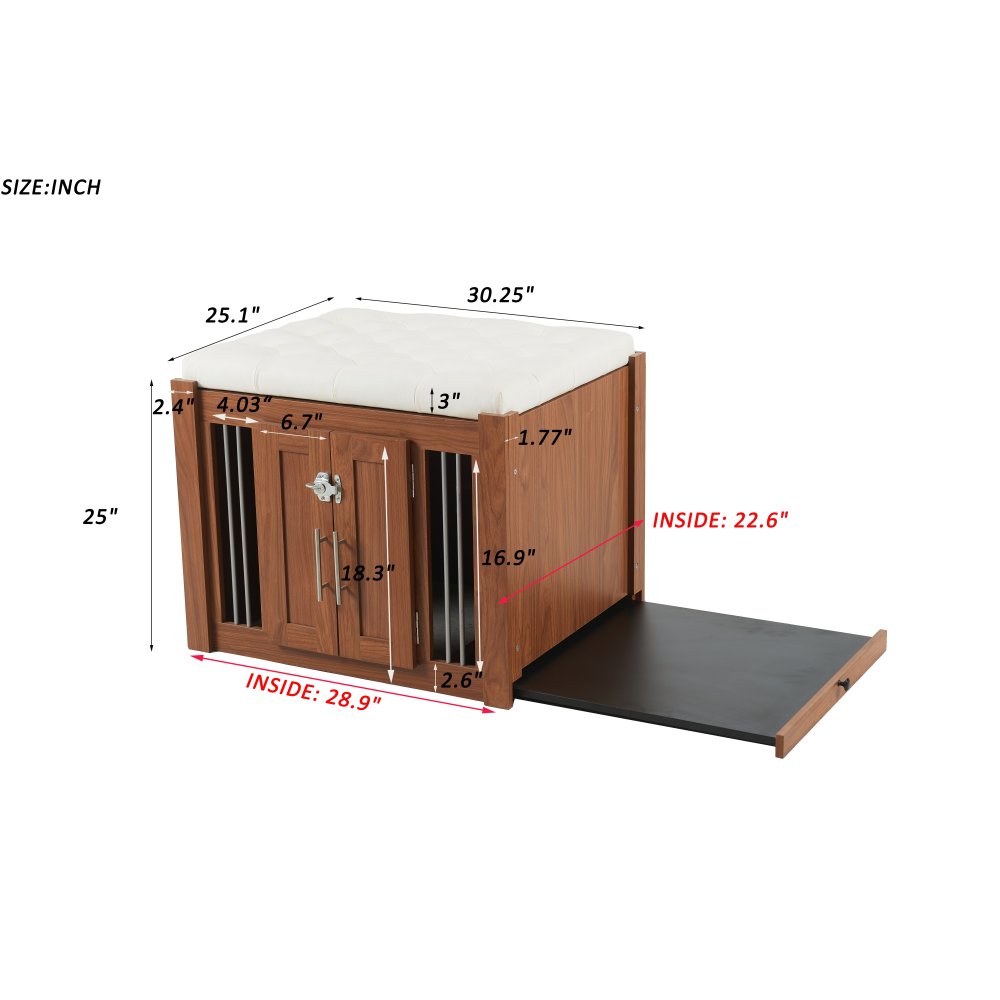 MULTI-USAGE AND VINTAGE DESIGN: Our multi-functional dog crate end-bench combines elegance and practicality. This unique piece of furniture doubles as a comfortable seating area and a secure pet space, effectively utilizing your living area. COMFY AND ROBUST SEATING: This wooden dog ottoman comes equipped with a high quality easy clean cushion, offering a comfortable seating option. Whether you're taking a break or putting on your shoes, this sturdy structure can handle up to 300 lbs, promising durability. DURABLE METAL AND DESIGNED LOCKER: This Pet Friendly ottoman features specially designed style buckles and sturdy, durable metal components that make it easy and safe for both you and your pet to use. MOVABLE BASE WITH WHEELS: This product is equipped with a movable base featuring wheels, providing convenient functionality and making it easier to clean and maintain. ROOMY AND SAFE: The bench dog ottoman measures 30.25"L x 25.1"W x 25"H, providing ample internal space of 28.9"L x 22.6"W, suitable for small to medium dogs. It features a designed sturdy vintage door with black metal locks and handles, ensuring easy access and safety for your pet. The steel bars offer excellent ventilation and visibility, making a comfy space for your pet. EASY UPKEEP: This dog crate bench design prioritizes your convenience. With a removable cushion and easily accessible doors, cleaning and maintenance are effortless, promoting a clean living space for your pet. MORE APPLICATIONS: May in various home space, as a organizer, decor piece, storage solution, it is very stylish and cozy. EFFORTLESS ASSEMBLY: We strive to make assembly as smooth as possible. Detailed instructions and essential hardware are provided for an easy assembly journey. DETAIL&CARE Product Dimensions 30.25”L x 25.1”W x 25”H, 64.46 LBS Package Size 34”L x 27.5”W x 9”H, 68.45 LBS Material Particle Board+MDF Style Mid-Century Modern Color Walnut Indoor Outdoor Usage Indoor Country of Origin CHINA About Finish Liquids should be immediately blotted with a damp cloth. Do not use surface cleaners that could remove the finish. About Hardware Hardware may loosen over time; periodically check to make sure all connections are tight. About Color Real Product's Color may be a little different from the image due to the different lighting or monitor's display. MORE APPLICATIONS May in various home space, as a organizer, decor piece, storage solution, it is very stylish and cozy. COMFY AND ROBUST SEATING This wooden dog ottoman comes equipped with a high quality easy clean cushion, offering a comfortable seating option. Whether you're taking a break or putting on your shoes, this sturdy structure can handle up to 300 lbs, promising durability. DURABLE METAL AND DESIGNED LOCKER This Pet Friendly ottoman features specially designed style buckles and sturdy, durable metal components that make it easy and safe for both you and your pet to use. MOVABLE BASE WITH WHEELS This product is equipped with a movable base featuring wheels, providing convenient functionality and making it easier to clean and maintain.
