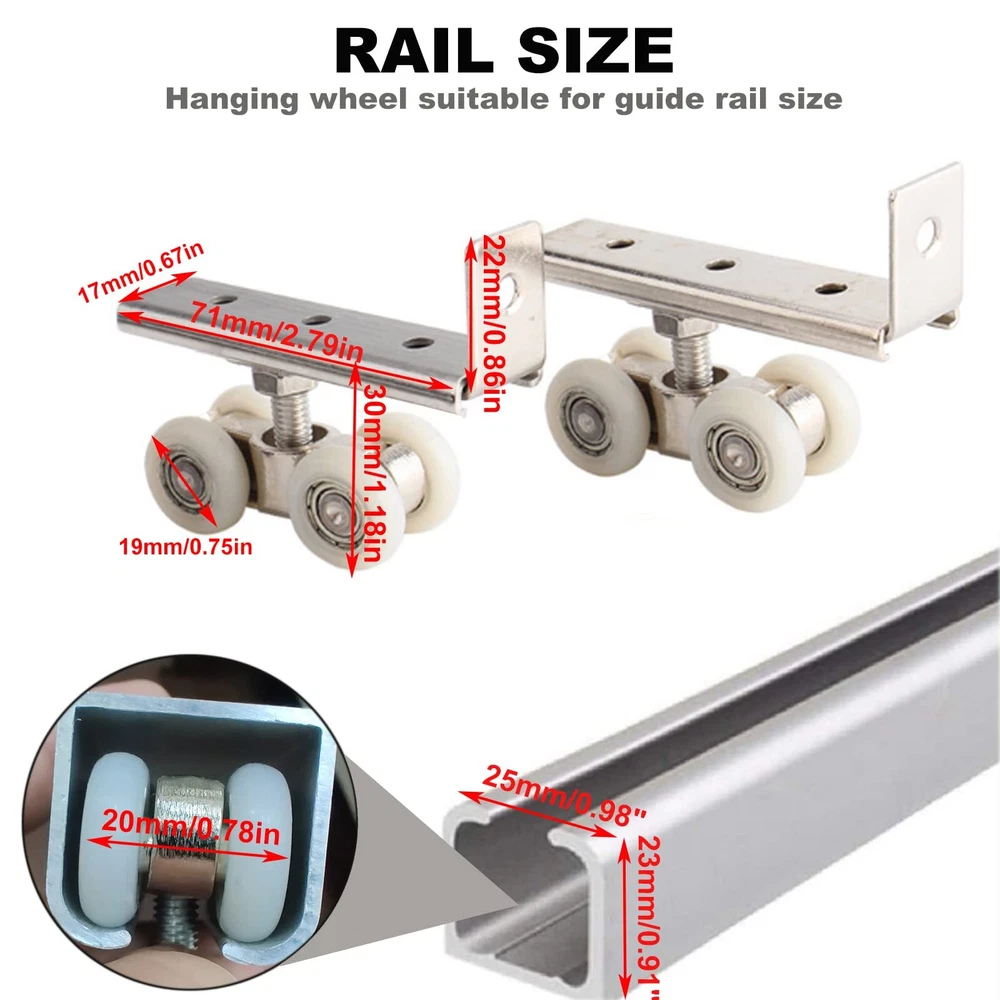 Color: as shown Material: stainless steel + nylon Wheel diameter: 19mm/0.75" Wheel size: 47 * 20mm / 1.85 * 0.79" Scope of application: suitable for 23mm (0.91) ") hanging rail Package content: 2* wardrobe door hanging wheel 100% brand new and high quality. Material: made of alloy + nylon, resistant to compression and compression, smooth sliding, flexible operation, silent shaft The built-in high bearings and metal bearings keep the suspension wheels balanced under load. Screw hole workmanship, clear lines. Insert the screw into the hole to secure the tab. Sliding door roller is a good accessory for furniture, wardrobe, closet, small door, furniture and so on.