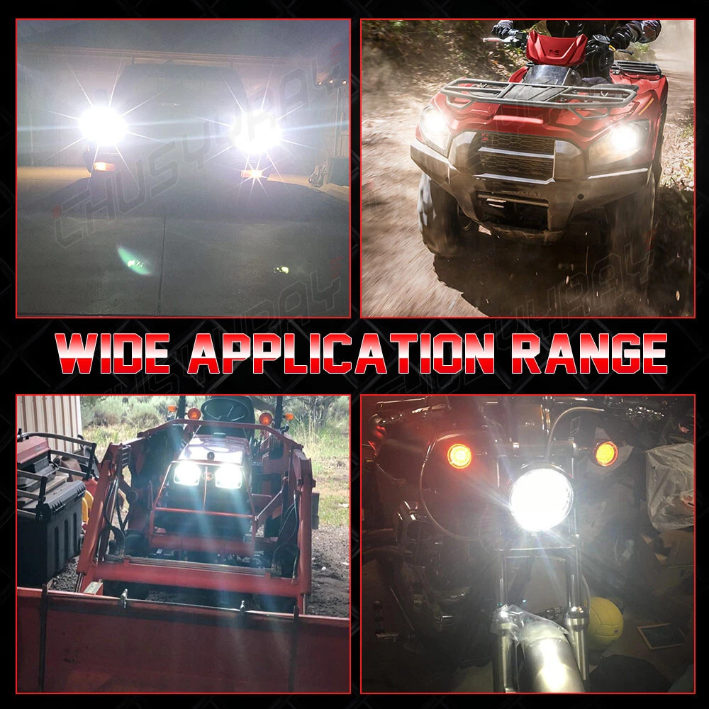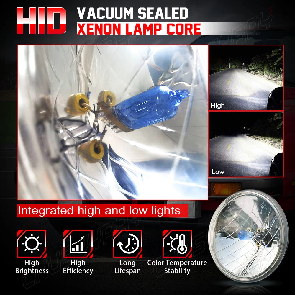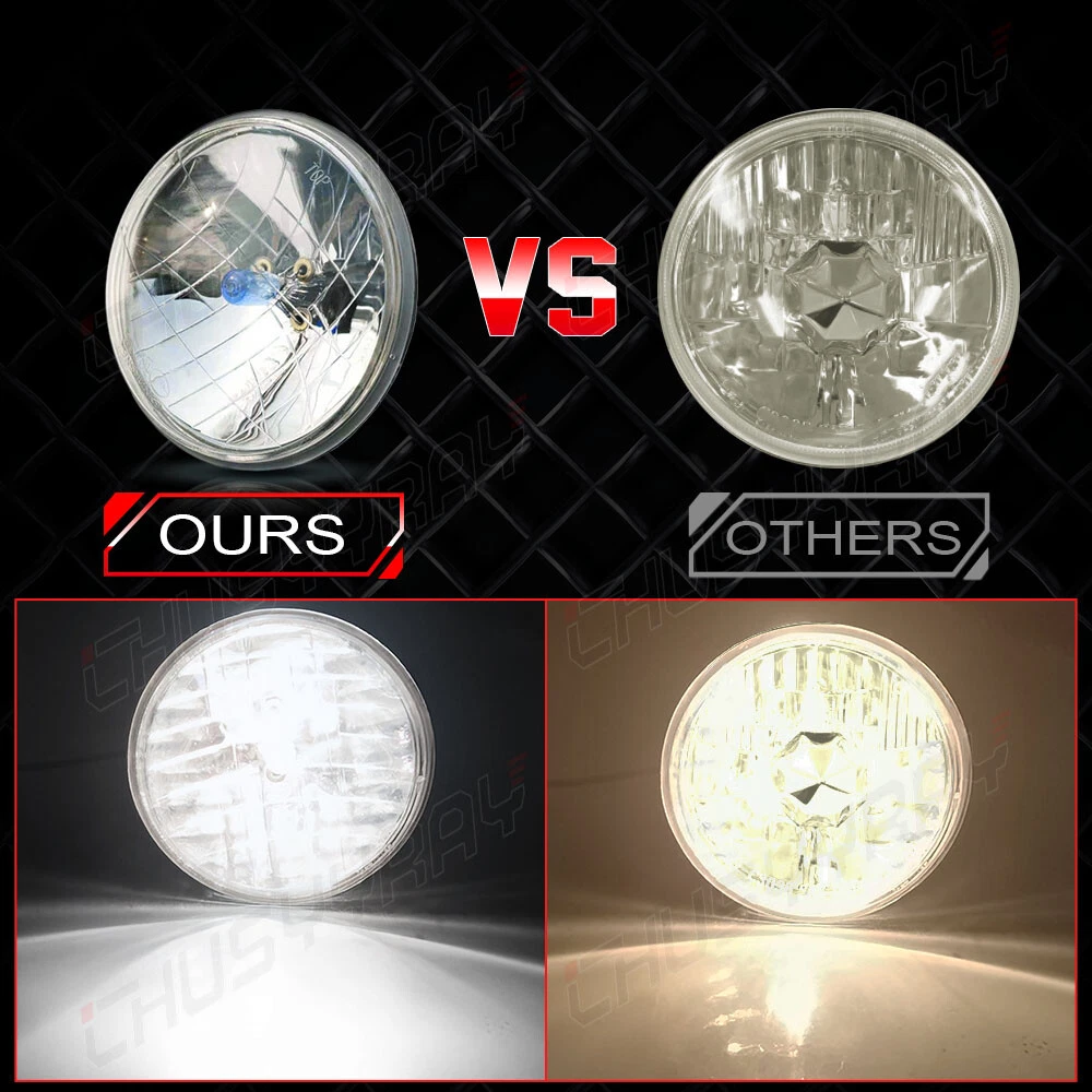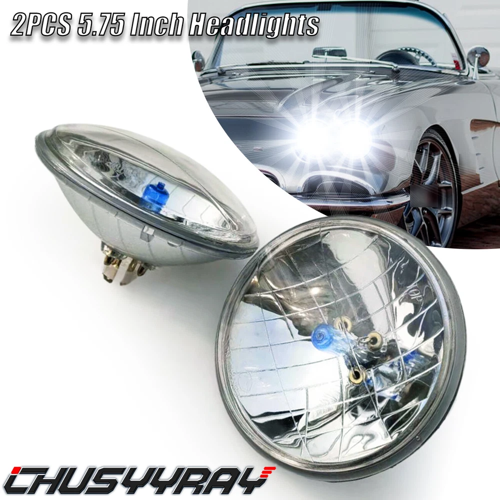 THESE ARE HALOGEN SEMI-SEALED BEAM STOCK STYLE GLASS FACED HEADLIGHTS WITH METAL BACKSIDES! REPLACEABLE SUPER WHITE 100/130 W HALOGEN H4 BULBS INCLUDED! Stock Style H4 Replacement Upgrade Headlights Pair - High Beam Headlight Pair 100/130W Dual Beam Super White Halogen Bulbs Glass Lens / Metal Backside DOT SAE Approved This listing is for 2 pcs new 5-3/4" stock style glass faced halogen H4 conversion headlight bulbs. These halogen semi-sealed beam headlights look almost the same as the original headlights your vehicle came with when it was new, except these light up 200% brighter then the stock style incandescent bulbs and take a replaceable 100/130W super white H4 bulbs. These have the original shaped prongs on the back so they will plug right into your original wiring harness plugs. These have the correct locating tabs on the backside to clock properly into the high beam headlight buckets. These are correct for any car or truck that has 2 round glass headlights. Each bulb is 5 3/4 inches in diameter. DOT SAE approved. Notes: 1. 100% Brand New in the box with manufacturer packaging, never been installed before. 2. Factory bolt-on OE fitment, no vehicle modifications are required; or replacement for the stock unit. 3. No installation guide or instruction included, professional installation recommended. 4. We Provide 60 day manufacturer warranty after you received this Item. Product Features: 1. Great upgrade for your vehicles exterior looks. 2. Direct replacement of the original lights, no modification needed,A great upgrade for your vehicle. 3. Precision optics offers a highly controlled concentration of light to enhance visibility. 4. Enhance visibility during night time, heavy rain, snow, or dense fog. 5. High quality OE grade materials to withstand the most rigorous weather conditions. 6. The Halogen bulbs are included. H4 bulb is compatible with the headlight. Package Includes: 2x Headlight (Pair Passenger and Driver Side) with Halogen Bulbs On Nov 13, 2024 at 01:54:05 PST, seller added the following information: