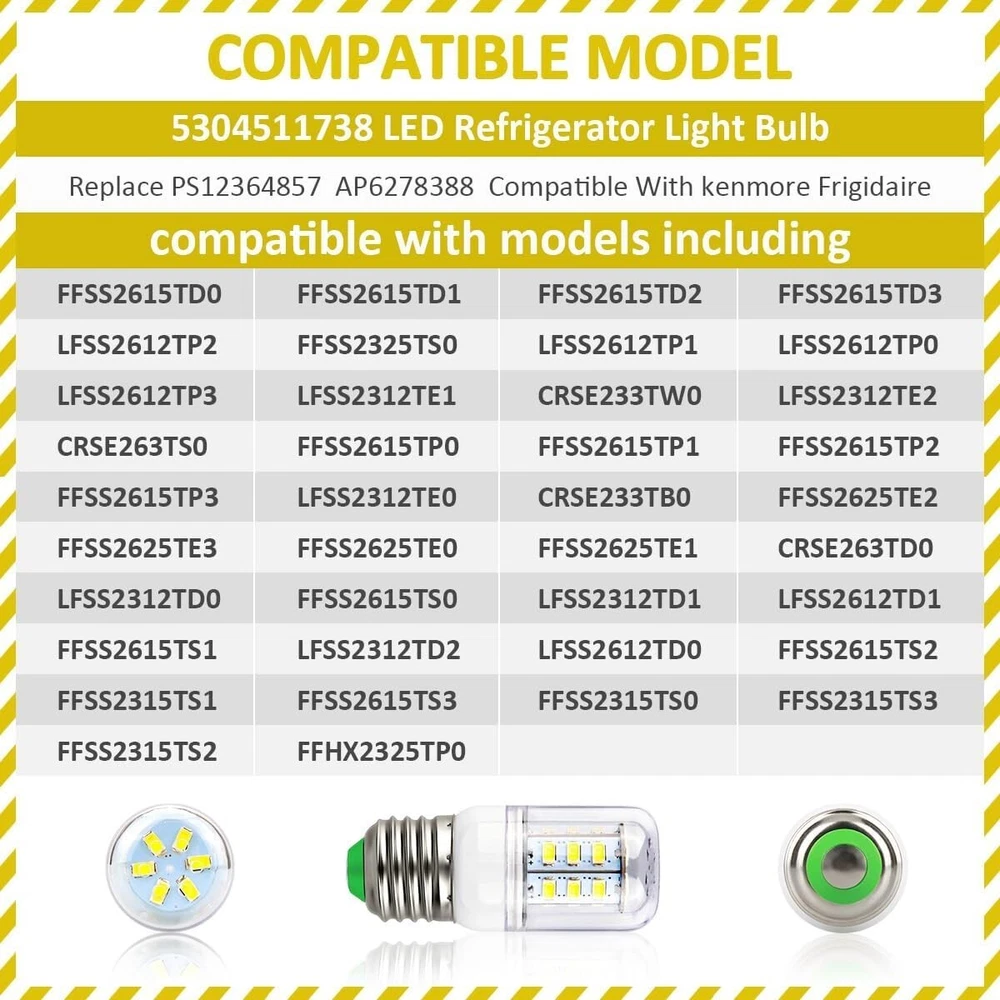 Power:Less than 200 WFeatures:LED LightingSet Includes:2pcs LED Refrigerator Light Corn BulbUPC:Does not applyCompatible Model:Frigidaire, Electrolux, KenmoreMPN:5304511738, PS12364857, AP6278388, 4584444Personalize:NoCompatible Brand:Frigidaire, Electrolux, Kenmore物品状况:全新: A brand-new,unused,unopened,undamaged item in its original paColor:WhiteFinish:Glassgtin13:Does not applyBrand:SUMNEWMaterial:GlassType:LED Refrigerator Light Corn BulbCountry/Region of Manufacture:ChinaNumber of Items in Set:2Installation:FreestandingPower Source:ElectricManufacturer Warranty:3 Months