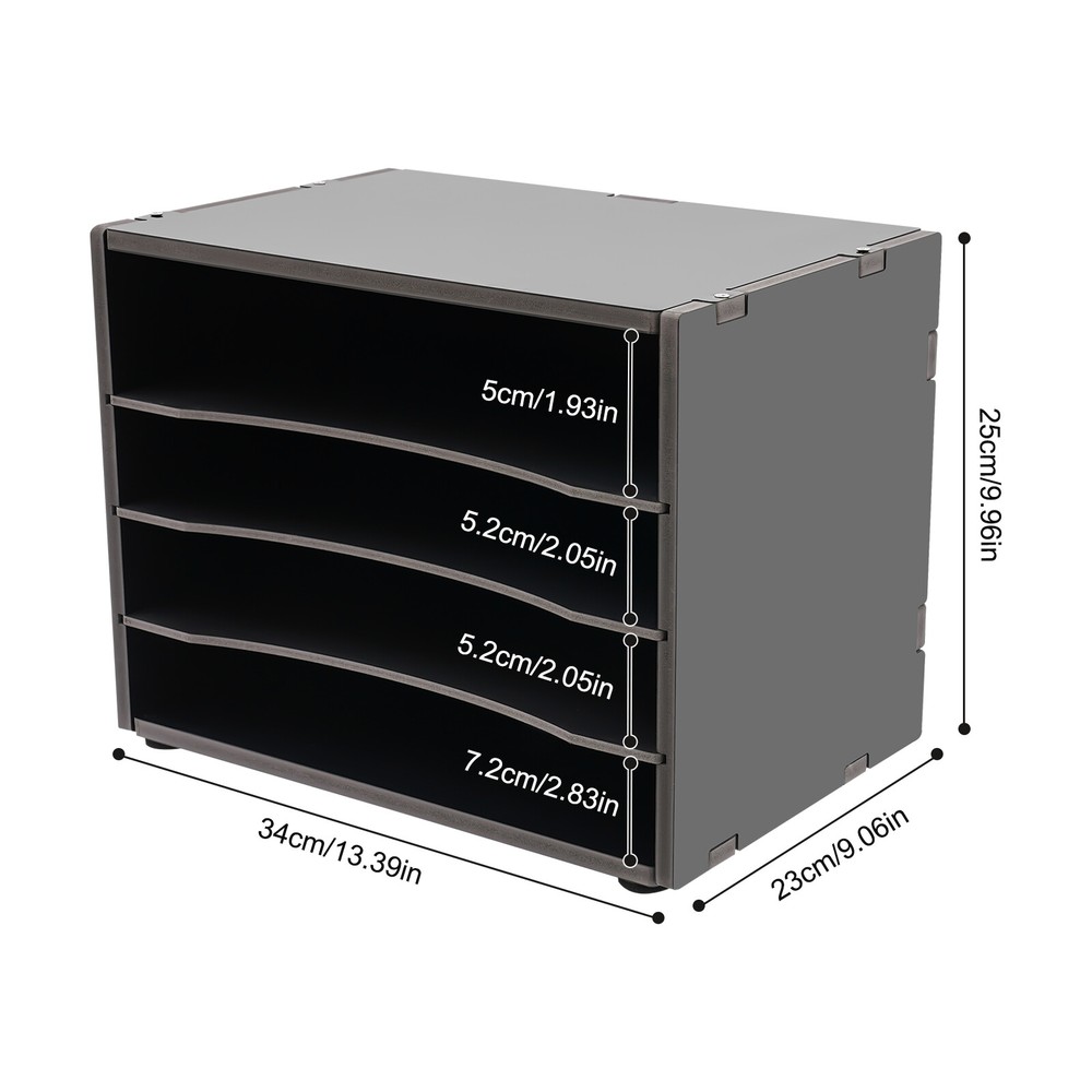 Specification Color: Black Style: Modern Shape: Rectangular Material: PVC Board Process: Engraving Number of Items: 2 Number of Compartments: 4 Assembly Required: Yes Compartment Size: 34*23*5cm/13.39*9.06*1.93in 34*23*5.2cm/13.39*9.06*2.05in 34*23*5.2cm/13.39*9.06*2.05in 34*23*7.2cm/13.39*9.06*2.83in Net Weight: 1.5kg/ 3.31lbs Gross Weight: 2kg/ 4.41lbs Product Size: 34*23*25cm/13.39*9.06*9.96in Package Size: 36*26*7cm/14.17*10.24*2.76in Package Include 2* Desktop Organizers 1* English Installation Diagram 1* Sandpaper All Accessories for Assembly 2pcs Desktop Organizer W/4-Compartment Modern Removable Desktop File Holder Description This desktop organizer keeps information, files, and items organized and each compartment leaves plenty of room for all your files, maximizing storage space. The PVC eco-friendly material used in this product gives you peace of mind. It's a professional and caring addition to your office! Key Features Sturdy and Durable : This desktop organizer is made of PVC board with engraving process, which is anti-corrosion and anti-rust, and can support you to use it for a long time. Spacious Storage : The 4 compartments of different sizes provide you with enough sorting space for documents, pamphlets, or books, allowing you to organize your office files and make them easy to find and access. In addition, the spacious desktop can also hold potted plants, mugs, decorations, and more to keep your office neat and organized. Thoughtful Design : The partition can be removed to store tall items. You can design your cabinet layout to create compartments that best suit your needs. The semi-open design is not only convenient to access but also conducive to ventilation and drying and makes the documents not easy to accumulate dust. Effortless to Clean : The smooth surface allows easy wiping of stains and marks on the tops, creating a clean and healthy working environment for you. Easy to Assemble : Simple construction, complete accessories, and an English installation diagram help you achieve a quick installation, you just need to make sure all parts are properly nested. Simple and Elegant : The simple black makes it both elegant and stylish, which is very adaptable to most use scenarios and can blend with any decorative style, making it an ideal addition to your office. Protective Packaging : The strong box and bubble bags provide comprehensive protection for products to ensure that it is fully delivered to you to the greatest extent possible. Guaranteed Customer Service: We aim to provide quality products and services. If you have problems, please feel free to contact us. We will reply and solve the problem for you as soon as possible. Details Anti-slip Pads : They can maintain the stability of the product without displacement, and protect the floors from scratches. Sanding Paper: This product comes with sandpaper, so if you find some of the edges a little scratchy you can sand them yourself. Application It can be used to organize student assignments, books, magazines, files, brochures, and forms in restaurants, churches, classrooms, seminars, families, schools, study rooms, cafes, homes, companies, and reception areas. Specification Color: Black Style: Modern Shape: Rectangular Material: PVC Board Process: Engraving Number of Items: 2 Number of Compartments: 4 Assembly Required: Yes Compartment Size: 34*23*5cm/13.39*9.06*1.93in 34*23*5.2cm/13.39*9.06*2.05in 34*23*5.2cm/13.39*9.06*2.05in 34*23*7.2cm/13.39*9.06*2.83in Net Weight: 1.5kg/ 3.31lbs Gross Weight: 2kg/ 4.41lbs Product Size: 34*23*25cm/13.39*9.06*9.96in Package Size: 36*26*7cm/14.17*10.24*2.76in Package Include 2* Desktop Organizers 1* English Installation Diagram 1* Sandpaper All Accessories for Assembly Notes Please place the product in a dry, shady, and well-ventilated place. Please allow the slight color difference caused by the shooting light and 1-3cm error due to manual measurement and make sure you do not mind before ordering. Payment Delivery details Terms of sales About us Contact us Payment We accept ebay payment 。 Fees such as import duties, taxes are not included in the item price or shipping costs. These charges are the buyer's responsibility. Delivery details Shipping: 2-9 working days to: USA Terms of sales We maintain high standards of excellence and strive for hundred percent customer satisfaction. Feedback is very important to us. We hope that you contact us immediately before you give neutral or negative feedback, so that we can address your concerns. It is impossible to address issues if we do not know about them! About us Your satis faction is our ultimate goal. We work hard to earn your trust and future business. Our certified technicians have tested each item before shipping. The unit comes with 1 year limited warranty on all manufacturing defects. a) If you receive a defective item, you may return it or ask for a discount. Please contact us within 14 days after you receive the package. b) What you returned must be intact and in its original packaging as re? u. Customer is responsible for shipping costs of the returned item. c) We will cover the cost of shipping back t with the shipping rate indicated in the registration page. We will send you a new unit or refund the full payment you paid. Thank you. Contact us Business Hour Business Hour: Monday To Friday: 8:30 AM to 5:00 PM (Beijing China time) Due to time zones, our reply to your questions may not be immediately. But within above working time, we will reply your email within 24 hours. If it's non-workdays, please kindly be patient and wait till Monday. Please contact us with ebay message. Please feel free to contact us if you have any questions. Monday To Friday: 8:30 AM to 5:00 PM (Beijing China time) Due to time zones, our reply to your questions may not be immediately. But within above working time, we will reply your email within 24 hours. If it's non-workdays, please kindly be patient and wait till Monday. Please contact us with eba