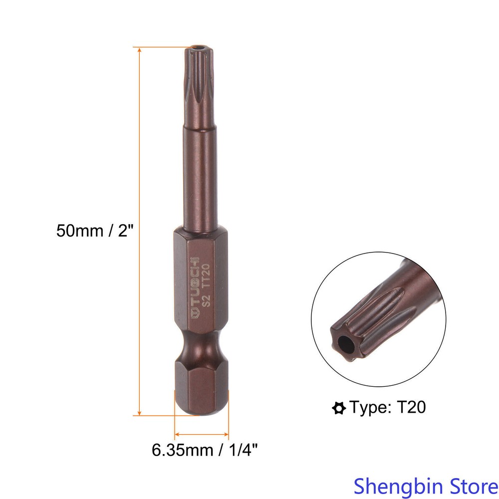 2pcs T20 Magnetic Security Torx Screwdriver Bit 1/4" Hex Shank 2" Length, Red 1. An excellent replacement for lost, bent or broken Torx tamper-resistant screwdriver bits. 2. Made of S2 alloy steel (heat-treated to HRC60°), which is a high-hardness material commonly used in hardware. Copper paint finish prevents rust and corrosion. 3. The magnetic tip can easily hold the screw when in use. 4. Exquisite workmanship, each edge can accurately lock the screws without damaging the screws and the screwdriver bit. The hole in the center of each bit is tamper-proof. 5. Widely used in DIY hand-making, automotive, household appliances, precision instruments and most general repairs. 6. Can be used for electric screwdrivers, manual screwdrivers, electric drills, air drills, etc. 7. Notice: Do not turn the screws with mismatched size to avoid damage to both the screw and the drill.