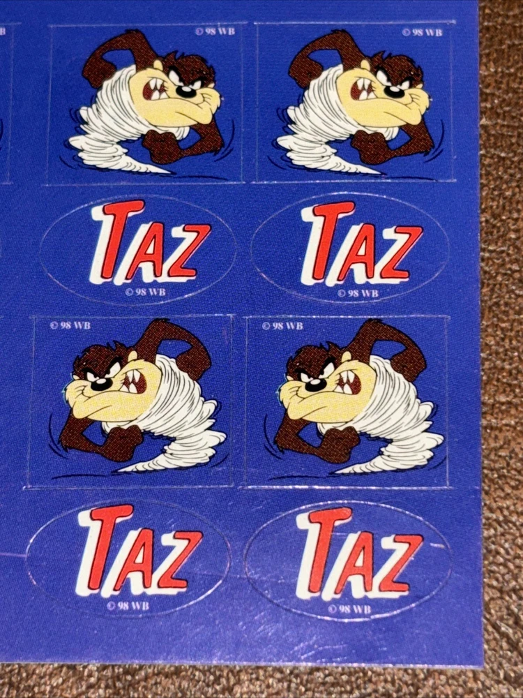 Both sheets of sticker hold no signs of damage or ware. With each sheet having 64 sticker total With 2 sheets having 1 sheet missing 1 (one) sticker. 127 total stickers. Sold as pictured. This vintage Looney Tunes sticker sheet features the beloved character Taz, the Tasmanian Devil. The colorful design and interactive features make it a must-have for any fan of cartoon and TV characters, art, fantasy, animation, and periods and styles. Made in the United States in 1990, this sticker sheet is a rare find for collectors of animation merchandise and other unique pieces. Add it to your collection or use it to decorate your personal space.