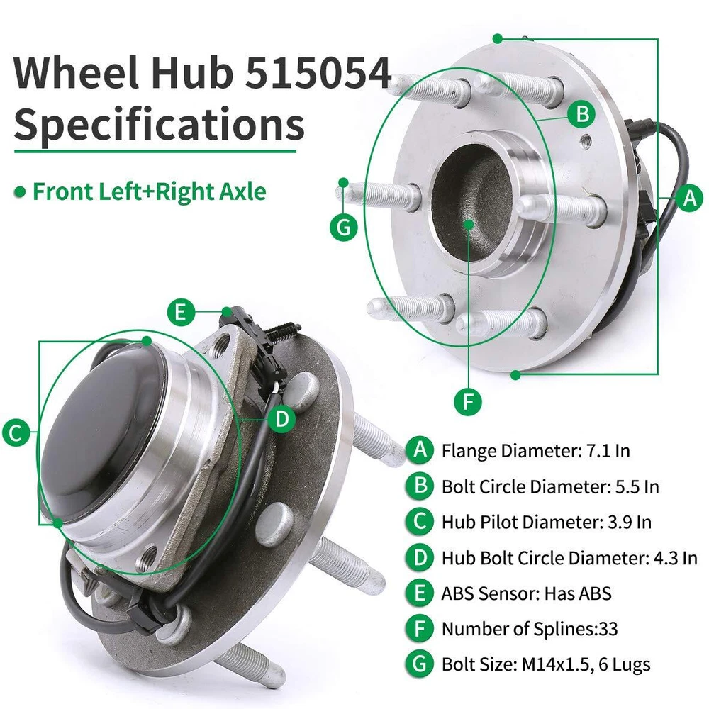 For 2WD 6-Lug Models Only Wheel Bearing Hubs Front Replacement for 2002-2006 Cadillac Escalade - [2002-2006 Chevrolet Avalanche 1500] - 2003-2013 Express 1500 - [2003-2005 Express 2500] - 1999-2004 Silverado 1500 - [2005-2006 Silverado 1500 (16" Inch Wheels)] - 2005-2006 Silverado 1500 (17" Inch Wheels - Except Spring Special Package) - [2001-2003 Silverado 1500 HD] - 2000-2006 Suburban 1500 - [2000-2006 Tahoe] - 2003-2005 Astro Front Wheel Bearing Hubs Replacement for 2003-2013 GMC Savana 1500 - [2003-2005 GMC Safari] - 1999-2004 GMC Sierra 1500 - [2005-2006 Sierra 1500 (16" Inch Wheels)] - 2005-2006 Sierra 1500 (17" Inch Wheels - Except Spring Special Package) - [2001-2003 Sierra 1500 HD] - 2000-2006 Yukon - [2000-2006 Yukon XL 1500] - 2003-2005 GMC Savana 2500 2WD Front Wheel Bearing Hub For Chevy GMC Silverado Sierra 1500 Yukon 1999-2006 2x Front Wheel Bearing Hubs Assembly - Driver and Passenger Side - 515054 Hub Specifications Position: Front Drive: 2WD ABS Type: Sensor Wire Flange Type: 3-Bolt Triangular FITS: MAKE MODEL YEAR RANGE SPECIFIC DETAILS CADILLAC ESCALADE 2002 - 2006 2WD - 6 Lugs CHEVROLET AVALANCHE 1500 2002 - 2006 2WD - 6 Lugs CHEVROLET EXPRESS 2500 2003 - 2005 2WD - 6 Lugs CHEVROLET SILVERADO 1500 1999 - 2004 2WD - 6 Lugs CHEVROLET SILVERADO 1500 2005 - 2006 2WD - 6 Lugs - 16 Inch Wheels CHEVROLET SILVERADO 1500 2005 - 2006 2WD - 6 Lugs - 17 Inch Wheels - Except Spring Special Package CHEVROLET SILVERADO 1500 HD 2001 - 2003 2WD - 6 Lugs CHEVROLET SUBURBAN 1500 2000 - 2006 2WD - 6 Lugs CHEVROLET TAHOE 2000 - 2006 2WD - 6 Lugs CHEVROLET ASTRO 2003 - 2005 2WD - 6 Lugs CHEVROLET EXPRESS 1500 2003 - 2013 2WD - 6 Lugs GMC SAVANA 1500 2003 - 2013 2WD - 6 Lugs GMC SAFARI 2003 - 2005 2WD - 6 Lugs GMC SAVANA 2500 2003 - 2005 2WD - 6 Lugs GMC SIERRA 1500 1999 - 2004 2WD - 6 Lugs GMC SIERRA 1500 2005 - 2006 2WD - 6 Lugs - 16 Inch Wheels GMC SIERRA 1500 2005 - 2006 2WD - 6 Lugs - 17 Inch Wheels - Except Spring Special Package GMC SIERRA 1500 HD 2001 - 2003 2WD - 6 Lugs GMC YUKON 2000 - 2006 2WD - 6 Lugs GMC YUKON XL 1500 2000 - 2006 2WD - 6 Lugs Payment Delivery details Terms of sales About us Contact us Payment 1.We only accept PayPal. PayPal is the only online payment method we accept. Please make sure you have a valid/confirmed PayPal account prior bidding. 2.All Paypal Payments must be Confirmed. Payment must be made within 48hrs of the auction end time. Non-Paying bidders will be reported. 3.When you get your package,maybe you will pay some charges, it's taxes for local customs,not pay to us, and the fees are depends on the customs, all buyer are same. Delivery details 1.Items will be shipped within 2 business days after payment is received. 2.We ship to your eBay address. Please make sure your eBay address is correct. Buyer takes responsibility if eBay address is wrong. 3.Import duties, taxes and charges are not included in the item price or shipping charges. Please check with your country customs office for these additional charges. 4.We shipping using UPS or USPS from our nearest warehouse to you. Tracking numbers will be emailed upon shipment. Terms of sales 1.Please feel free to email us if you have any question. 2.We appreciate you contact us via eBay message when you are not satisfied rather than open case or leave negative feedback directly. We'll try our best to solve the issue. 3.Refund will be issued once we receive your returned items. Buyer is responsible for all return shipping charges. 4.Please contact us for return process before you return the item. 5.All items for exchange or refund must be returned in "as new" condition. About us We are the responsible seller ,always provide high-quality products and best service .If you have any questions, please contact us, and will try our best to help you. Please contact us by eBay Message, and we will reply you within 24 hours. Thank you very much! Contact us We are the professional auto parts manufacturer , and provide line lock, AN hose end fittings , fuel line , fuel filter , fuel regulator , exhaust cutout , exhaust tips , exhaust muffler and so on .The quality of the product to be secured. If you have any questions or any needs , please contact us , and will try our best to help you.