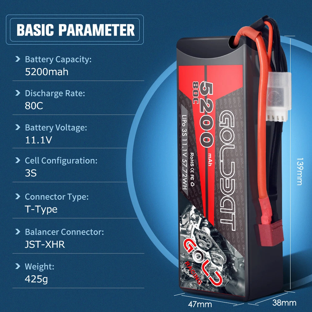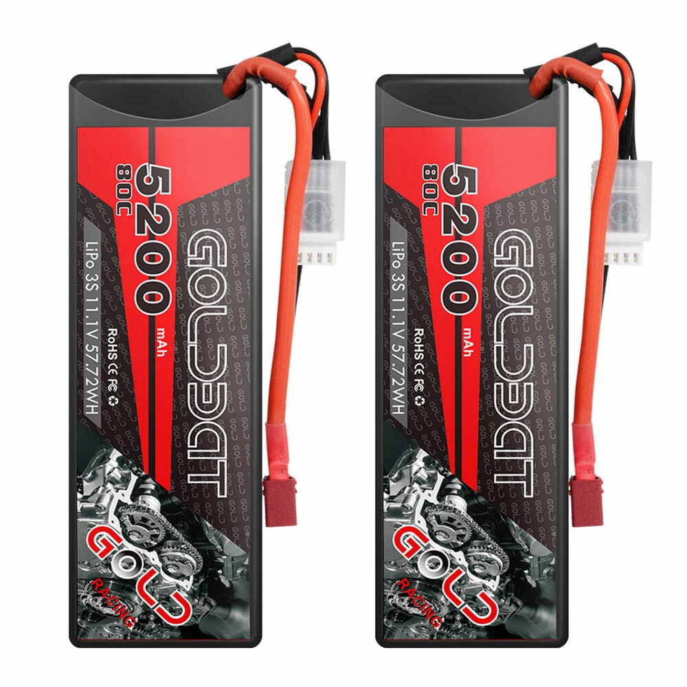 High Performance - Fast charge capability 1C-3C, highly suggest 1C. Long Cycle Life, up to 200Wh/kg energy density Specification - Battery voltage: 11.1V; Configuration: 3S1P; Discharge: 80C; Discharge Connector: Deans Connector Parameter - Dimension: 5.35*1.65*1.18 inches; Weight: 13.1 oz Application - Fits models like 1/8 and 1/10 rc car, Losi, Traxxas Slash, HPI Strada XB 1/10 RTR Electric Buggy, Team Associated, Axial, Duratrax, Jammin, Redcat Racing, Exceed RC, ElectrixRC, Emaxx, Bandit, Rustler version (Only if the voltage, dimension and the plug match, then it will fit). Guarantee - Any issue about the lipo, feel free to contact us via our customer service. Overview : GOLDBAT is one of the top rank battery corporations with deep research and manufacturing on LiPo batteries by the effort of technicians with more than 20 years exquisite battery technology. With safe and steady formula of raw material, smooth and steady discharge curve and rigorous scientific quality control system, GOLDBAT LiPo Batteries provide the punch and on-demand power for reaching the top speed, acceleration and power your rc hobbies. Features: 1. Superior Japan and Korea Lithium Polymer raw materials 2. Automatic stacking technology, better performance 3. Strict matching progress, excellent consistency 4. Up to 200Wh/kg energy density and Long cycle life NOTICE: 1. Please read the instruction carefully before using or charging the battery. 2. To double make sure safety, please have a check first whether the battery surface is alright when you get it and whether the voltage is normal before using. 3. If the new battery won't hold a full charge or loss the charge very quickly in short time, please use Balance Charger to charge and recycle several times first. Use professional lipo battery charger ONLY. Specification: Battery Chemistry: Lithium polymer Configuration: 3S1P Voltage(V): 11.1V Capacity(mAh): 5200mAh Discharge(C): 80C Net Weight: 372g/13.1 oz Dimension: 136 x 42 x 30 mm (0 - 5mm difference) Connector Type: XT60 and Deans Plug Balancer Connector Type: JST-XHR Certificate:CE,ROHS,MSDS,UN38.3 Compatible with: GOLDBAT 5200mah 3S Lipo Battery Fits models like 1/8 and 1/10 scale RC car, Losi, Traxxas Rustler, HPI Strada XB 1/10 RTR Electric Buggy, Team Associated, Axial, Duratrax, Jammin, Redcat Racing, Exceed RC, ElectrixRC, Emaxx, Bandit, Rustler version, etc. (Only if the voltage, dimension and the plug match, then it will fit) Safe Charge Rate The safest charge rate for lipo batteries is 0.5C-1C. Most LiPo batteries need to be charged rather slowly, compared to NiMH or NiCd batteries. NEVER Over-charge or Dis-overcharge lipo battery. NEVER Leave a Battery Charging Unattended! Package Content 2 x GOLDBAT 11.1v 5200mAh 80C RC Lipo battery (XT60 and Deans Plug) 2 x Battery Strap 2 x User Manual