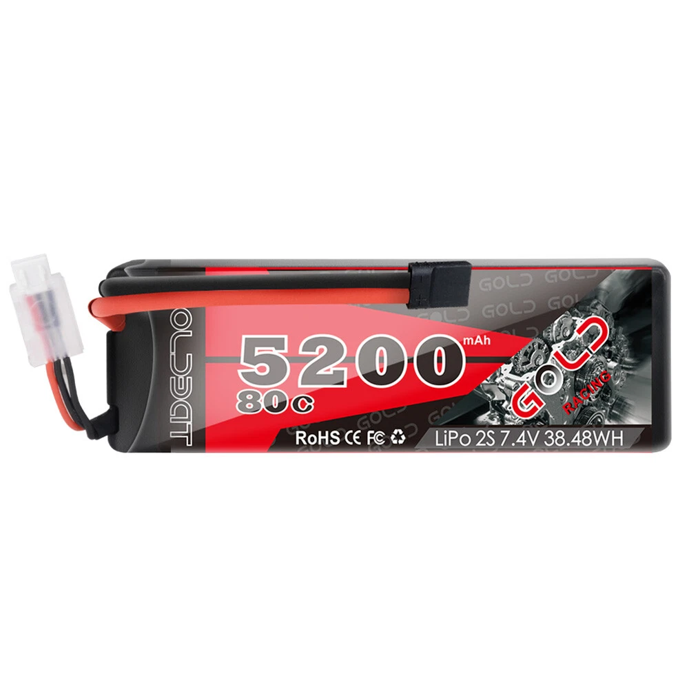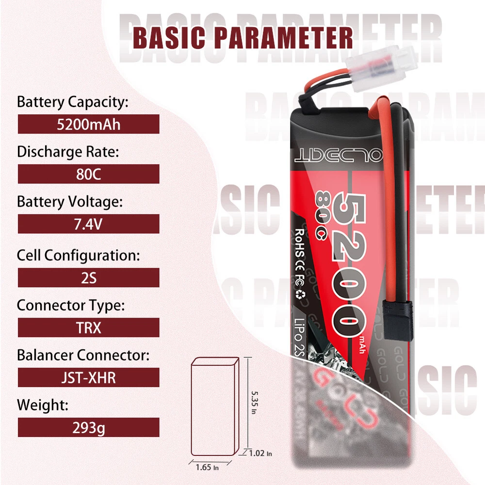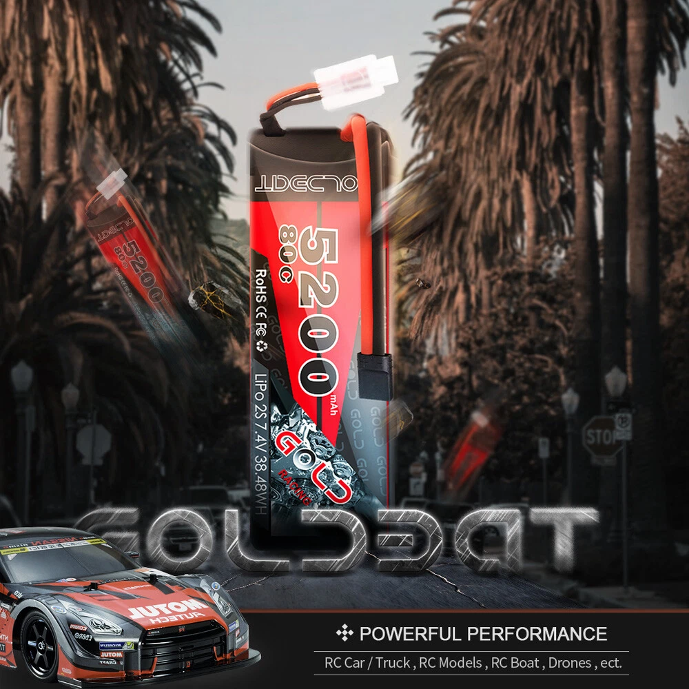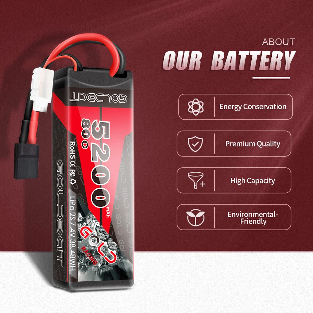 Product Description 2x 80C 5200mAh 7.4V RC 2S Lipo Battery Traxxas Plug Hardcase For Car Truck Buggy Production: We are a leading company in Shenzhen China and specialized in this filed. All of our batteries comply with RoHS and CE quality test standards. GOLDBAT Batteries offer an excellent value by providing factory direct price and grade A cells quality. Product Details: Brand: GOLDBAT Capacity(mAh): 5200mAh Voltage(V): 7.4V Discharge Rate (C): 80C Configuration: 2S1P Net Weight(dev.20g): 295g Length(dev.5mm): 138mm Width(dev.2mm): 47mm Height(dev.2mm): 25mm Connector Type: Traxxas plug Wire Gauge: AWG12# Balancer Connector Type: JST-XHR Capatible with: GOLDBAT 5200mAh 80C 2S1P HardCase 7.4V LiPo Battery is the reliable power for 1/8 and 1/10 rc car hobby such as: Losi, Traxxas Slash, HPI Strada XB 1/10 RTR Electric Buggy, Team Associated, Axial, Tamiya, Duratrax, Jammin', Redcat Racing, Exceed RC ,ElectrixRC,Emaxx, Bandit, Rustler version, Kyosho GP 4WD Racing Truck etc. NOTICE: Please read the instruction carefully before using or charging the battery. Check carefully the battery condition about the battery surface and battery voltage before using or charging. Use professional lipo battery charger ONLY. What in the box: 2x 5200mAh RC battery 2x user manual 2x strap as a gift