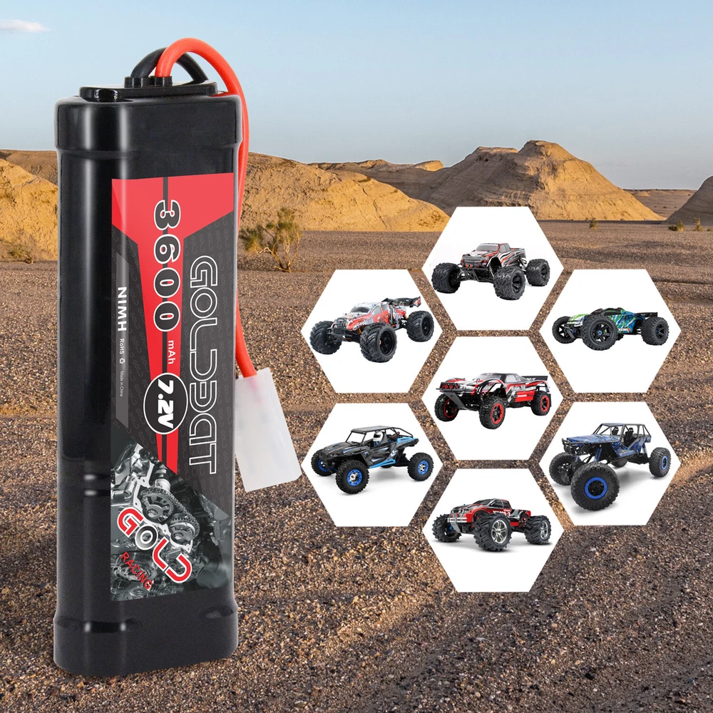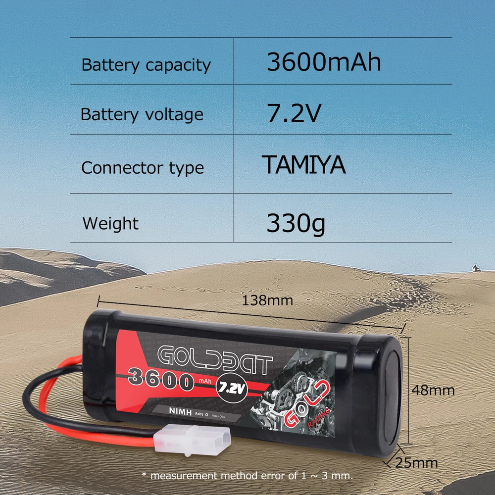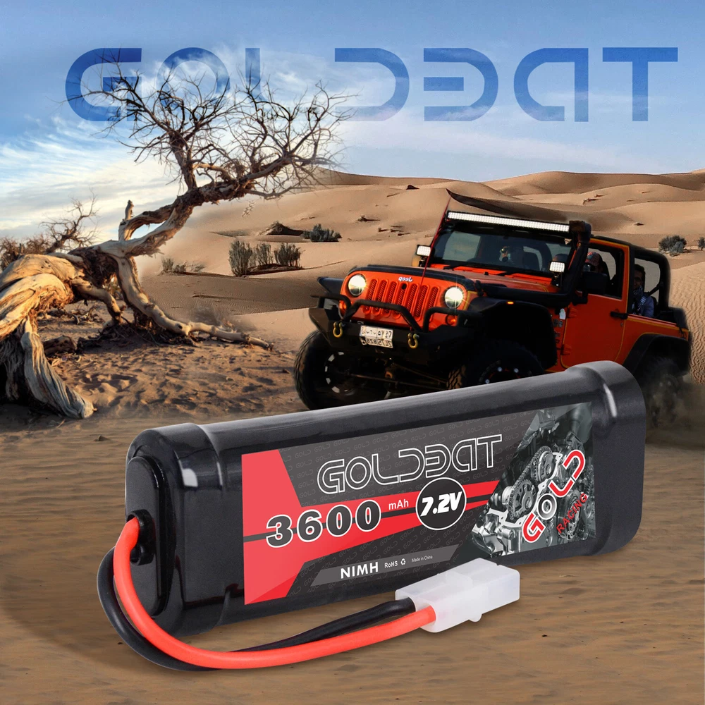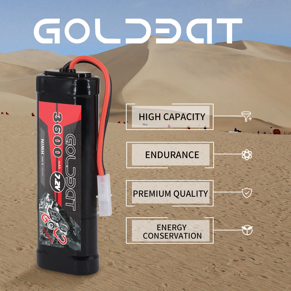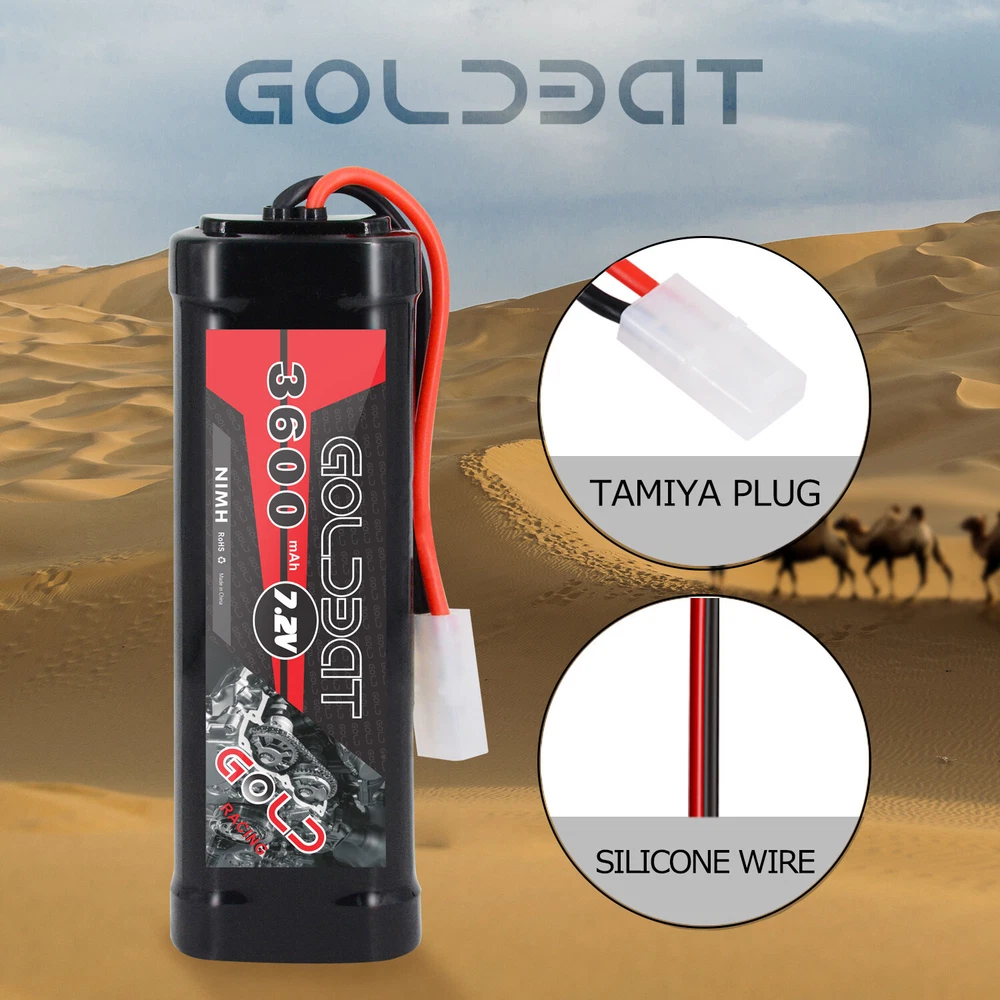 Product infomation: Brand: GOLDBAT Champ Series Chemistry: Nickel Metal Hydride Voltage: 7.2V Capacity:3600mAh Net Weight: 370g /13.05oz Length(dev.5mm): 135mm Width(dev.2mm): 47mm Height(dev.2mm): 24mm Plug: Tamiya Connector Details Material: nickel metal hydride Performance: low resistance welded connections between each cell and thick 14AWG silicone power wires ensure maximum performance High Capacity: 3600mAh capacity and 6 high-tech SC Nickel Metal Hydride cell can provide extended run times. Application: Compatible with mostly popular standard 1/10-scale 7.2V RC Car, RC Truck, RC Tank, RC Buggy like LOSI, Team Associated, HPI, Tamiya, Kyosho brands etc. Models for instance, Axial SCX-10, Tamiya lunchbox, Tamiya Grasshopper 1/10 2WD Dune Buggy, HPI 1/10 E10, Redcat Racing EVEREST-10, etc. What's in the package: 2x Goldbat 3600 7.2V NiMH battery