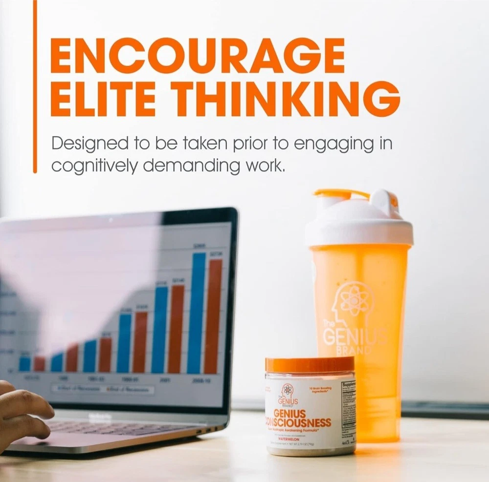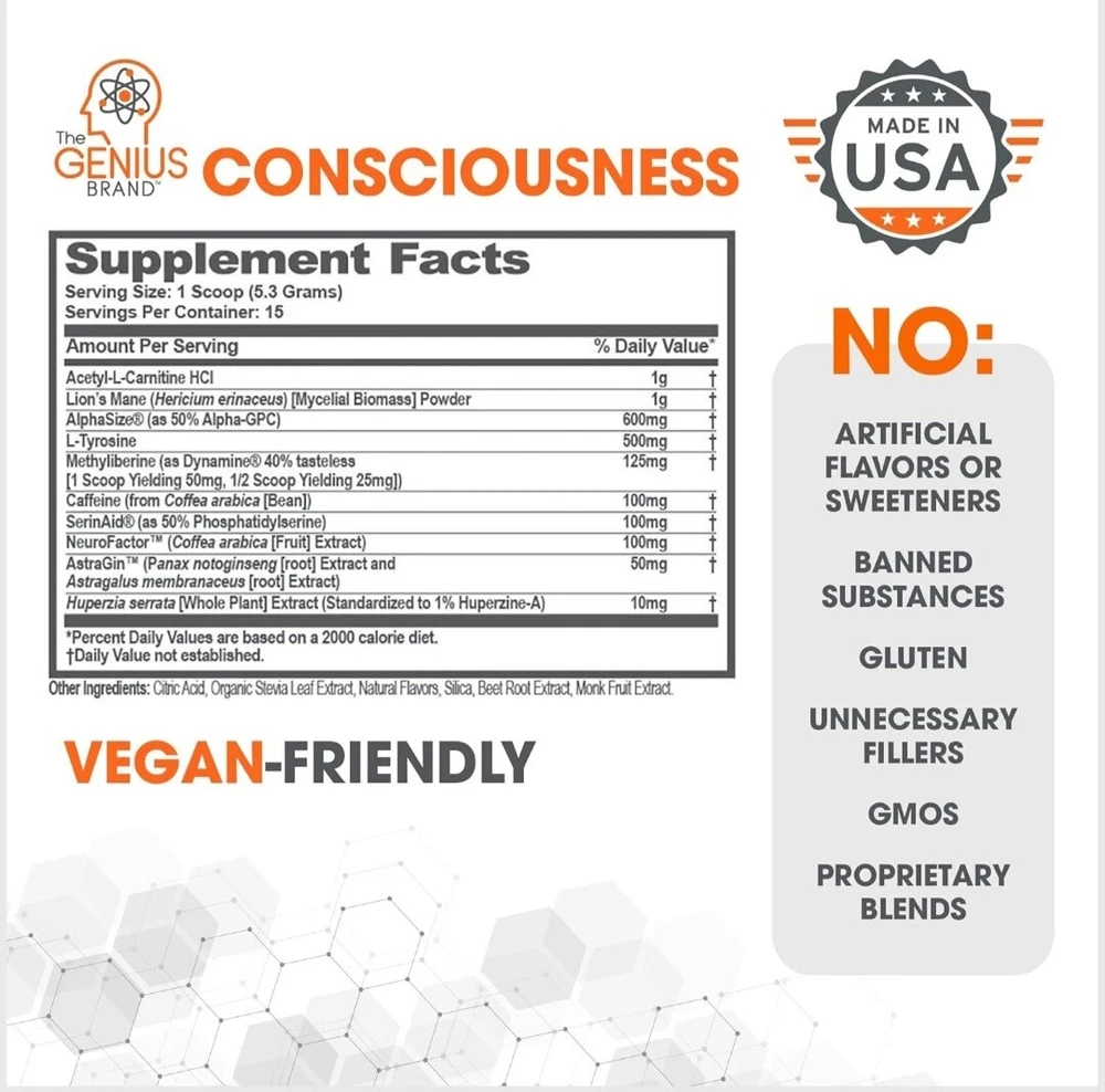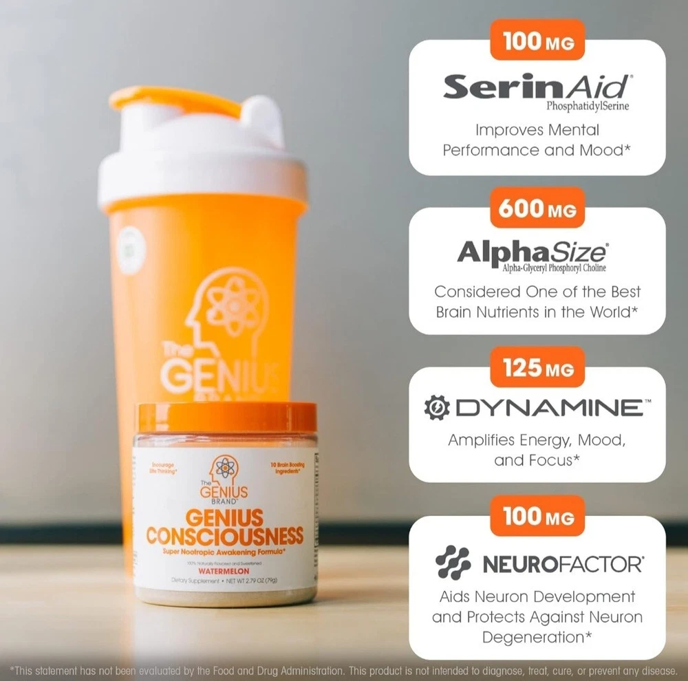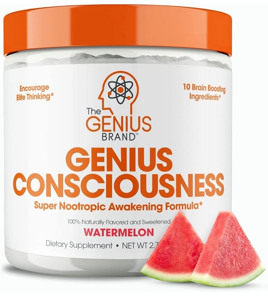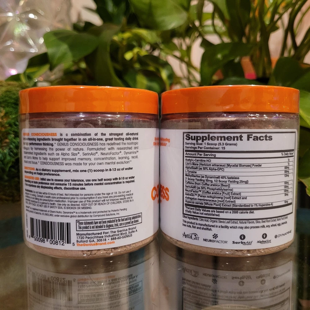 2x Genius Consciousness, Super Nootropic Brain Supplement Powder, Mango - Boost Focus, Cognitive Function, Concentration & Memory Booster - Alpha GPC & Lions Mane Mushroom for Neuro Energy & IQ About this item Awaken Your Mind: Genius Consciousness by The Genius Brand brings together strong, natural brain-enhancing ingredients in one great-tasting daily drink for high-performance thinking.* Formulated to help support improved memory, concentration, learning, recall, mood, and focus.* Mango flavor. 15 scoops per container. Ignite Cognitive Function & Boost Creativity*: Dynamine, NeuroFactor, AlphaSize, and natural caffeine combine to get neurons to work faster and more efficiently, leading to greater working memory, focus, and learning.* SerinAid maintains and improves mental performance, can help improve mood, and can help keep you calm.* This supplement also helps eliminate brain fog and brush away the “haze” blunting your thinking and creativity.* Protects & Preserves Neurons: Lion’s Mane and NeuroFactor stimulate brain-derived neurotrophic factor (BDNF) and nerve growth factor (NGF) to support the creation of new brain cells.* Genius Consciousness protects and preserves cognitive function with a hand-picked selection of nootropics that decrease neuronal excitability and excitotoxicity and combat inflammation.* How to Use: To assess your tolerance when beginning use of this product, take a 1/2 scoop with 6-10 oz of water, depending on taste preference, and consume 15-30 minutes before mental concentration is required. If you’re comfortable with that and want greater energy and more intense focus, consume 1 full scoop with 8-12 oz of water. If you experience any displeasing side effects, discontinue use. Supplement Smarter: Genius Brand supplements are a rejection of backwards industry dogma that misled generations of health and wellness enthusiasts. For us, scientific innovation and natural ingredients come first. Whether you’re a pro athlete, stay-at-home parent, retiree, or anything in between, our products can be of benefit to you. We’re all humans, and we are in this together.