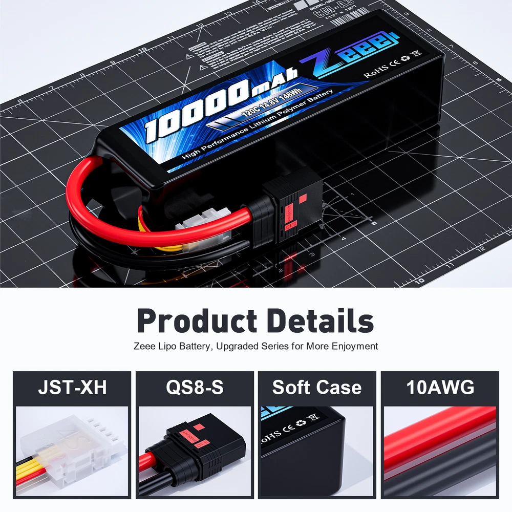 2x Zeee 14.8V 120C 10000mAh 4S Lipo Battery QS8 Plug Soft Pack for Xmaxx RC Car Zeee 4S 10000mAh Lipo Battery 14.8V 120C with QS8 Connector Soft Pack RC Battery Compatible with Xmaxx RC Car Truck Tank Racing Hobby Models (2 Pack) Specifications: Brand: Zeee Voltage: 14.8V Capacity: 10000mAh Discharge Rate(C): 120C Configuration: 4S1P Connector Type: QS8 Connector Balancer Connector Type: JST-XH Length: 169mm/6.65inch Width: 48mm/1.89inch Height: 42mm/1.65inch Battery Weight(dev.10g): 713g/25.15oz/pc 【10000mAh RC Battery Application】 - Zeee 10000mAh 4S Lipo battery with QS8 connector, compatible with X-Maxx, RC car, rc tank, truck, slash, RC models. (Only if the voltage, dimension and the plug match, then it will fit). 【Safety Warning】 - 1. Users must read safety manual before use of the battery; 2. You must use Lithium Polymer(LiPo) specific charger only; 3. The suggested charge rate is 0.5 - 1C; 4. Never charge the battery unattended. Package included: 2x Zeee 14.8V 4S 120C 10000mAh lipo battery Soft Case with QS8 Plug 1x User manual 1x Wrapped box About Us Payment Shipment Return and Warranty Feedback About Us Zeee Power established at 2011, which has grown to the leading manufacturer of RC lithium battery in China. Over the past years, we boast of more than 300 trained workers, 36 experienced engineers and technicians in RC lithium battery R&D solution to ensure that we provide high quality products and first-class services to our global customers. All of Zeee RC LiPo Batteries are designed with safe and steady formula of raw material, smooth and steady discharge curve and rigorous scientific quality control system, in order to ensure longevity and reliability. Our batteries are manufactured using the superior ‘stacking’ method, which provide you with reliable capacity and consistent power. Payment 1.Your can choose from any of the following payment methods: Visa Mastercard Discover American Express PayPal PayPal Credit Apple Pay (through the eBay app and mobile website only) Google Pay (through the eBay app, mobile website and desktop) 2.Payment should be Complete within 5 days after the end of the Auction. Non-paying winners will be filed for closing auction. Shipment 1. All items will be shipped to buyer's eBay address. Before you pay, please make sure your address on eBay matches the address you would like us to ship to. 2. All items will be shipped within 1 business day upon receipt of payment. 3. Items will be sent from USA directly, it usually takes approximately 4-7 business days to receive order. Return and Warranty 1. Our items come with 180-Day warranty. 2. Our warranty does not extended to any products that are physically damaged or that are not under normal operating conditions as a result of misuse or improper installation on the buyer/user's part. 3. This product comes with 30-Day Money Back Guarantee. 4. We stand behind every product we sell. If you're not pleased with your purchase, we'll be happy to make an exchange or refund. Feedback 1. We value your feedbacks, please leave your feedback and comment. 2. We will automatically leave positive feedback to every buyer who completed the transaction and left positive feedback to us. 3. Your better comments will be an encouragement for us to offer the better quality and the better service in future. 4. If you have any problems, pls contact us, we will try our best to help you to solve it.