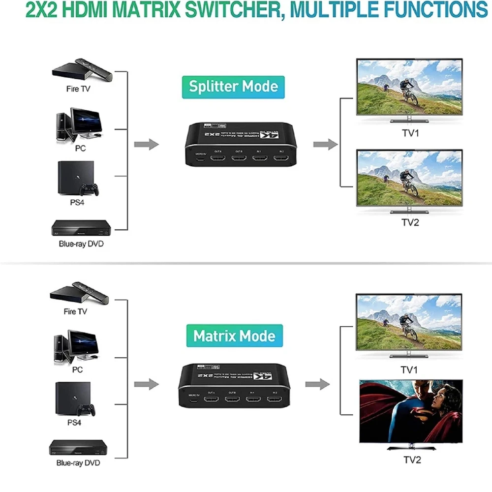 This 2x2 HDMI matrix switcher is a game-changer for my home entertainment setup! It effortlessly switches between my PS4 and laptop, delivering crisp 4K@60Hz video and immersive audio. The plug-and-play design makes setup a breeze, and the compact size fits perfectly behind my TV. I love how it supports 3D and multiple audio formats—perfect for movie nights. No lag, no signal loss, just flawless performance. Highly recommend for anyone needing a reliable HDMI switcher!