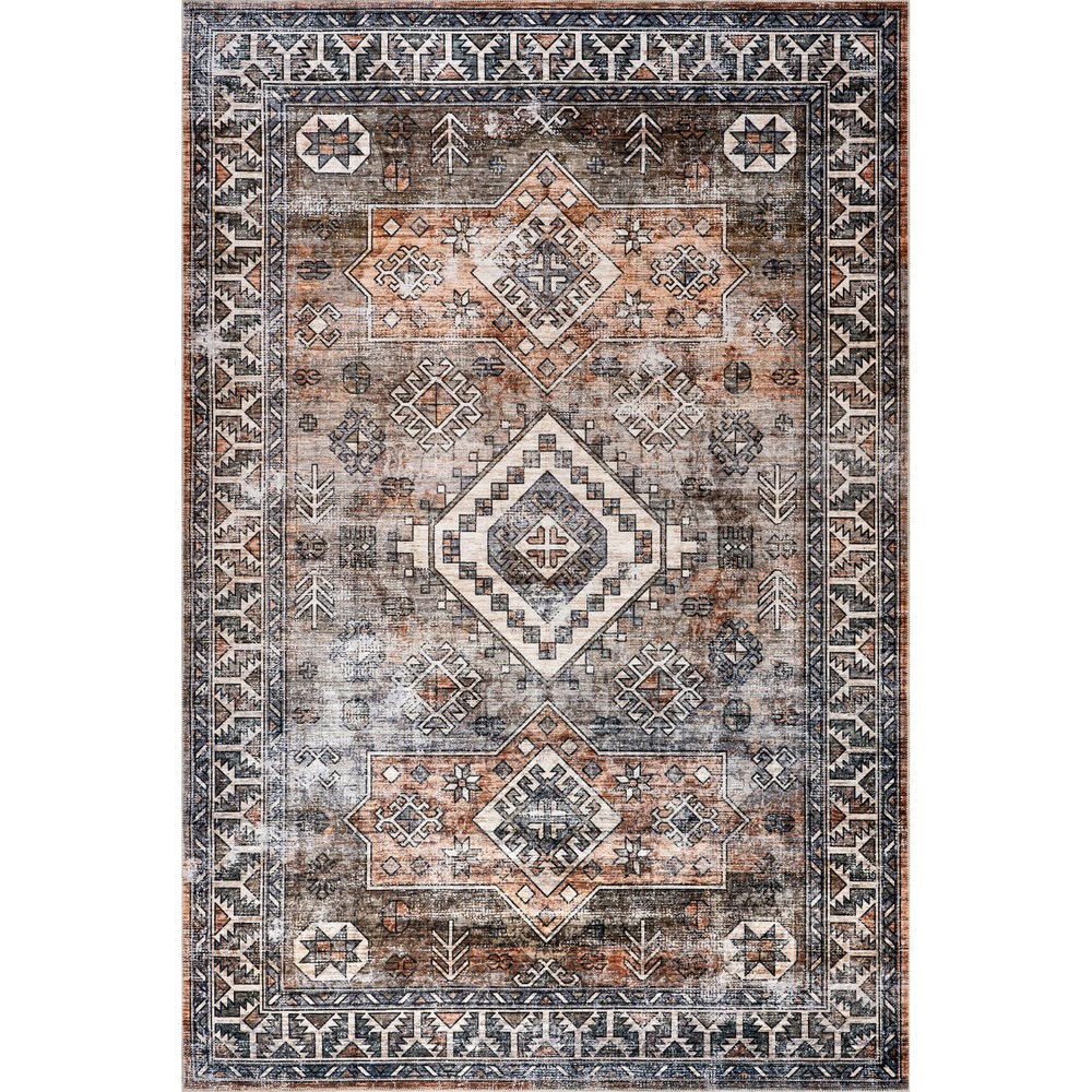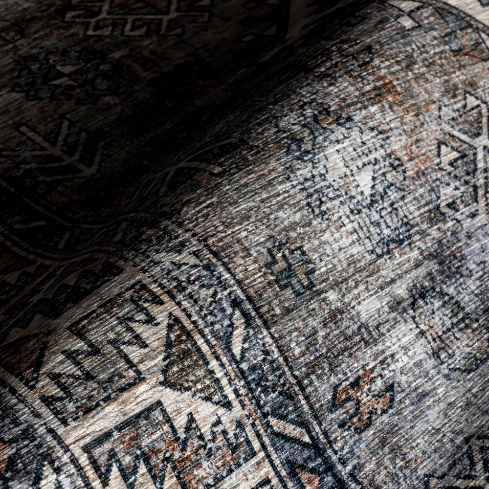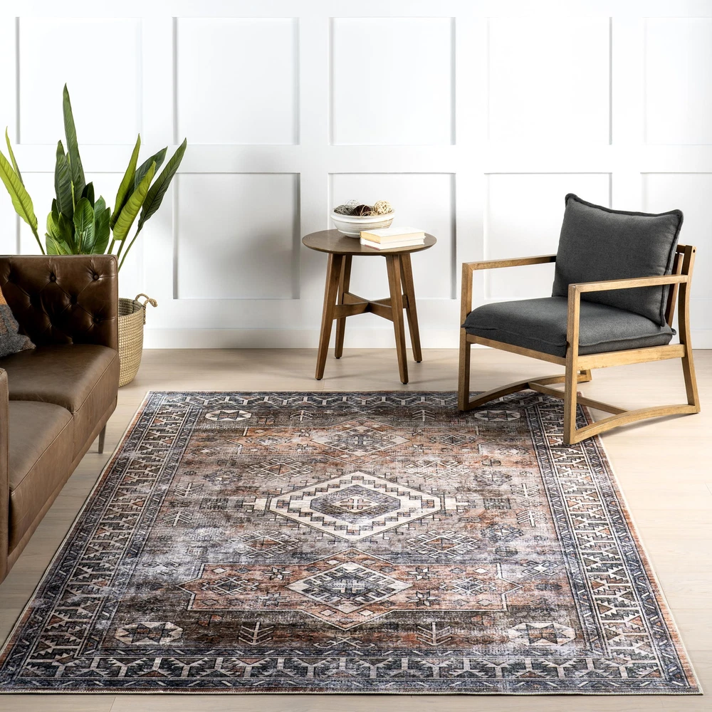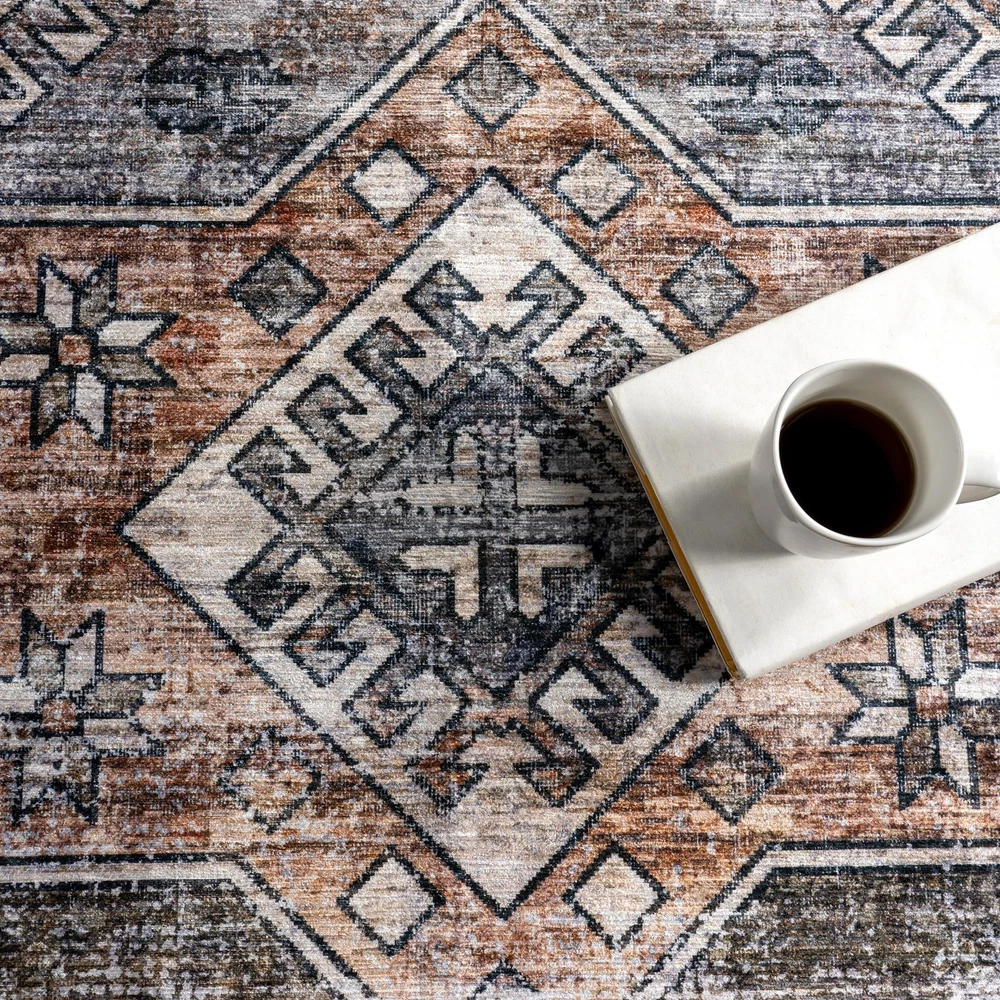 Introducing the solution for a stylish, low-maintenance home—’s SplashGuard Machine Washable Collection. Engineered with cutting-edge technology, this rug is designed for those who demand both elegance and practicality in their living spaces. Whether you’re dealing with the chaos of a busy household, pets, or frequent gatherings, this collection is here to provide peace of mind without compromising on style. At the heart of these rugs is its advanced performance fabric and surface coating that repels water and stains. When liquid hits the surface, it beads up instead of being absorbed and can be wiped away with ease. Whether it’s spilled juice, or even pet accidents, this spill proof rug provides an effortless cleanup experience. A quick swipe with a cloth or paper towel, and the spill is gone, leaving your rug as pristine as before. Even in the event of a more stubborn spill, the rug’s machine washable design allows for deep cleaning whenever necessary. Simply toss it in the washing machine, and it will emerge looking fresh and new, ready to continue serving as the stylish centerpiece of your room. But the Splash Guard Collection isn’t just about practicality—it’s also a statement of style. Available in a range of colors, if you’re looking for a grey and white rug to a green rug, we have you covered. These rugs can compliment any decor, from modern minimalist to traditional vintage elegance. Whether you are looking to add a pop of color with a living room rug, a touch of warmth with a bedroom rug, an inviting front door rug, or even a runner for your kitchen, these area rugs enhance any space. The SplashGuard Collection effortlessly combines stylish designs with convenience, offering a chic and modern solution that’s easy to clean and perfect for any busy home. Style meets Spill-Resistant Fabric: Designed with effortless maintenance in mind, the SplashGuard Collection features cutting-edge performance fabric that repels spills and stains. Liquids bead up on the surface rather than being absorbed, allowing for quick and easy clean-up with just a wipe! This collection features a wide array of designs, from vintage to southwestern, boho, abstract, and modern geometric. Machine Washable for Easy Care: Maintaining this rug is a breeze with regular vacuuming and spot cleaning to preserve its beauty. For tougher stains, just toss your rug in the washing machine on a gentle cycle with cold water. We recommend line drying or using the air-only drying cycle without heat. Designed for Every Room: This area rug is kid and pet-friendly, making it ideal for any space in your home that needs an elevated touch. It ensures lasting style in your living room, bedroom, dining room, kitchen, bathroom, home office, dorm room, as a hall runner or entrance rug. Sleek and Functional Pile Height: The low pile of this area rug brings a sleek, sophisticated touch while being easy to clean and maintain. Designed to be placed conveniently under furniture and doorways or as an indoor entrance rug, this is the perfect high traffic rug for your home. Stain-Resistant Material: Our machine washable rugs are crafted from synthetic materials that are stain-resistant, lightweight, and easy to clean. The stain-resistant properties ensure that the rug maintains its vibrant colors and patterns, even after enduring the demands of everyday use. If your rug is located in an area that receives direct sunlight, regularly rotate your rug to maintain its appearance. Durable Design with Non-Slip Backing: This rug’s power-loomed design is made to endure everyday wear and tear, ensuring long-lasting durability. The integrated non-slip backing keeps the rug securely in place while the reinforced, quality-stitched edges enhance its resilience. For added comfort, pair it with one of our rug pads for an extra cushioned feel underfoot.