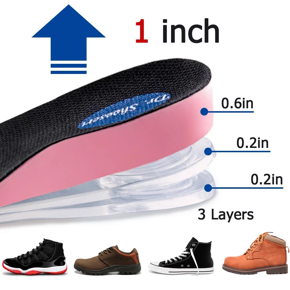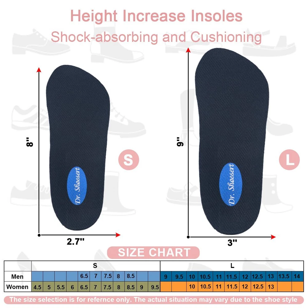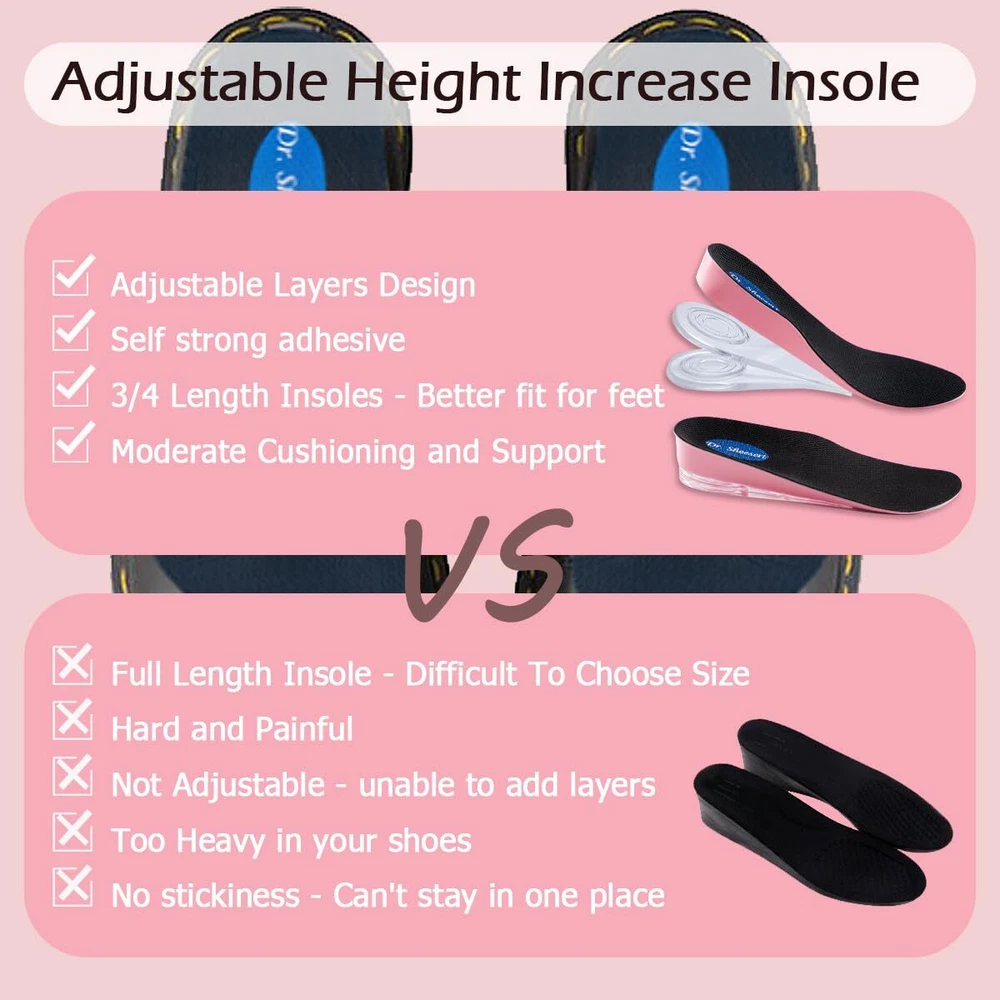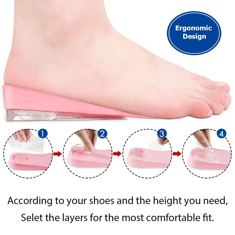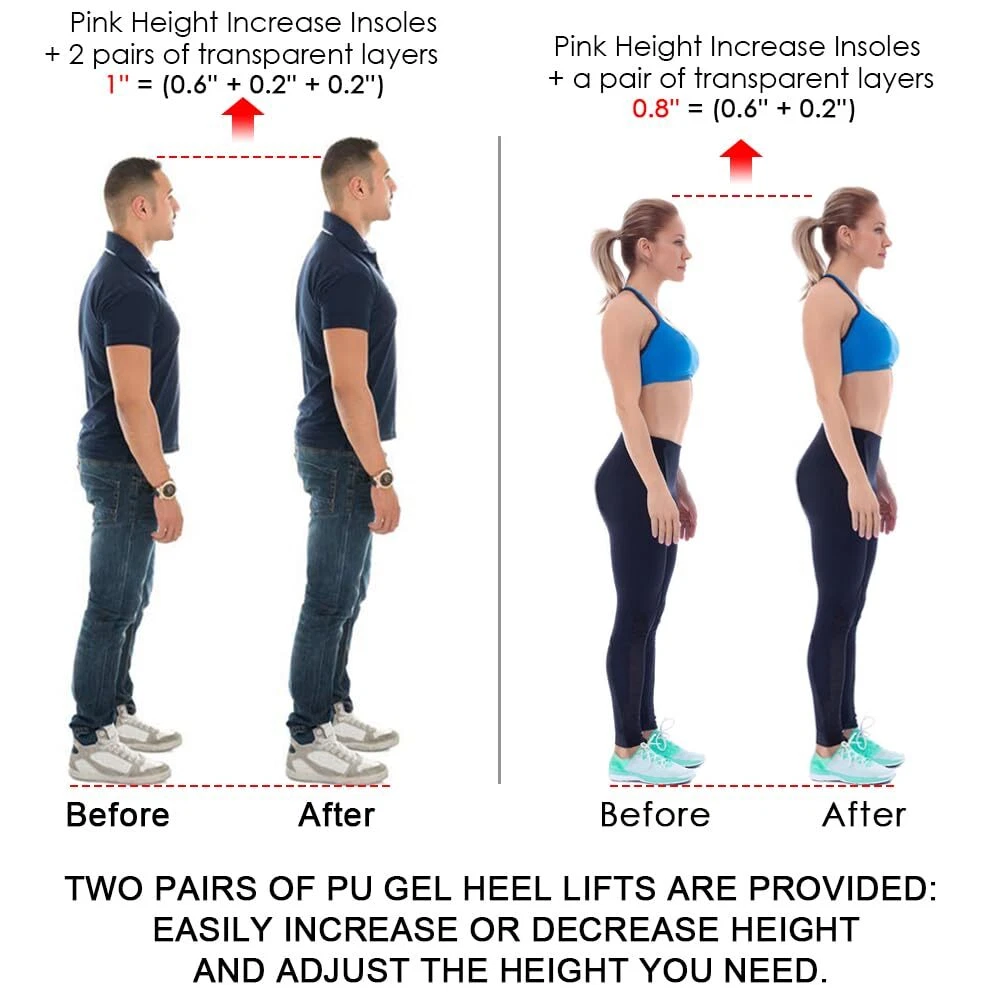 Shock-absorbing and Cushioning - 3/4 Length height increase inserts give you confidence every step of the way, strong self-adhesive that stays firmly in place for lasting comfort. Adjustable Height Increase Insole - Helps you improve your balance if you're having trouble with leg length discrepancy. Easily increase or decrease height and adjust the height you need. Lightweight Shoe Lift Inserts - Made of soft and durable PU Foam Material with super breathable fabric top layer and anti sweat for sweaty foot. Supplied with 2 pairs of strong self-adhesive PU GEL layers and you can adjust the height suitable for you by adding layers. Heel Pain Prevention and Relif: All-day comfort wear for long periods of standing or walking, Ideals for Heel spurs, Sports Injuries, Achilles tendonitis and Plantar Fasciitis. Suitable for most kinds of shoes, best for work shoes, sneakers, boots, Martin boots and loafers. Upgrade Heel Lift Design - Invisible in your shoe and no one will know you're wearing height incresae insoles, you can grow up the height you need in an instant! Risk Free: If you are not completely satisfied with your purchase, please feel free to us with your order ID and tell us how would you like us to help, our friendly staff will be pleased to assist you with any questions or concerns. Attention: Please don't return your used products to warehouse, we don't want our next customer to buy the products you have used. Thank you very much for your time.