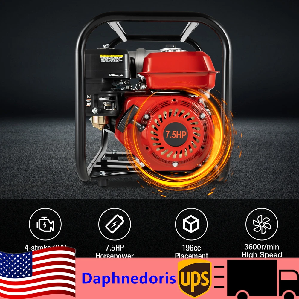 3" 7.5HP High Pressure Irrigation Pump Gas Water Transfer Pump Semi Trash Pump Description Are you still worried about watering your farm too slowly? This 7.5HP irrigation water pump will help you get your watering done very quickly and well. It has an aluminum pump body for greater durability and long service life. The extra power and large flow rate will allow you to work more efficiently. Key Features Great Durability: It is made of high-quality aluminum and ferroalloy, which is very tough and durable and has a long service life. High Efficiency: It adopts a powerful four-stroke OHV engine, which can generate more power. The 7.5hp, 196cc engine has a high speed of 3600r/min, achieving a 2118.88ft³ hourly flow rate, 26.25ft rated self suction height, and 91.86ft lift. With its help, you can efficiently complete various irrigation and drainage tasks in a shorter amount of time. Long-term Endurance & Energy Saving: The 0.95gal fuel tank allows you to work for a longer time at once, saving you time and effort. A high-quality carburetor allows for better fuel combustion, ensuring a 395g/Kw.h of fuel rate, and reducing fuel consumption. Good Heat Dissipation: The forced air-cooling system and the dense cooling holes in the casing dissipate heat quickly and promptly, which not only prolongs the engine's service life but also ensures that the engine will not stall even after a long period of operation. High Stability: The sturdy frame, quadrilateral base, and enlarged anti-slip pads provide greater stability and effective vibration reduction, ensuring better performance in harsh environments. User-friendly Design: The design of manual start, one-click shutdown, and controllable speed simplifies various operations while ensuring safety, making it easier and more reassuring for you to use. Protective Package: To prevent the product from being damaged and bumped during transportation, we packed it with bubble bags, plastic bags and carton to protect your products to the maximum extent possible. Customer Service: Communication is the best way to solve problems. If you have any problems, please feel free to contact us. We will reply and solve the problem for you as soon as possible. Details Enlarged Inlet and Outlet: Its inlet and outlet have been enlarged to a diameter of 2.99 inches, which allows for a larger flow rate for a wider range of watering and suction. Air & Water Filters: The filters can effectively isolate impurities in water and air, prevent blockage of water pipes and water pumps, and improve working efficiency. Quality Silencer: It can effectively alleviate the noise generated during the operation process, control the noise within an acceptable range, and provide a comfortable working environment. Snap-on Fuel Tank Cap : It makes the fuel tank seal better, reduces evaporation, and saves fuel. Application It is suitable for agricultural irrigation, treatment of industrial wastewater, tunnel drainage, road cleaning, mountain water transport, and more. Initiation Step Switch to "ON". Connect the inlet hose and filter. Close the damper and open the throttle. Start the machine. Open the damper. Adjust the speed control seat. Specifications Model: WP-30X Material: Aluminum, Ferroalloy Color: Red Engine Type: Single-cylinder, 4-stroke, Air-cooled Starting Mode: Manual Engine Max Power: 7.5hp Gasoline Engine Model: GX200 Fuel Type: Gasoline Fuel Tank Capacity: 3.6L/0.95Gal Machine Oil Capacity: 0.6L/0.16Gal Oil Consumption Rate: ≤395g/Kw.h Displacement: 196cc Bore Stroke: 68*54mm/2.56*2.13inch Compression Ratio: 8.5:1 Rational Vel: 3600r/min Intake and Outlet Diameter: 7.6cm/3inch Pump Lift: 28m/91.86ft Pump Output: 60m³/h/2118.88ft³/h Rated Self-suction Height: 8m/26.25ft Product Size: 49.5x36.7x42.5cm/19.49*14.45*16.73inch Package Size: 51.5*43.3*39.8cm/20.28*17.05*15.67inch Net Weight: 20.85kg/45.97lbs Gross Weight: 21.95kg/48.39lbs Package Included 1* Water Pump 1* Inlet Pipe Connection 1* Outlet Pipe Connection 1* Sleeve Rod 1* Filter 4* Foot Pads 1* English Manual Other Accessories for Assembly Notes Please allow the slight color difference caused by the shooting light and 1-3cm error due to manual measurement, and make sure you do not mind before you order. Payment Delivery details Terms of sales About us Contact us Payment We accept ebay payment 。 Fees such as import duties, taxes are not included in the item price or shipping costs. These charges are the buyer's responsibility. Delivery details Shipping: 2-9 working days to: USA Terms of sales We maintain high standards of excellence and strive for hundred percent customer satisfaction. Feedback is very important to us. We hope that you contact us immediately before you give neutral or negative feedback, so that we can address your concerns. It is impossible to address issues if we do not know about them! About us Your satis faction is our ultimate goal. We work hard to earn your trust and future business. Our certified technicians have tested each item before shipping. The unit comes with 1 year limited warranty on all manufacturing defects. a) If you receive a defective item, you may return it or ask for a discount. Please contact us within 14 days after you receive the package. b) What you returned must be intact and in its original packaging as re? u. Customer is responsible for shipping costs of the returned item. c) We will cover the cost of shipping back t with the shipping rate indicated in the registration page. We will send you a new unit or refund the full payment you paid. Thank you. Contact us Business Hour Business Hour: Monday To Friday: 8:30 AM to 5:00 PM (Beijing China time) Due to time zones, our reply to your questions may not be immediately. But within above working time, we will reply your email within 24 hours. If it's non-workdays, please kindly be patient and wait till Monday. Please contact us with ebay message. Please feel free to contact us if you have any questions. Monday To Friday: 8:30 AM to 5