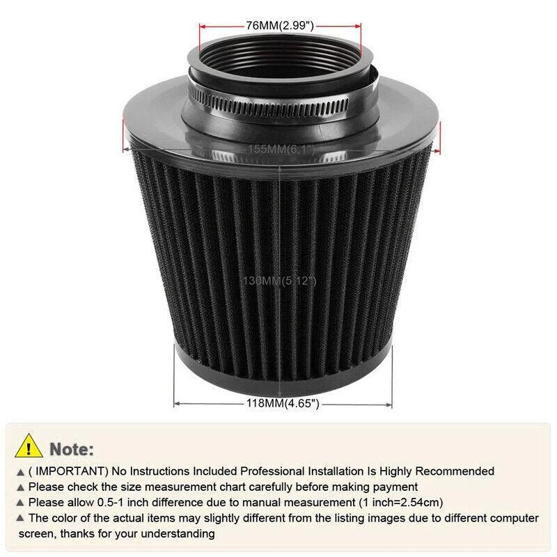 Description FEATURE 100% Brand new Material: Filter Intake Pipe is made of excellent non-woven fabric and aluminum. It is more corrosion resistant, rustproof and ultra durable. Accessories: Comes with 1 pc strong metal adjustable Hose Clamp Clip Install: Easy to install, the size could be adjusted with the screwdriver (no modifications required and support to teach you how to install) Fitment: fits for most cars, trucks and off-road Motorcycle SPECIFICATION Type: Universal Air Filter,Dust boot assembly Material: Aluminum, non-woven Fabric and ABS Plastic Color: Black Size: Show as the picture Packing list: 1PC with 1 pcs strong metal adjustable Hose Clamp Clip eBay Cross Border Trade powered by ChannelEffect