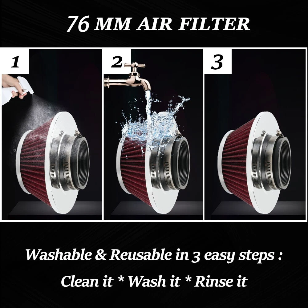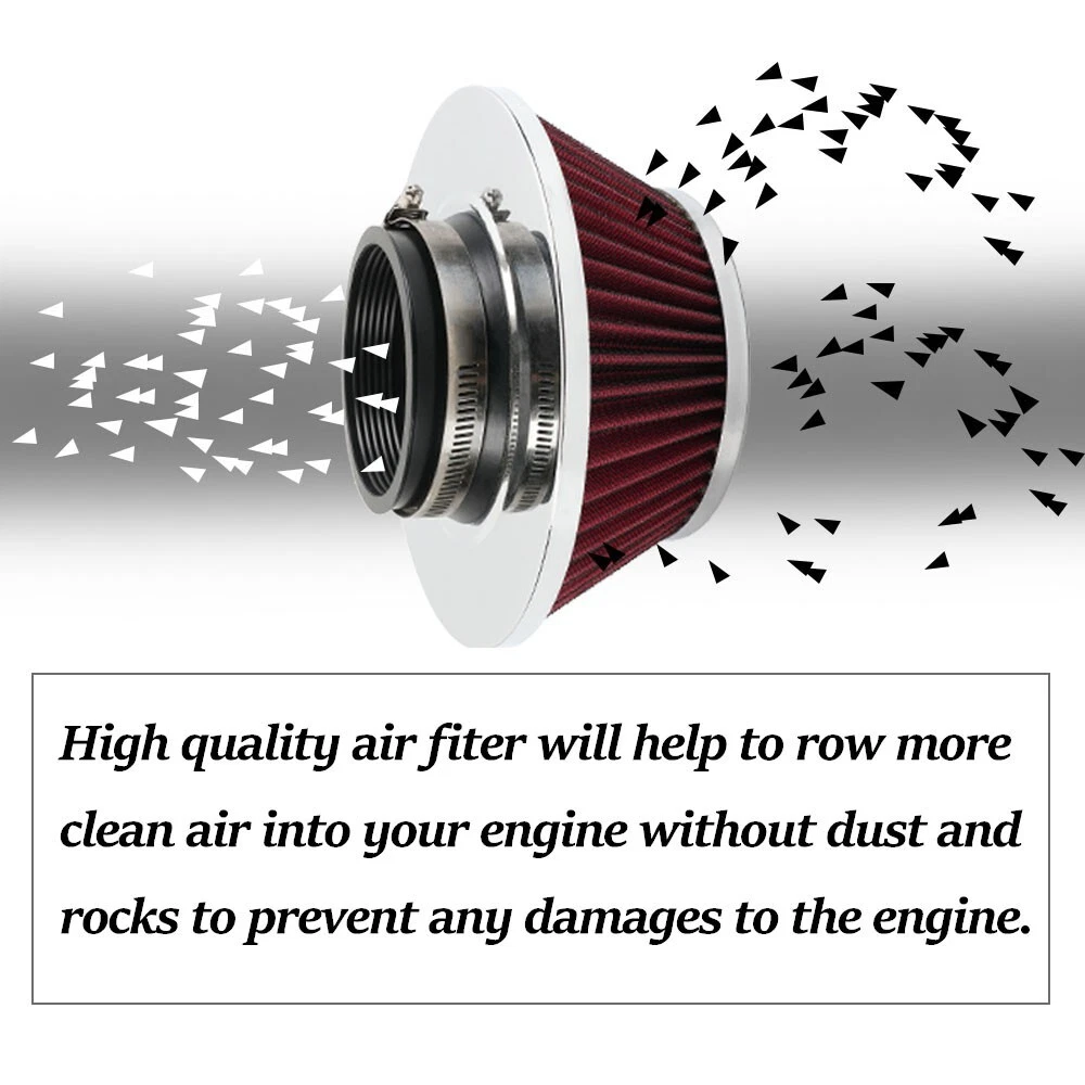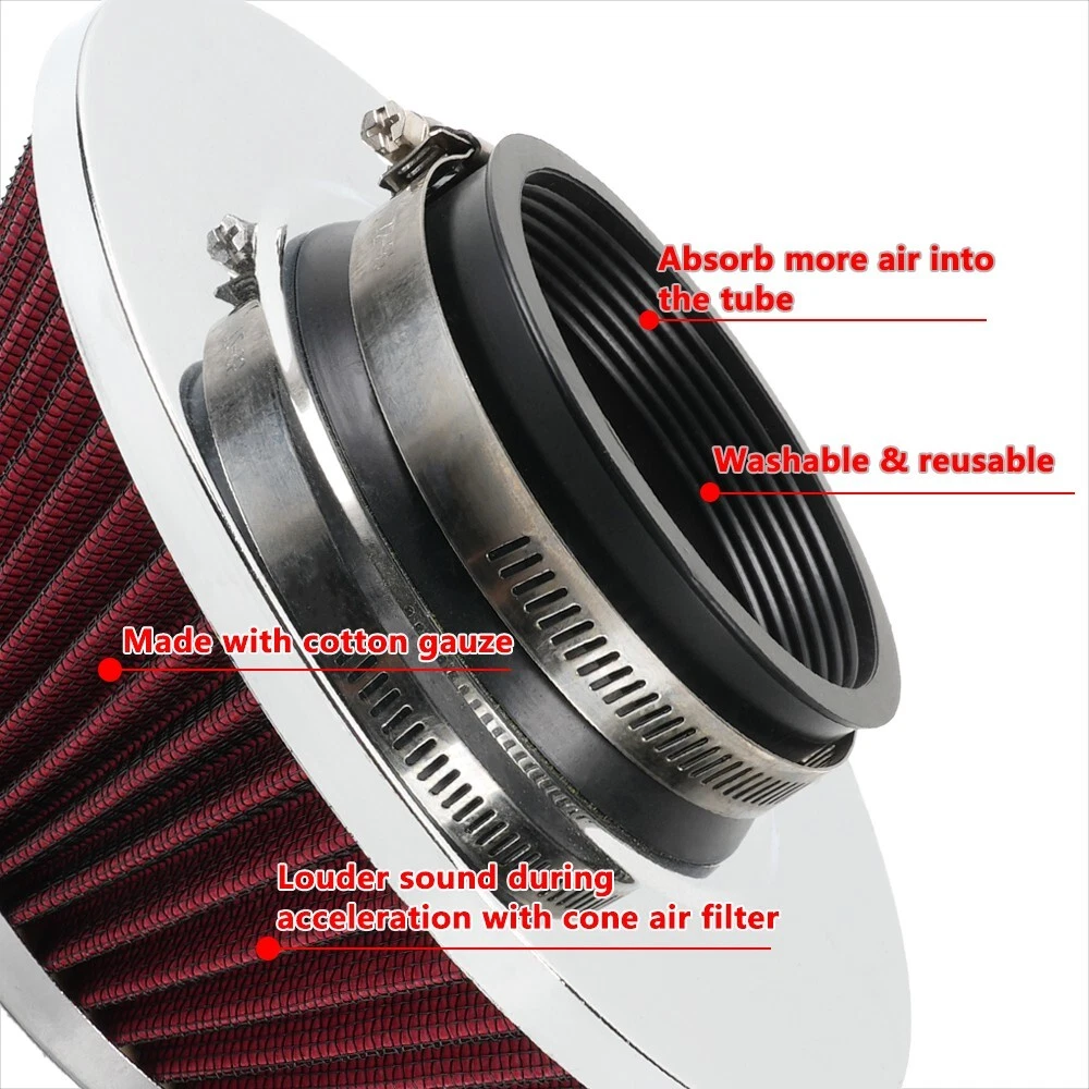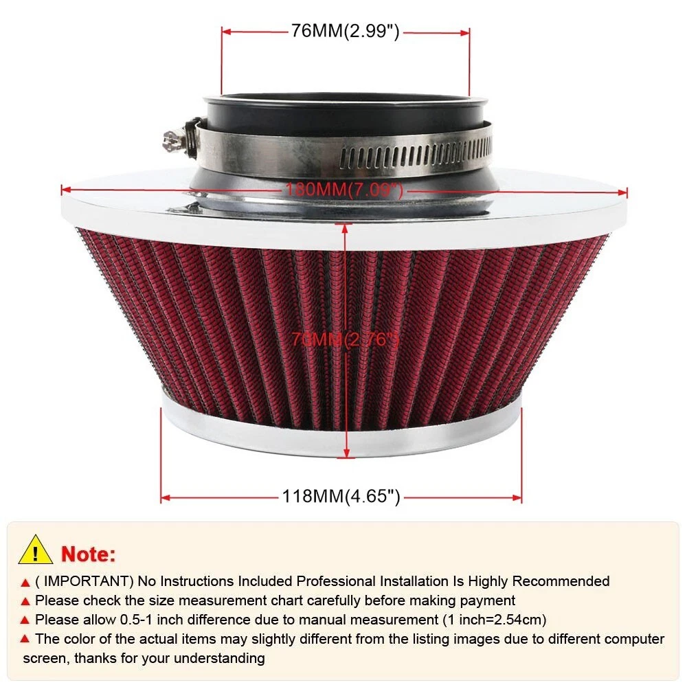 3" 76mm High Flow Dry Air Filter Cold Air Intake Red Air Filter Mushroom Head SPECIFICATIONS: Type: Air Filter Material: Plastic +Metal + Filter Paper FEATURES: 100% Brand New and Never Used or Installed Increase horsepower, torque and improve the gas mileage It universally fit for any 76mm / 3inch airintake hose. The high flow air filter help engine to draw more cooler air resulting in better throttle response & higher explosive horsepower output. It comes with a washable and reusable cone air filterand a clamp. Filter consisted of 2 layers to double the filtration efficiency. [How often should air intake filter be replaced] It should be inspected once a year or every 15,000 to 30,000 miles, but this can vary based on the car and driving environment. If you often drive through dusty terrain or on unpaved roads,you may need to change it more frequently. PACKAGE INCLUDE: 1x Air Filter 1 x Clamp All accessories in the picture are included NOTE: 1. Please allow 0.5-1 inch difference due to manual measurement. (1 inch=2.54cm) 2. Please check the size measurement and the picture carefully before making payment. 3. Due to the difference between different monitors, the picture may not reflect theactual color of the item. Please understand, Thank you. SHIPPING INFORMATION PAYMENT WARRANTY ABOUT US CONTACT US SHIPPING INFORMATION We will only ship this item to buyers by Normal Mail, please confirm your address is correct, and if you want to change the delivery address, just feel free to contact us when you purchase. Usually, we will ship the orders out and upload the tracking number within 1-2 business days(Monday to Saturday from 8:30am-5:30pm) after you complete the payment. PAYMENT We will only accept eBay payment. Please pay using eBay payment ONLY within 7 days from the date of transaction be made. WARRANTY Please inspect your order upon receipt.No damage claims will be honored after 14 days of delivery. All item we sold come with 90 days defective warranty from the date. ABOUT US We are a powerful factory producing auto parts,and we have a professional sales and after-sales team that can provide you with excellent products and services. CONTACT US For any reason you want to contact us,We aim at satisfying every visitor, no matter what kind of situation you meet with, we will be right here to serve you. Please contact our team. If you are happy with the transaction with us, leaving us an ALL-5-STAR positive feedback would be greatly appreciated. Have a good shopping.