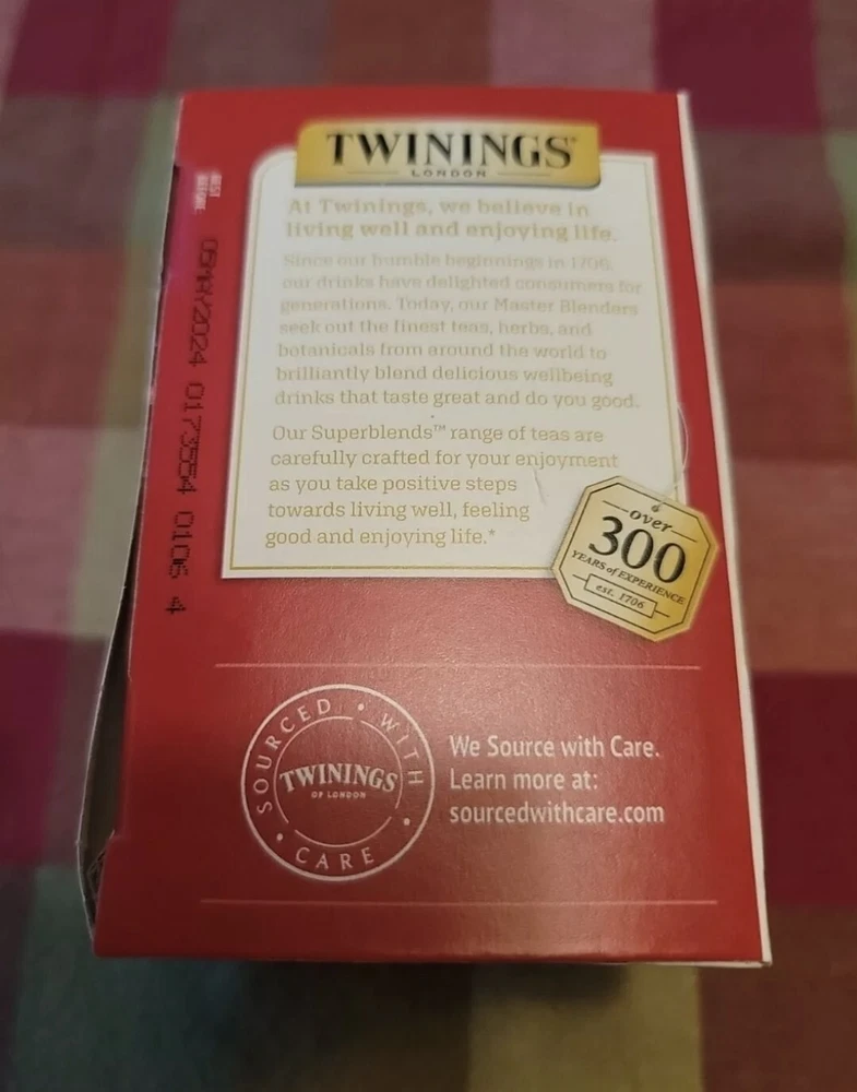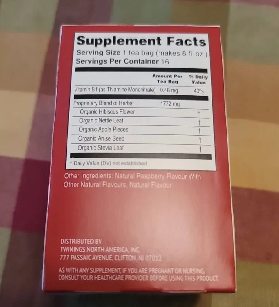 Enjoy a delicious and healthy beverage with Twinings Superblends Hearted + Raspberry Flavored Hibiscus Herbal Tea. This product is perfect for those who want to relax and rejuvenate their body without consuming caffeine. The tea bags are packaged in a box containing 48 bags, with each bag providing a serving size of 1 cup. The product is designed to cater to American regional cuisine and is manufactured in the United States. This herbal tea is perfect for anyone looking for a flavorful and aromatic drink that is caffeine-free and kosher. The raspberry hibiscus flavor is a unique blend that provides a tasty and refreshing experience. With the product having an expiration date of May 2024, customers can enjoy this delicious tea for an extended period. Get your hands on this pantry item and indulge in a guilt-free beverage that is perfect for any time of the day.
