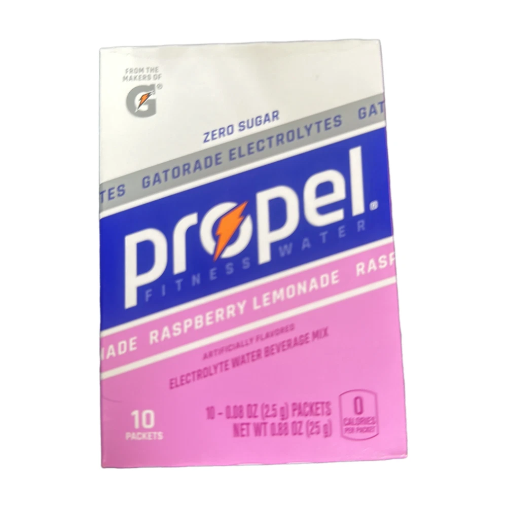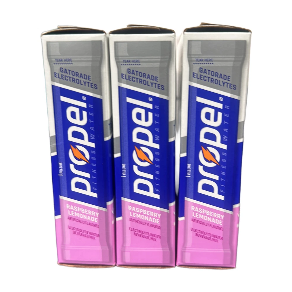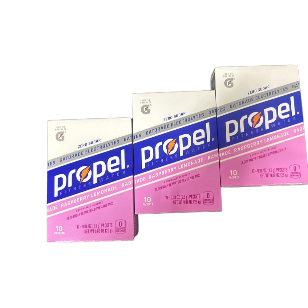 The product is a set of 3 boxes of Propel Drink Mix in Raspberry Lemonade flavor, offering 30 servings of sugar-free sports drink mix. Each serving provides Gatorade Electrolytes, essential vitamins B3, B5, B6, B12, and antioxidants Vitamin C & E. With zero calories per serving, this powdered mix is ideal for replenishing electrolytes during physical activities. The drink mix is designed to be added to water for a refreshing and hydrating beverage option.