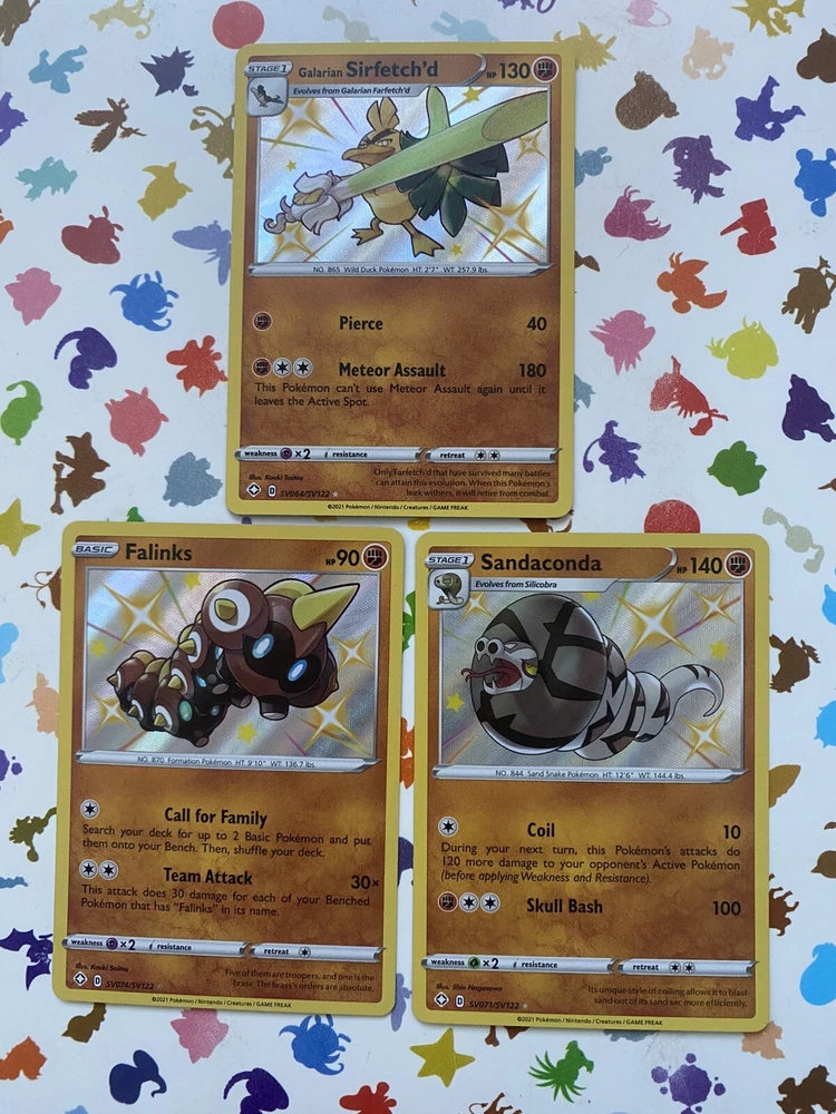 Youโll get 3 Pokemon card. GALARIAN SIRFETCHโD. sv064/sv122.- FALINKS. sv074/sv122.-SANDACONDA. sv071/sv122. All in excellent conditionsโฆ๐plus some free stuffโฆ๐๐ free shipping on all graded cards and combine shipping for multiple ordersโฆ๐๐ค๐ป๐๐ค๐ป