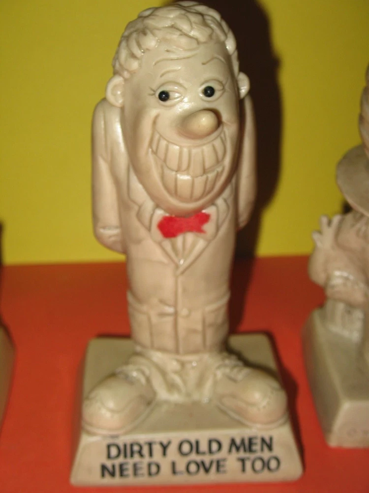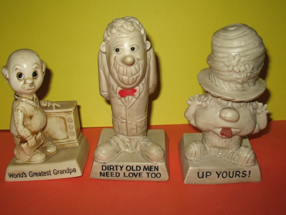 Up for sale are "3" RUSS BERRIE FIGURES - They're all Vintage ! - World's Greatest Grandpa - Dirty Old Men Need Love Too - Up Yours! - Very Good Condition ! - They measure about 7 inches tall. - Comes from a Smoke Free Home - Please pay within 3 days of auction end - Ships within USA ONLY ! - Not Hawaii, APO, PR, Alaska or Virgin Islands. - We can discount shipping if more than 1 item is purchased. - Shipping fees include Handling Charges. - Thanks for looking :-)